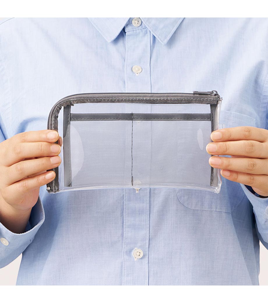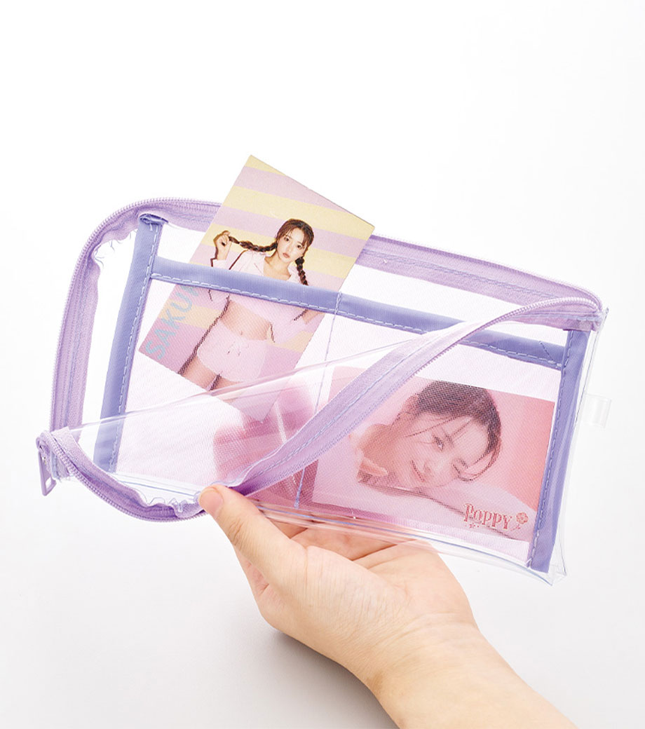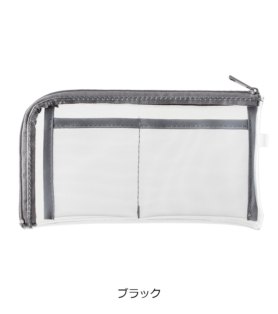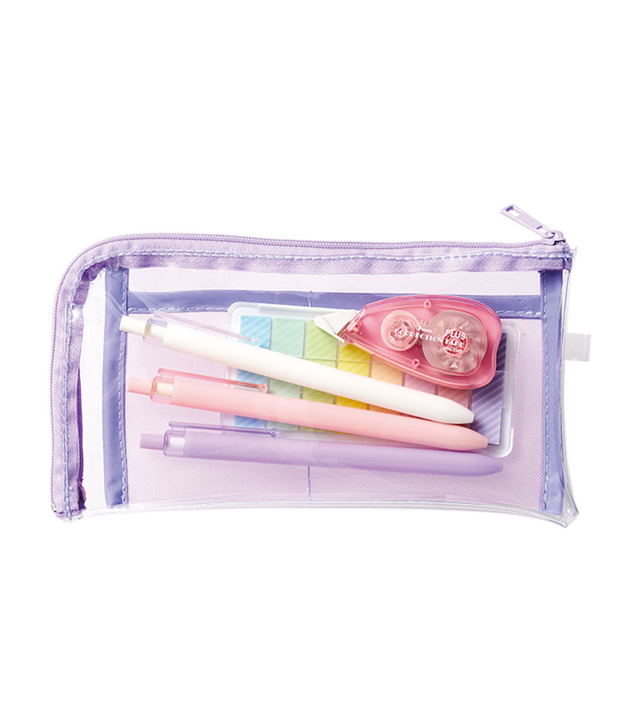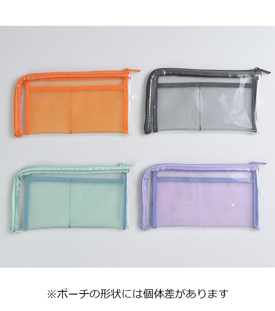 カラーファスナーがアクセントのスクエア型ビニールポーチ。四つ折りしたミニタオルが収まるサイズ感です。中身が一目でわかるのでアクセサリーや日用品の仕分けポーチに大人気。水に強いPVC素材で、アメニティ入れとしても使えます。