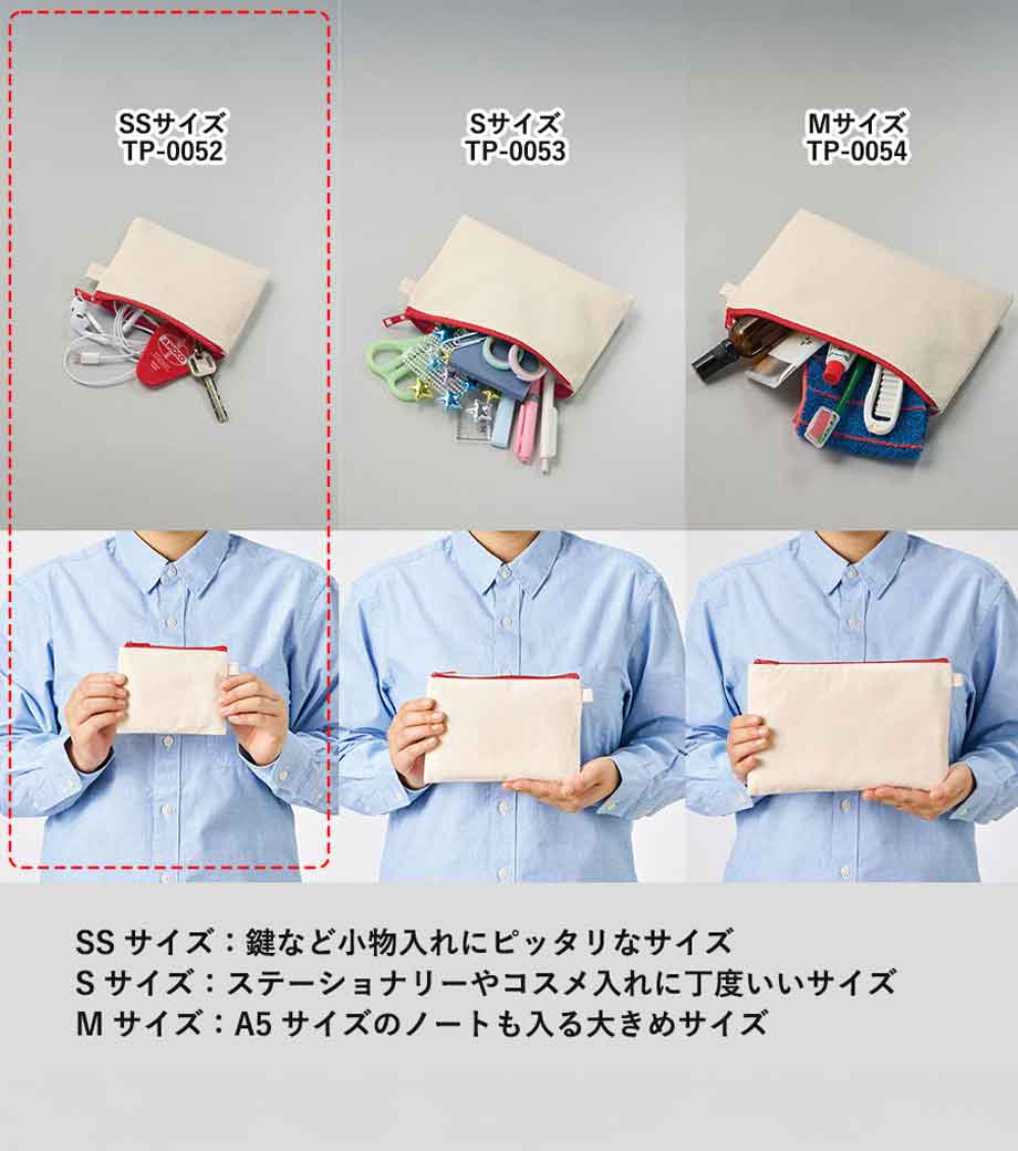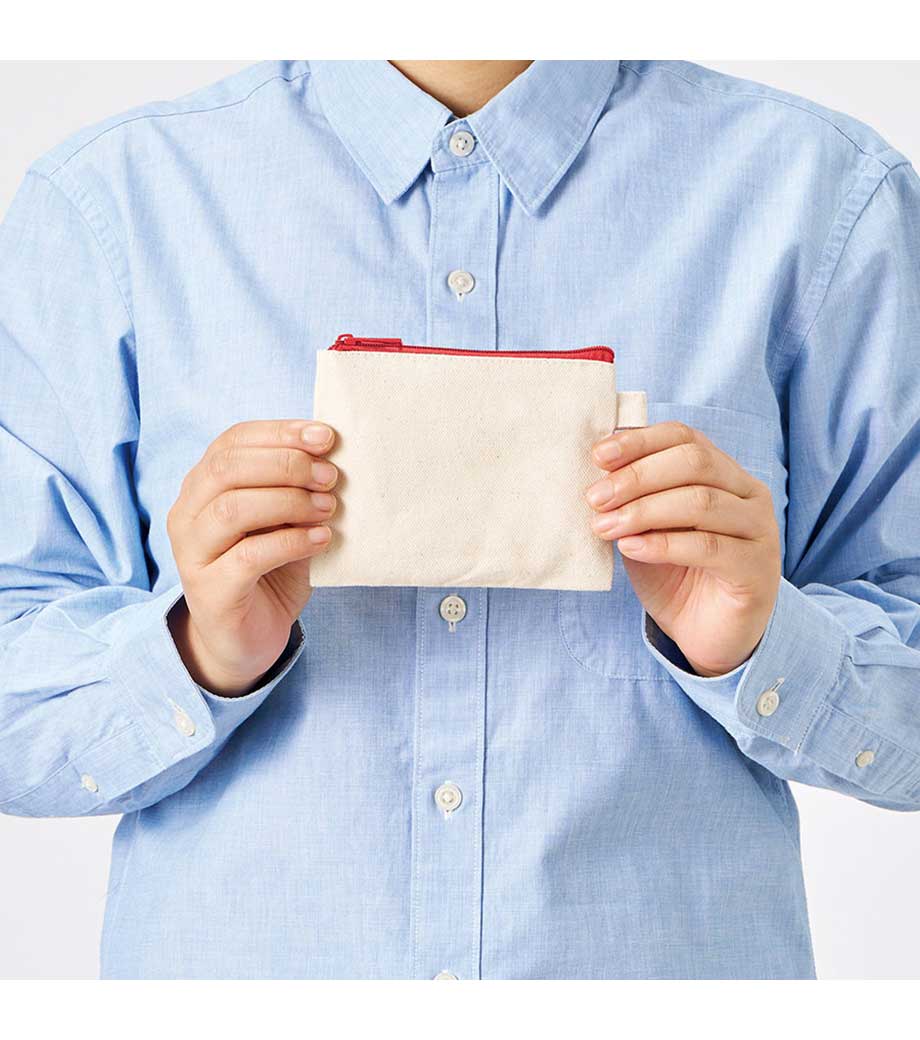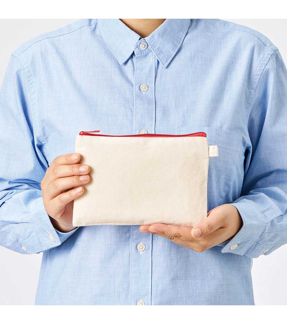 「キャンバスフラットポーチ(S)」はバッグに入れてもかさばらない薄型なので、メイクアップ用品やアクセサリー、ステーショナリーなどの持ち運びに便利。