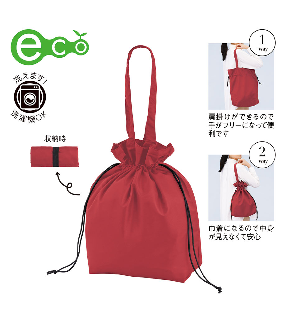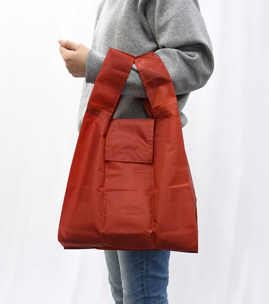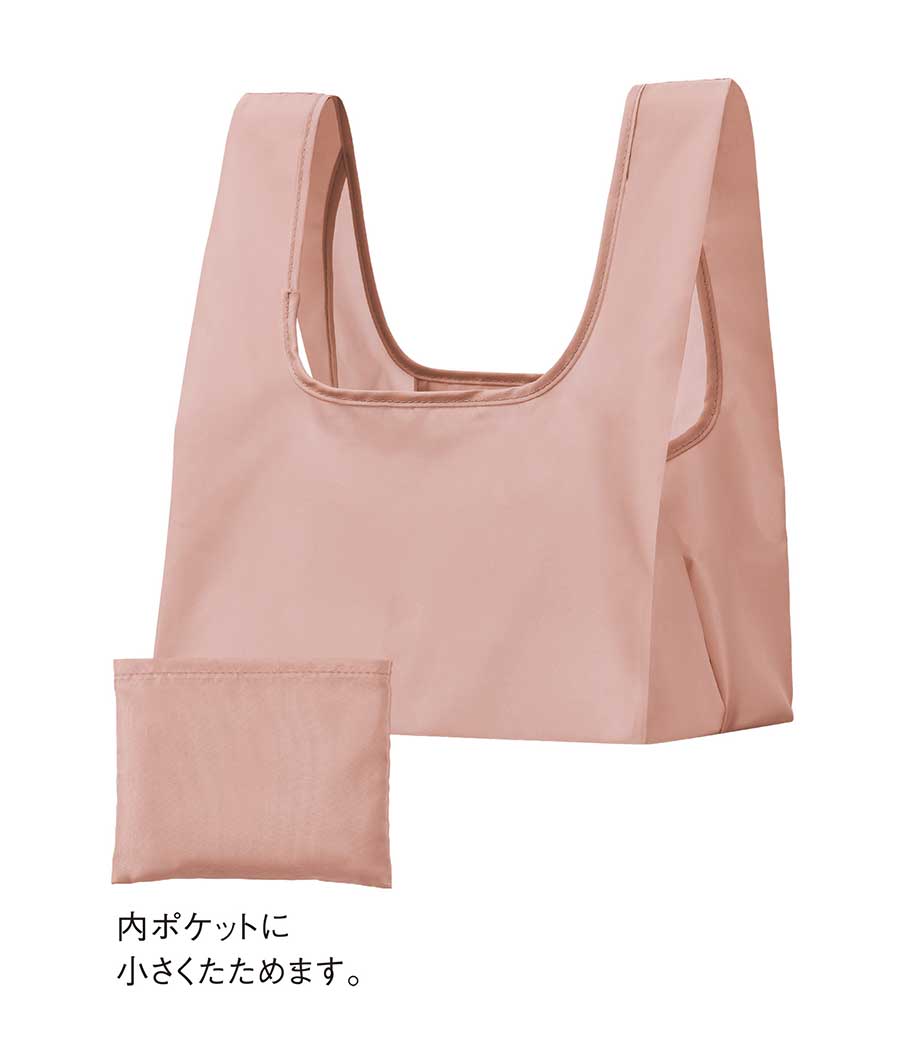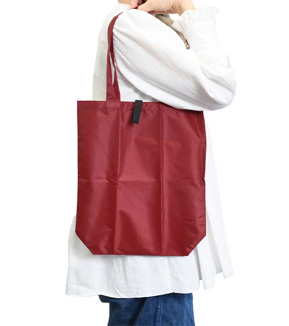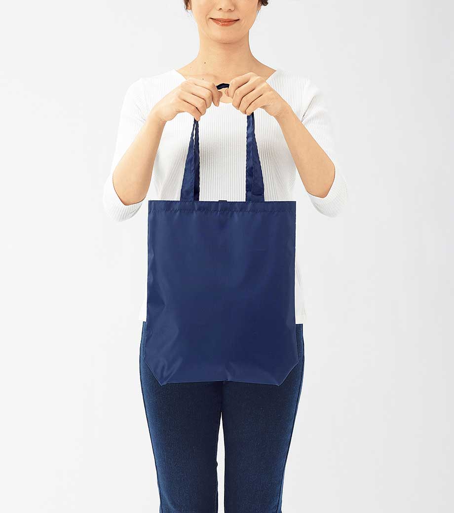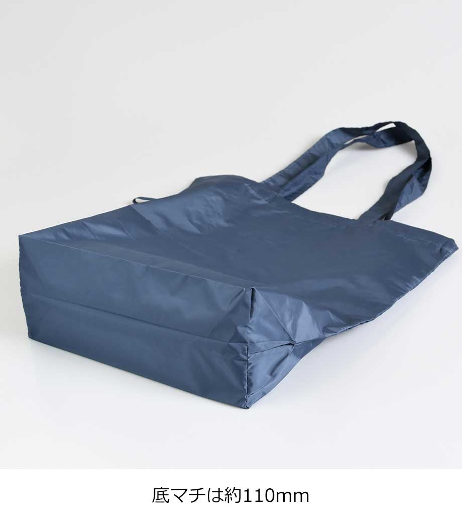 上品な光沢感とさらっとした手触りが特徴のポリエステルエコバッグ。薄手・軽量素材で手の平サイズに折り畳みが可能です。持ち手は肩掛けができる長さ。A4サイズなら縦にも横にも入る大きさです。船底タイプの底マチ付きで厚みがある荷物も入れやすい!内側の縫い合わせ部分はパイピング仕様で、リーズナブルながらもしっかりとした作りになっています。