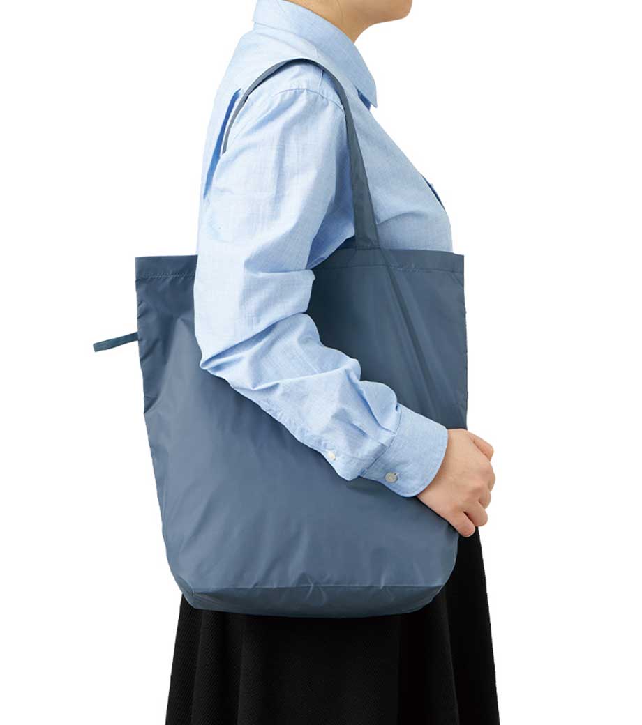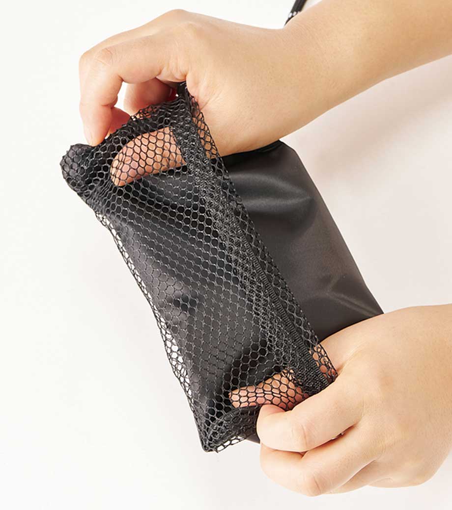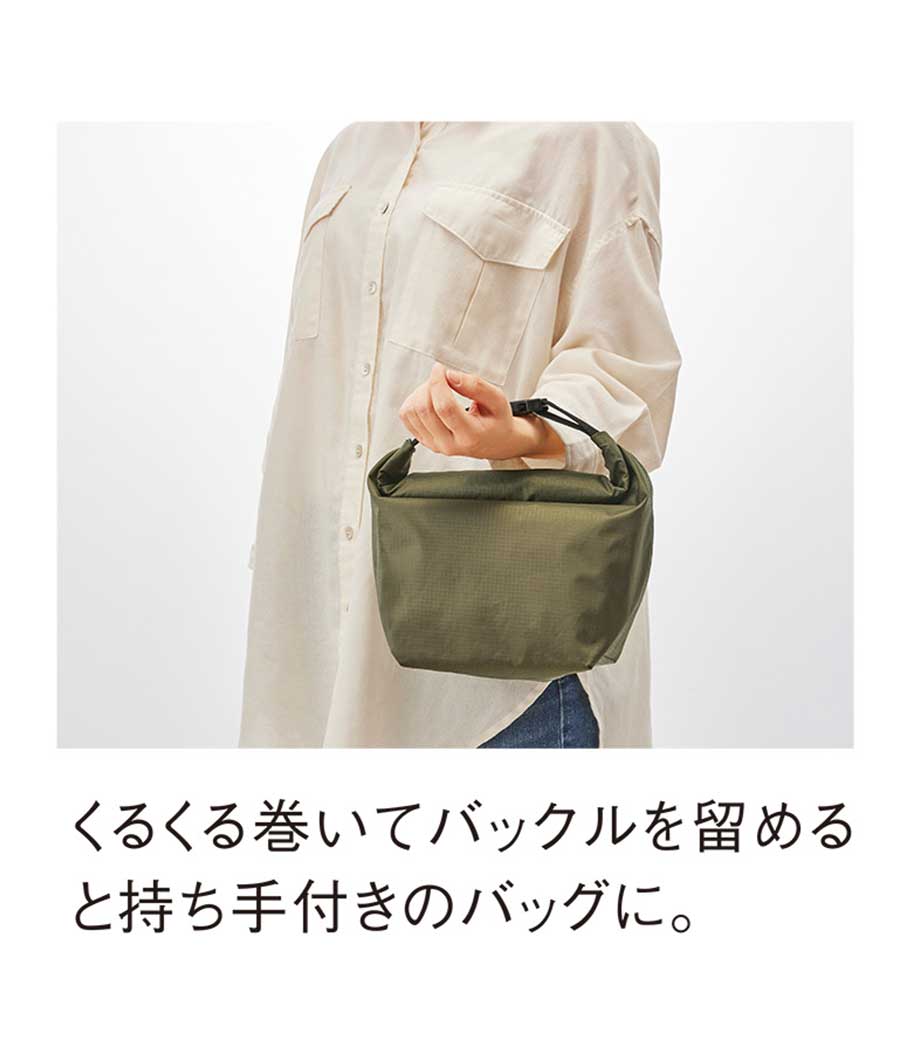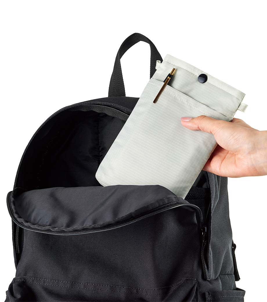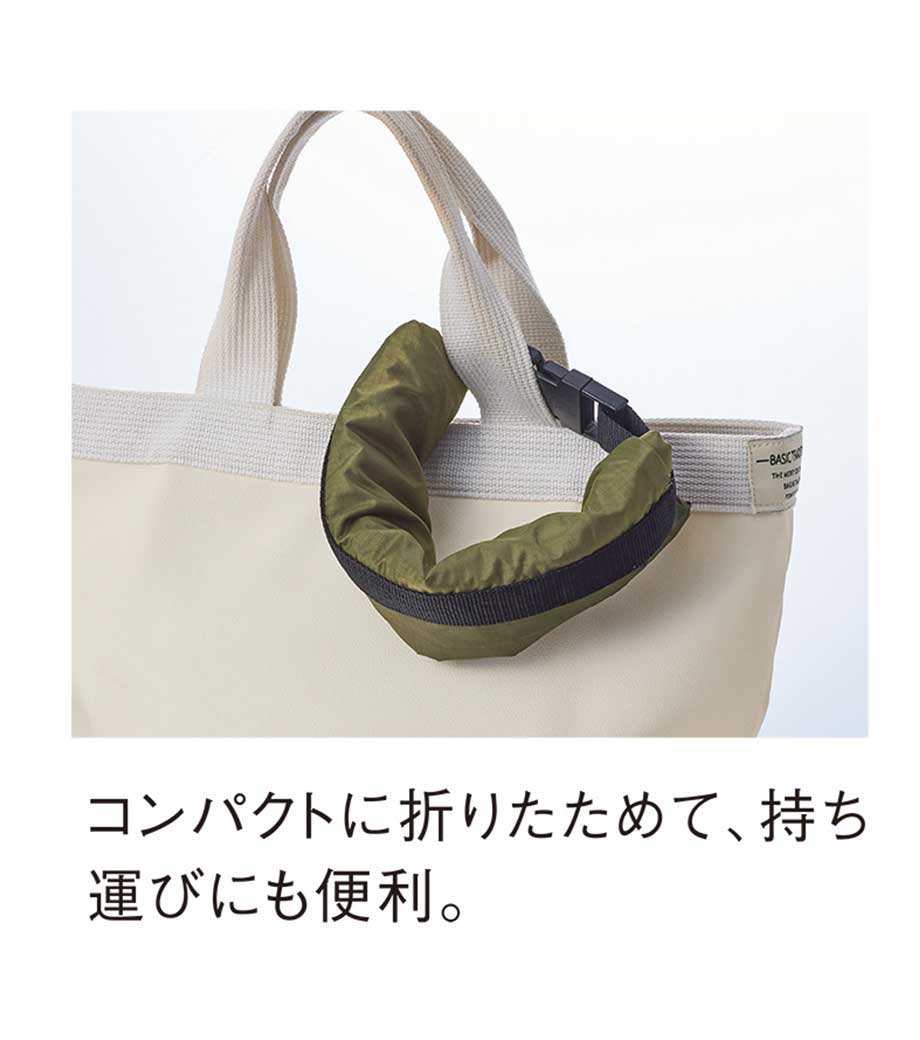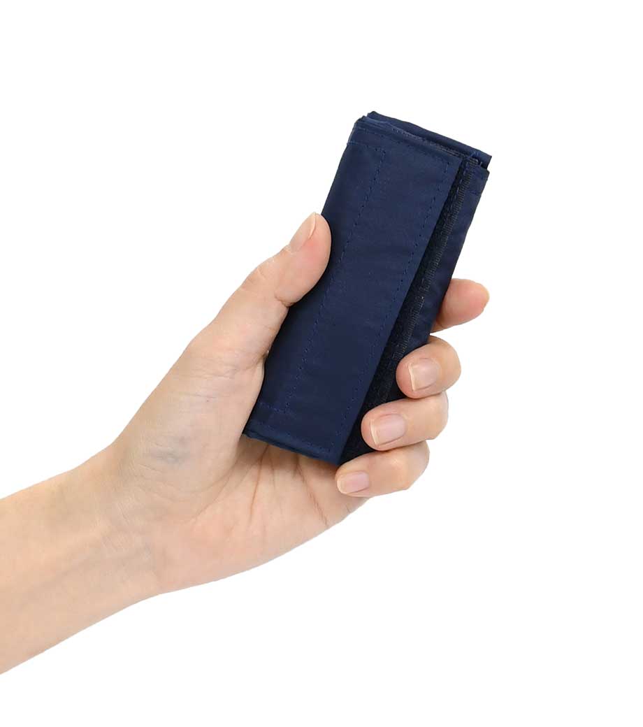 バッグ本体はスッキリとコンパクトに折り畳むことができ、面ファスナーで留めるだけのお手軽さ!普段使うバッグに忍ばせておけばいつでもさっと取り出せます。