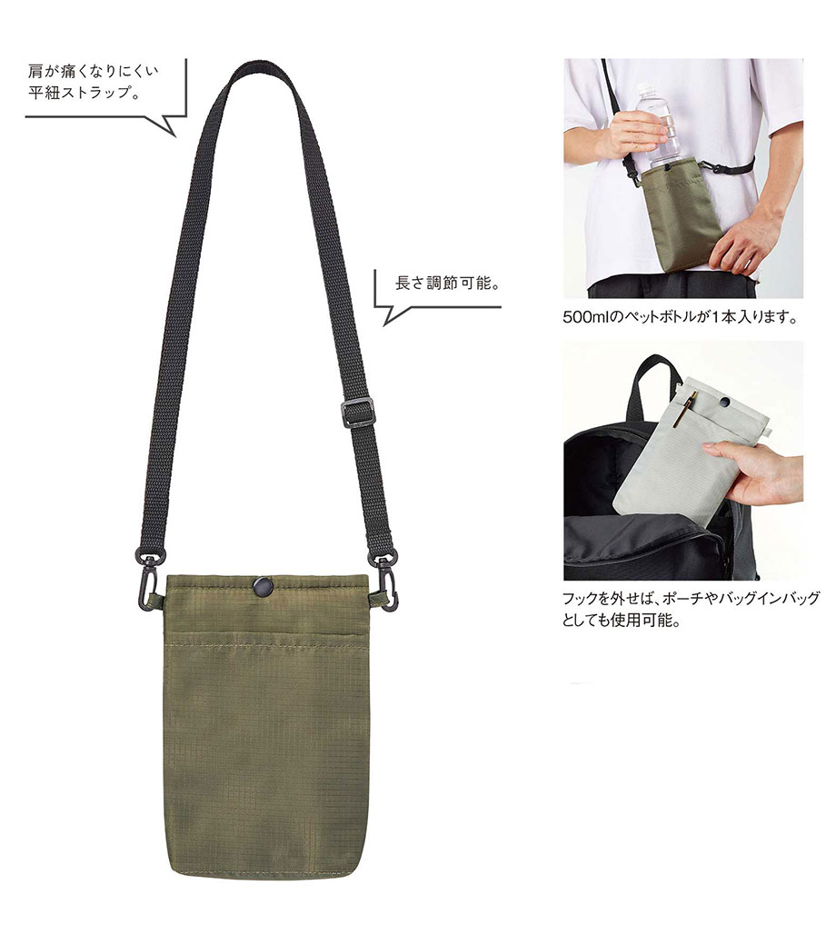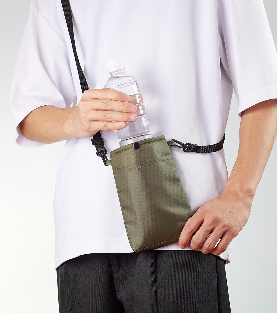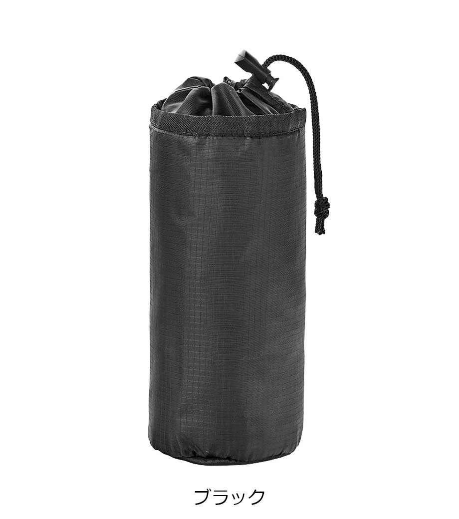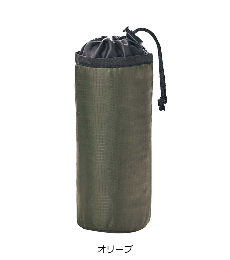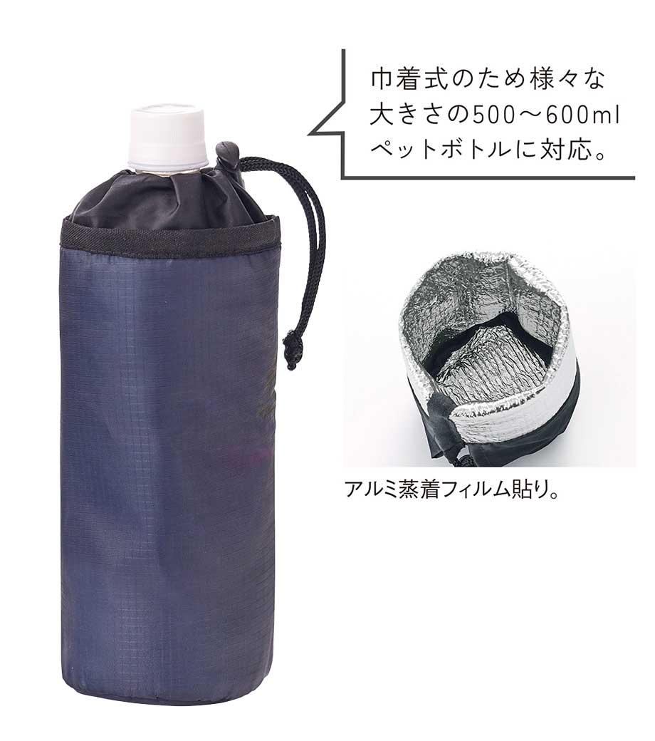 500ml~600mlペットボトルに対応できる巾着式ペットボトルホルダー。テントにも使われるタフで撥水機能のあるリップストップ生地を使用しています。内側はアルミ蒸着でペットボトルの温度をキープ。