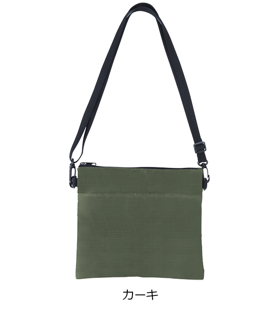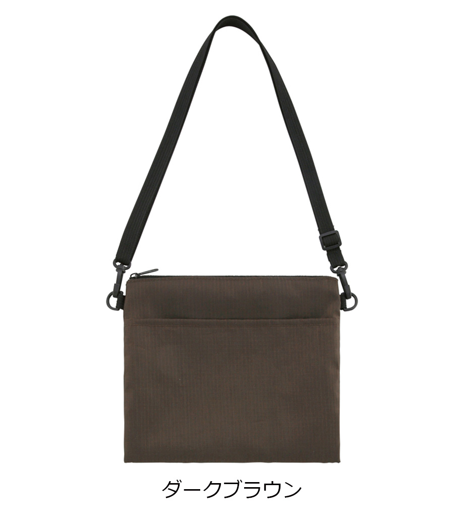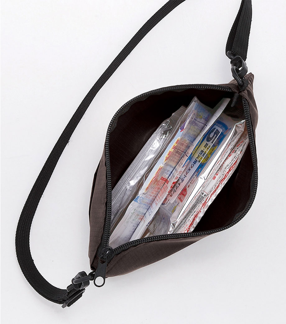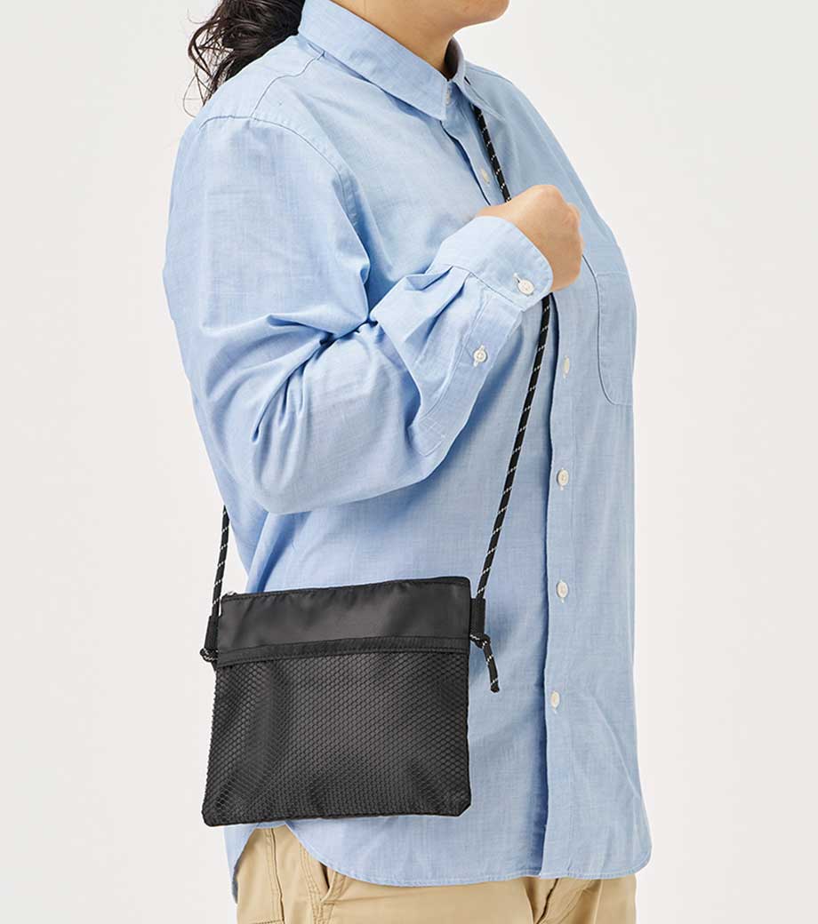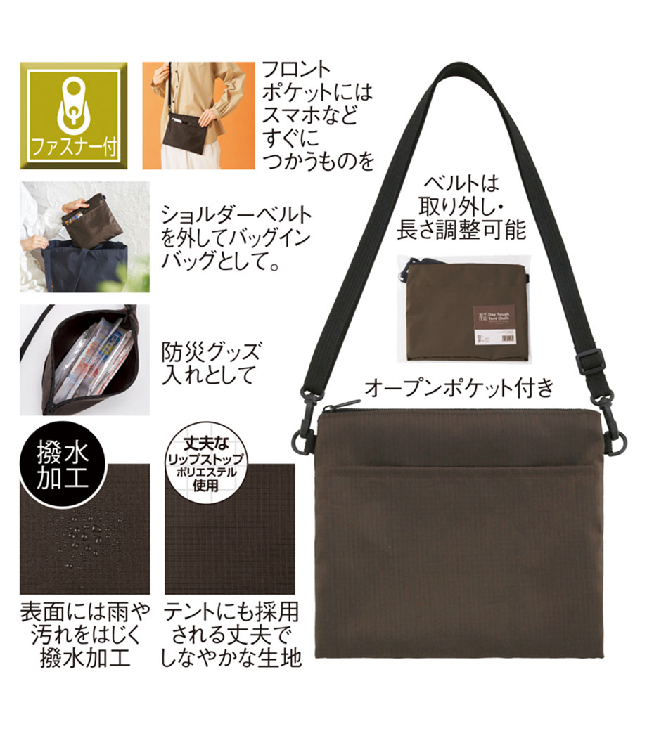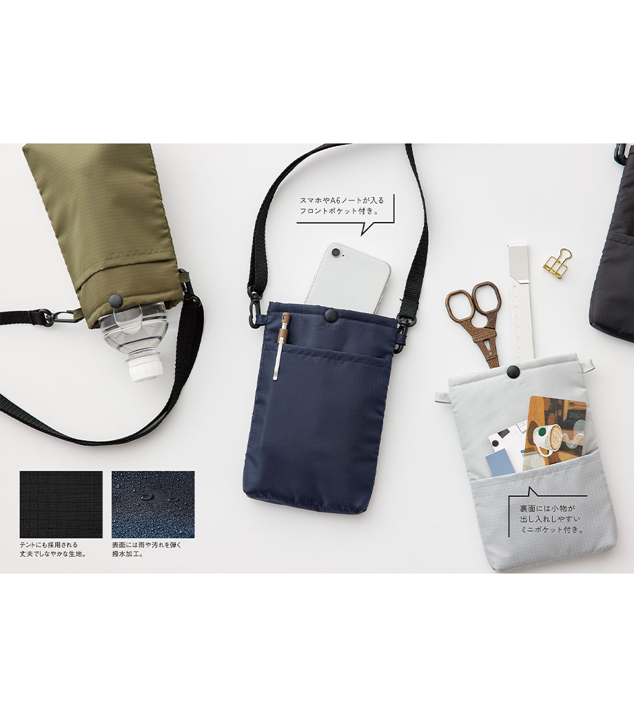 デイタフ・テントクロスポケット付きサコッシュ(撥水加工)の表面には撥水加工がしてあります。水や汚れに強く雨の日のお出掛けやアウトドアでも安心です。長財布やスマホなどの貴重品を肌身離さず持ち運びできる便利なサイズ。最低限必要な防災グッズを入れて玄関・寝室に置いておいても邪魔になりません。ハンカチなど小物が入るフロントポケット付きです。