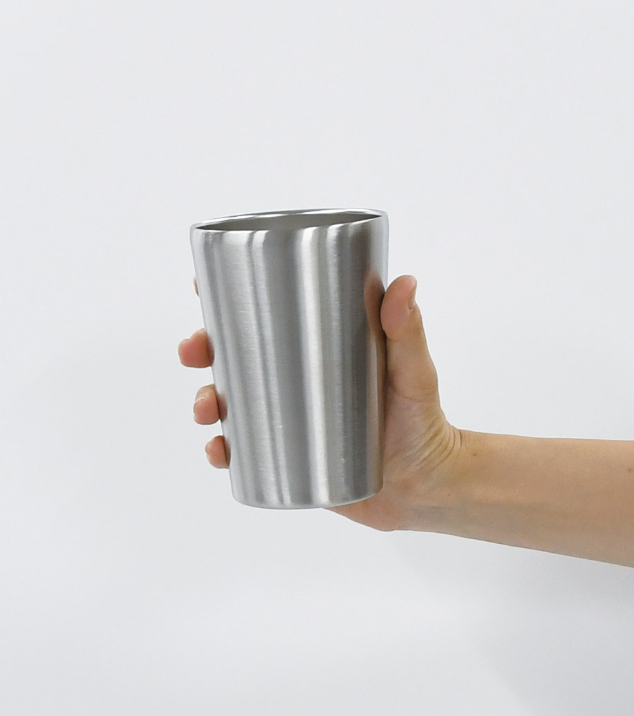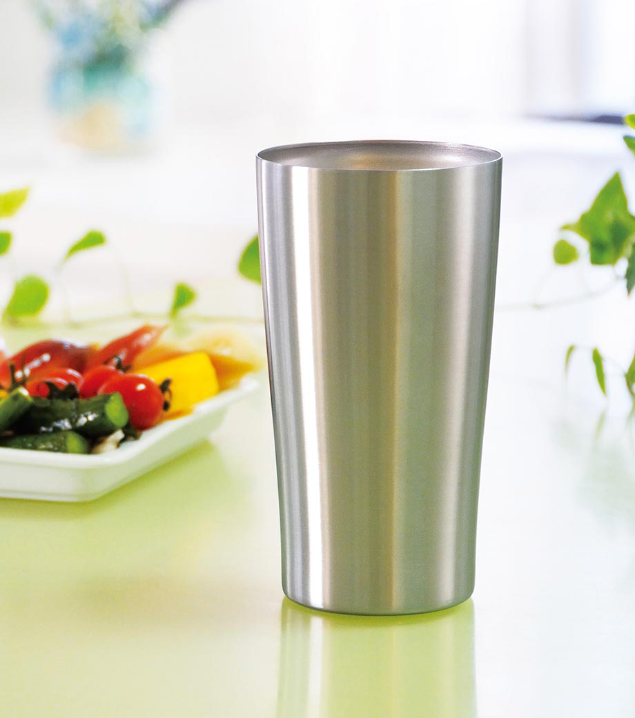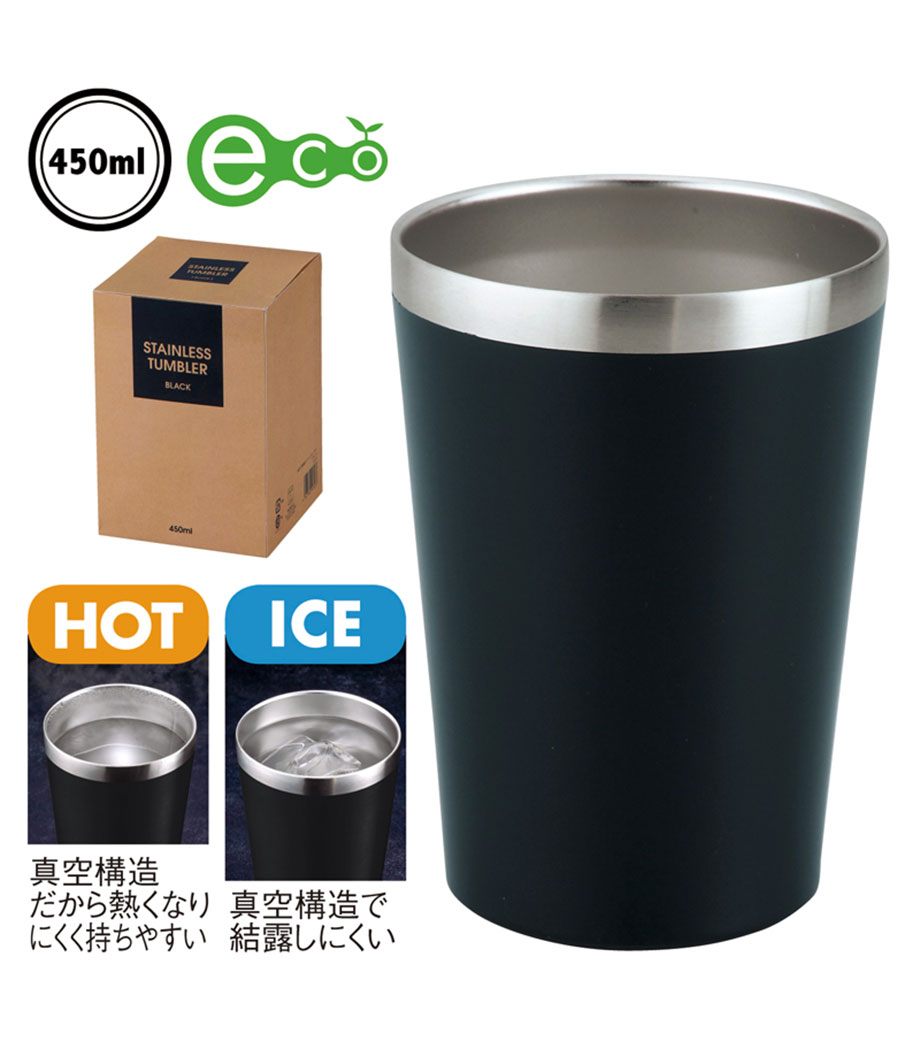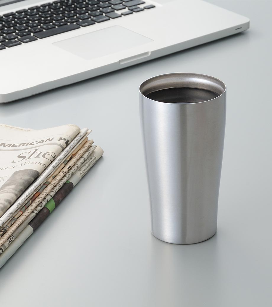 真空ステンレスタンブラー450mlは、丈夫で使いやすいステンレス製。真空二重構造なので、内瓶の飲み物の温度が外瓶まで伝わらず、飲み頃の温度を保ちます。氷を入れてもほとんど結露せず、コースター不要。熱い飲み物を入れても本体が熱くなりにくく、持ちやすいタンブラーです。