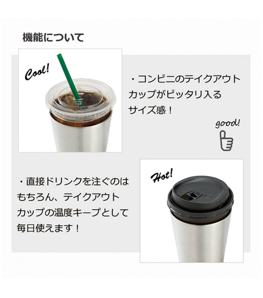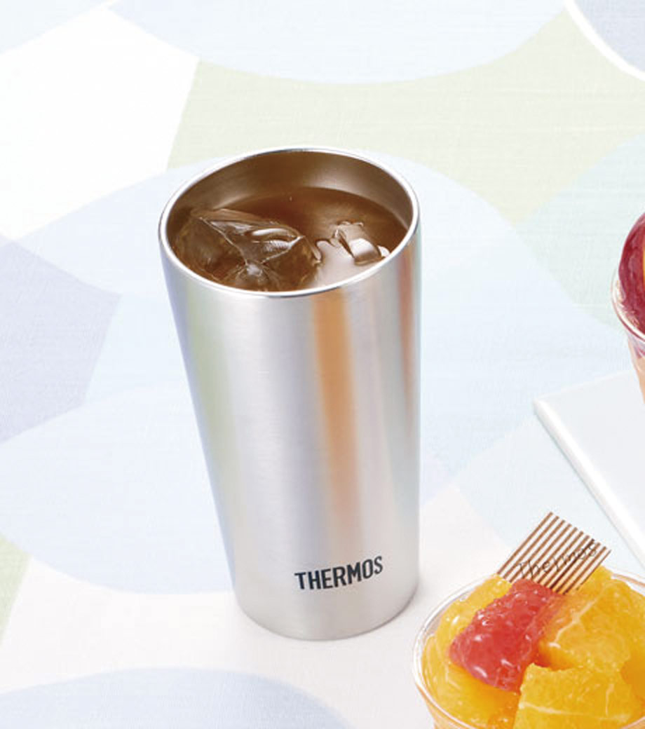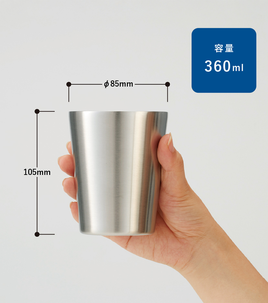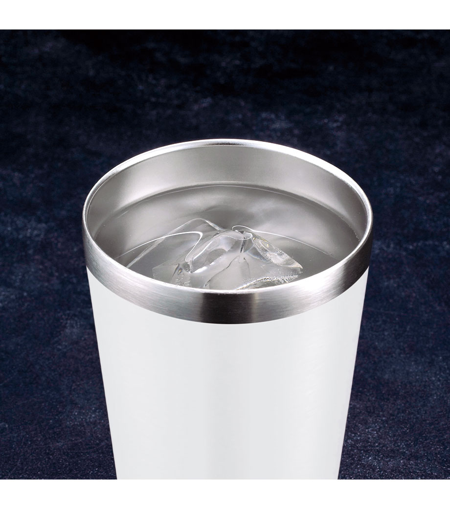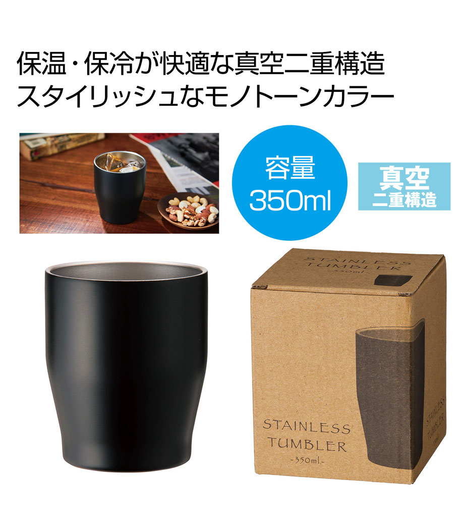 真空ステンレスタンブラー450mlは、丈夫で使いやすいステンレス製。真空二重構造なので、内瓶の飲み物の温度が外瓶まで伝わらず、飲み頃の温度を保ちます。氷を入れてもほとんど結露せず、コースター不要。熱い飲み物を入れても本体が熱くなりにくく、持ちやすいタンブラーです。