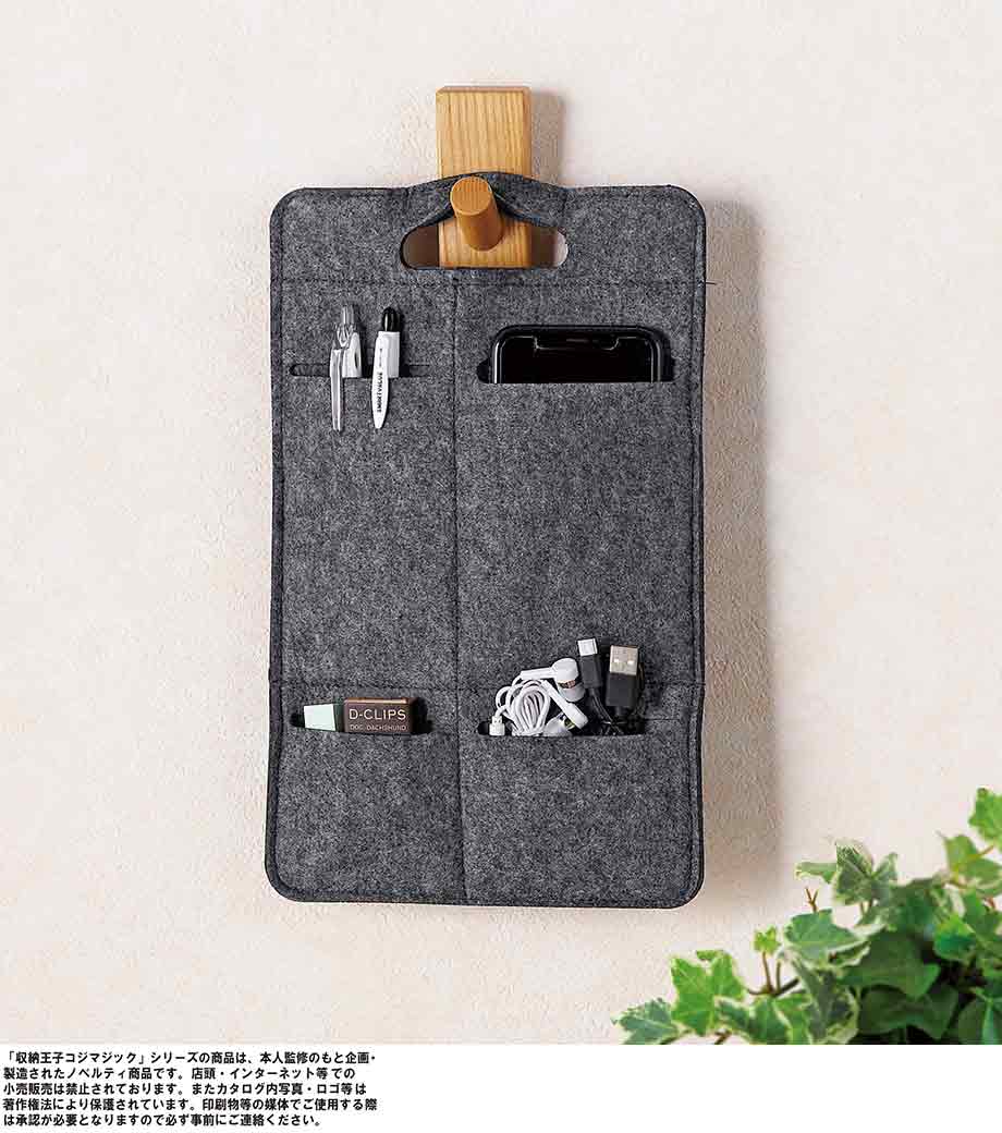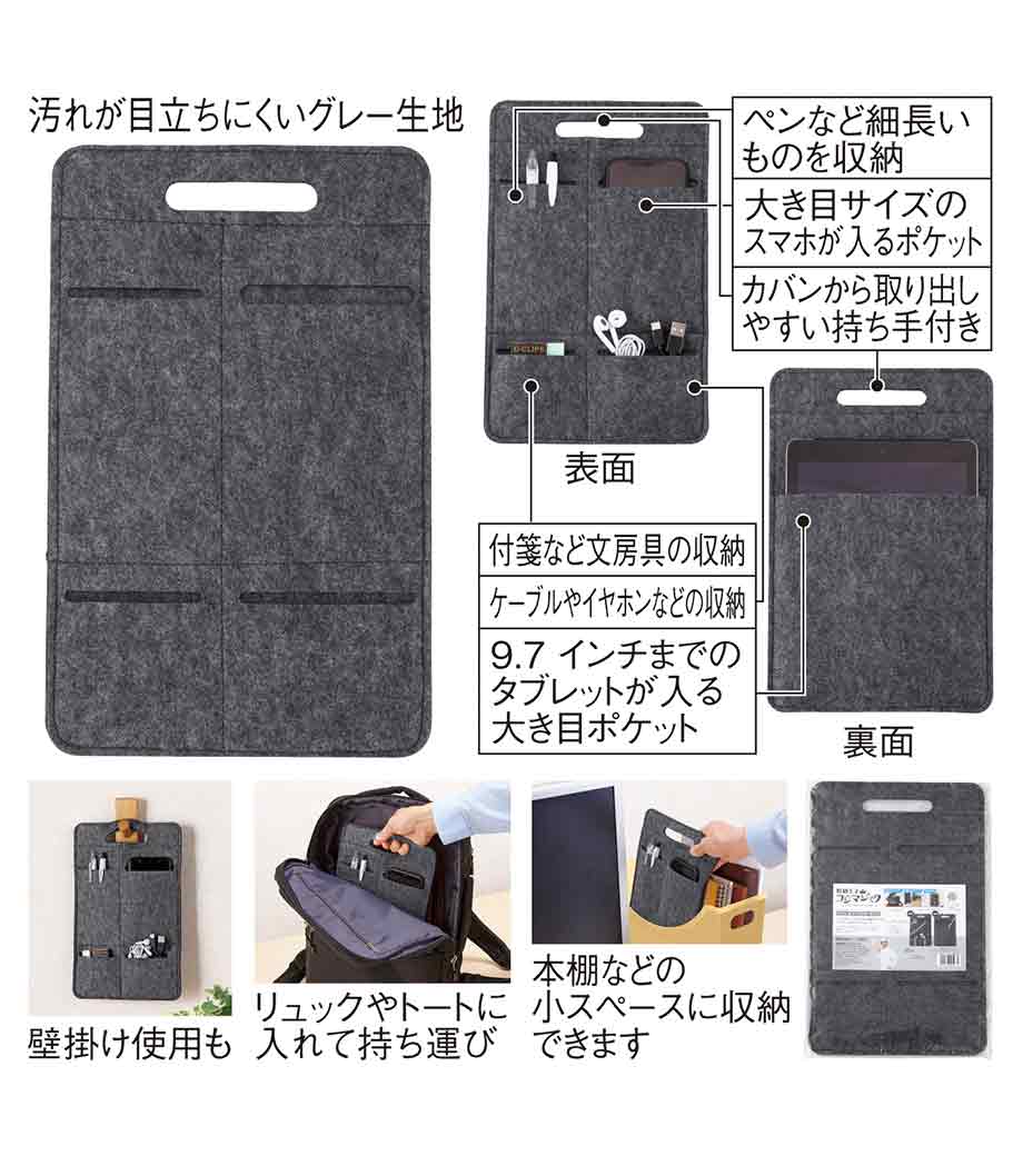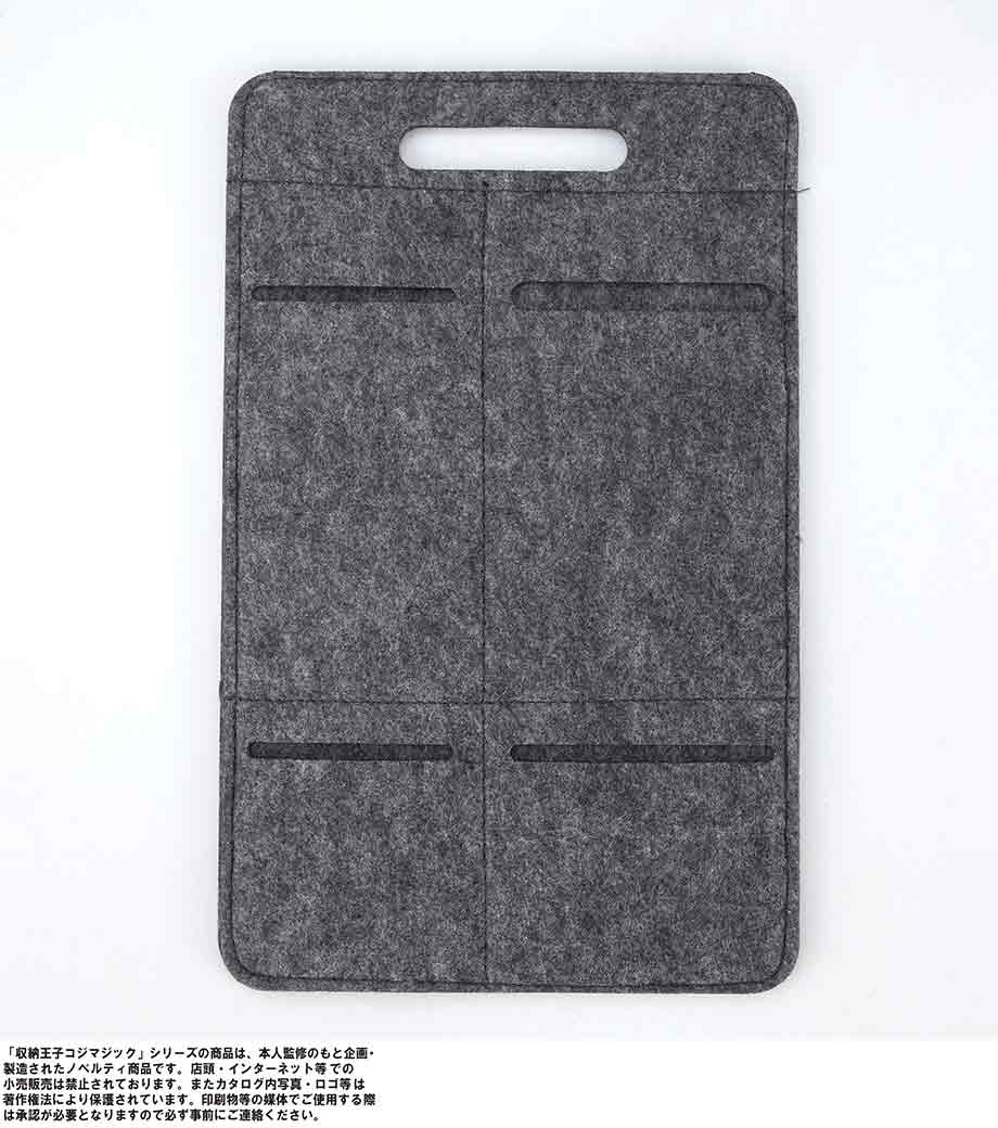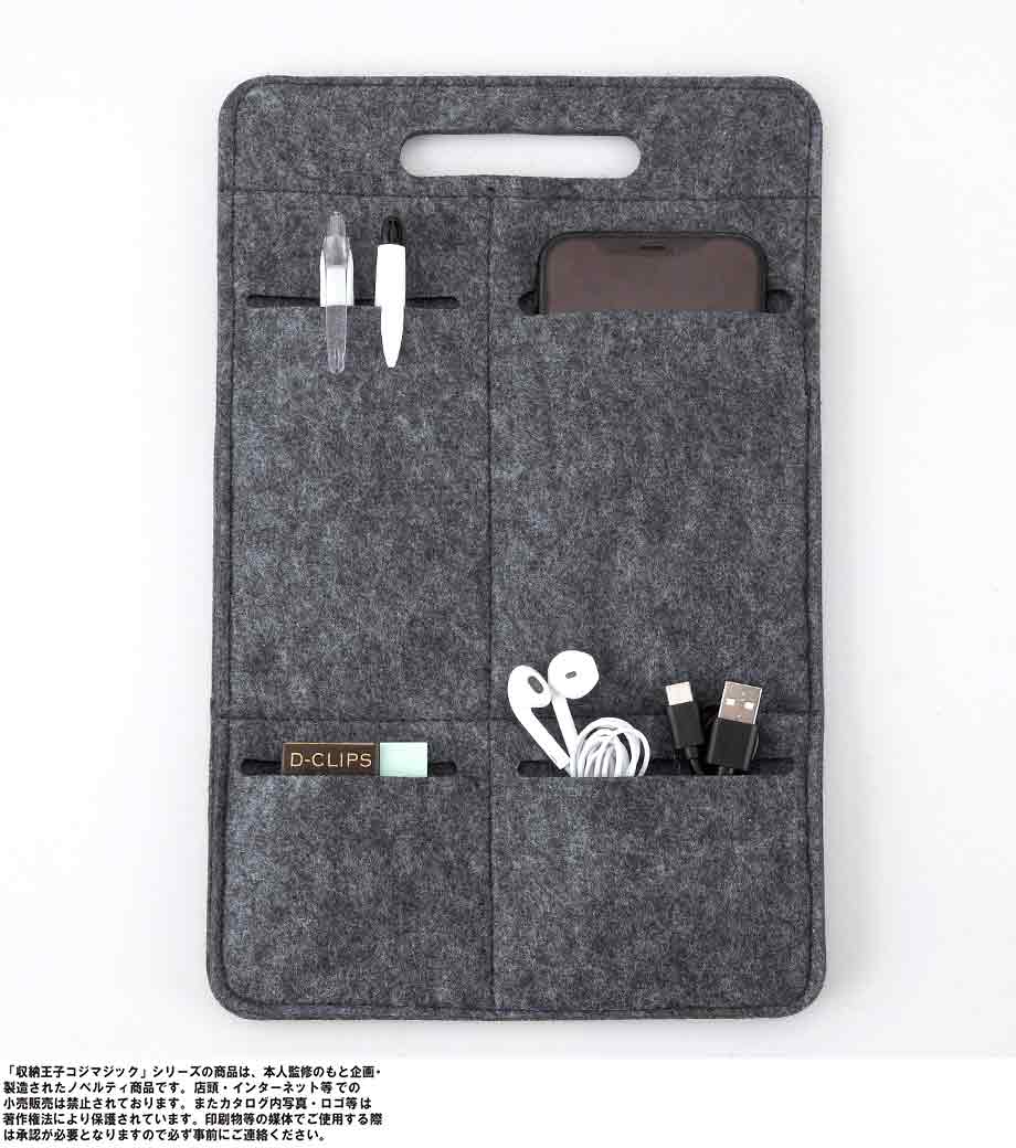 収納王子コジマジック・バッグインマルチキャリングボードは、リュックやトートに入れやすい縦型タイプの収納バッグです。カバンから取り出しやすい持ち手付き。壁掛け使用もできちゃいます。スマホやペンの収納に適した4か所の小物ポケットと、9.7インチまでのタブレットが入る大きなポケット付き。しっかりとしたフェルト生地ですが重さはわずか約65gで持ち運びに便利です。