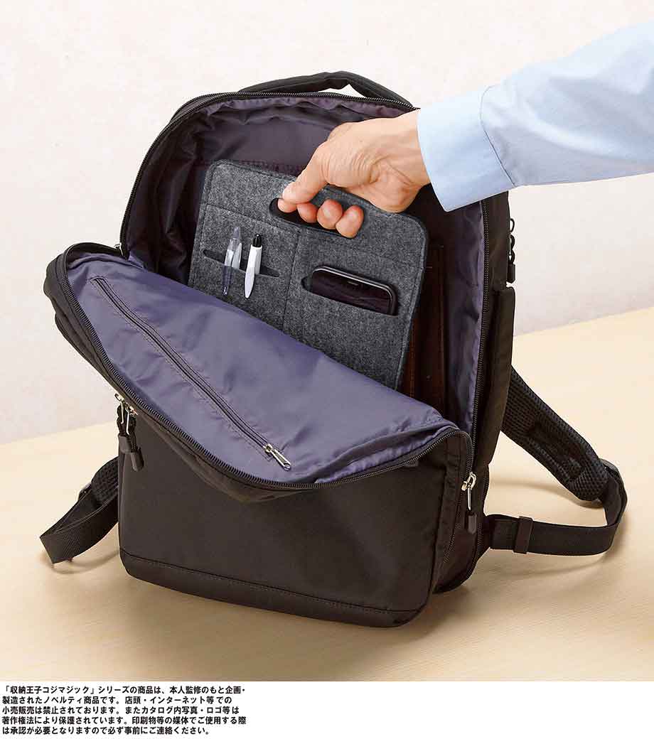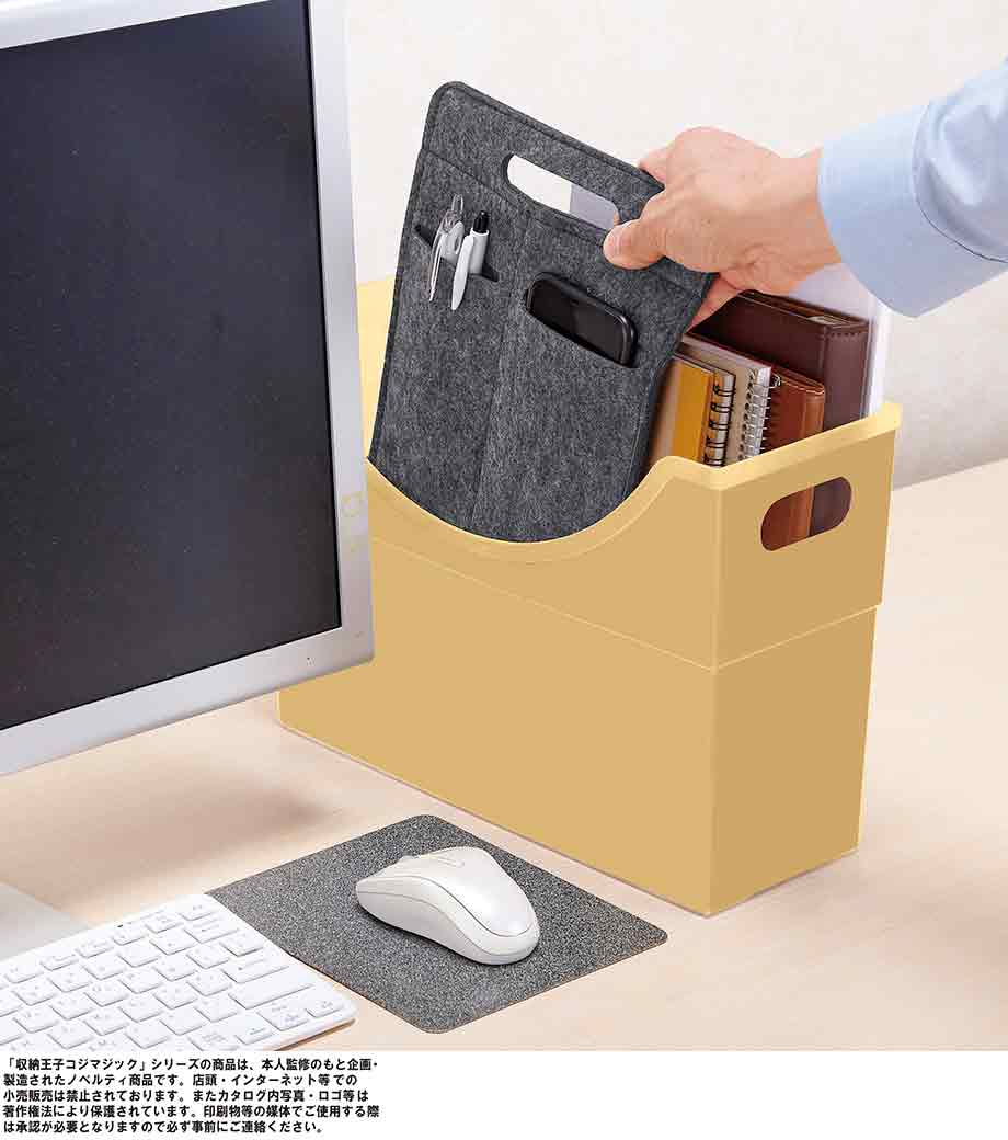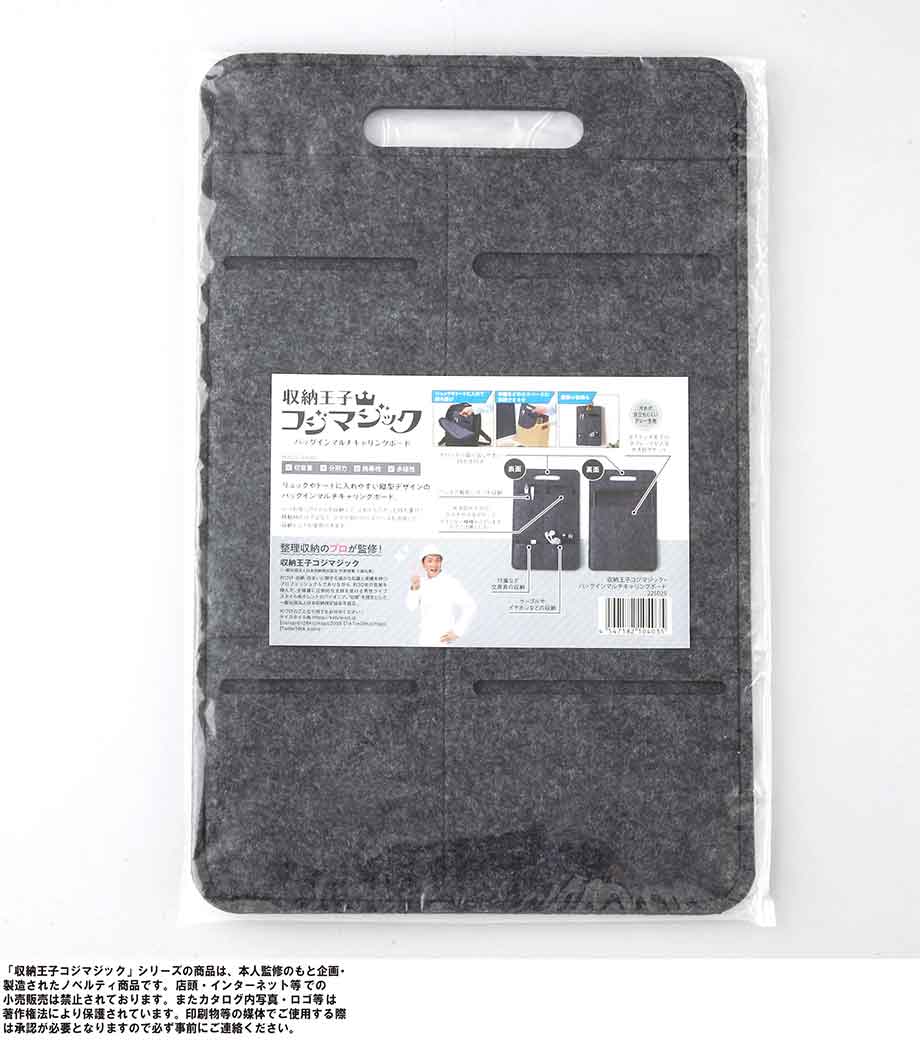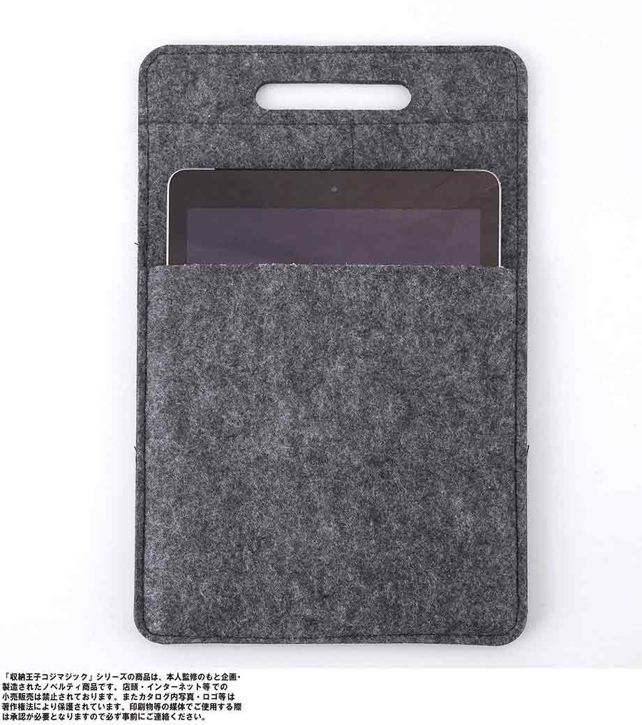 収納王子コジマジック・バッグインマルチキャリングボードは、リュックやトートに入れやすい縦型タイプの収納バッグです。カバンから取り出しやすい持ち手付き。壁掛け使用もできちゃいます。スマホやペンの収納に適した4か所の小物ポケットと、9.7インチまでのタブレットが入る大きなポケット付き。しっかりとしたフェルト生地ですが重さはわずか約65gで持ち運びに便利です。