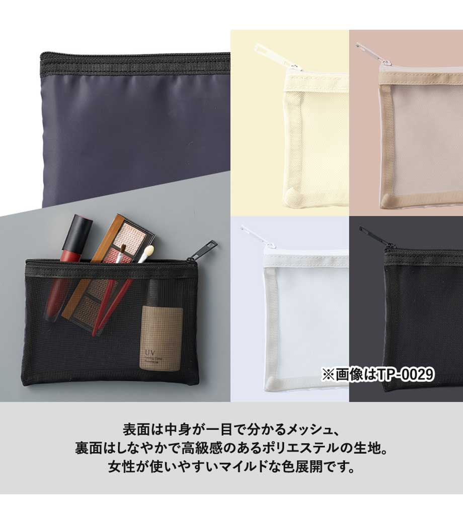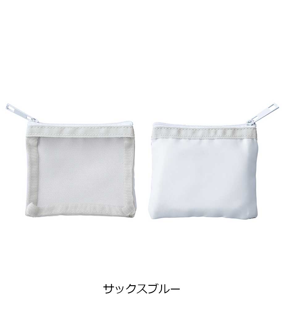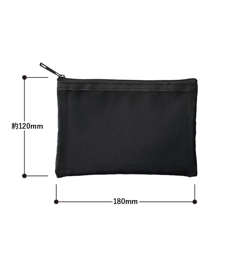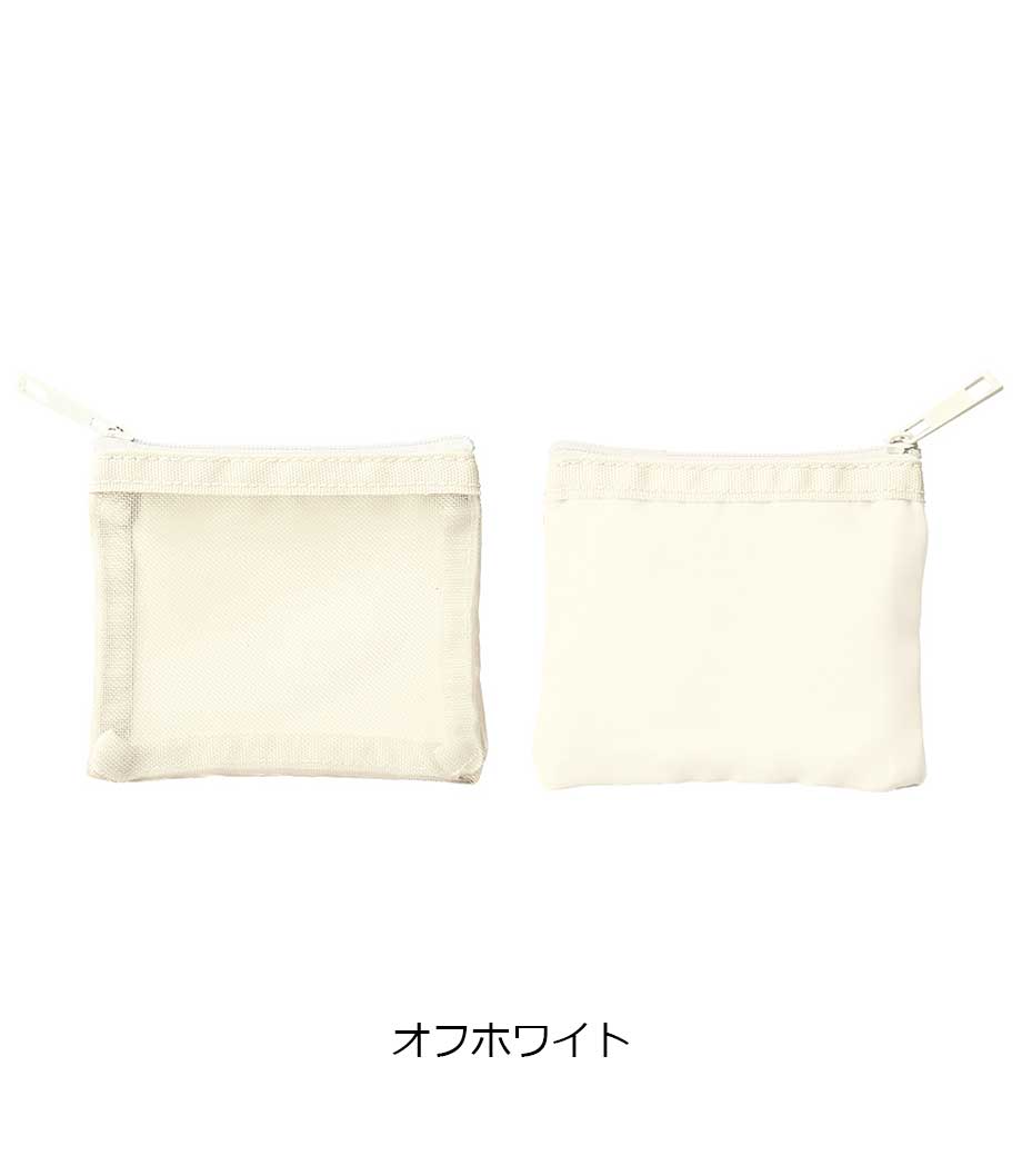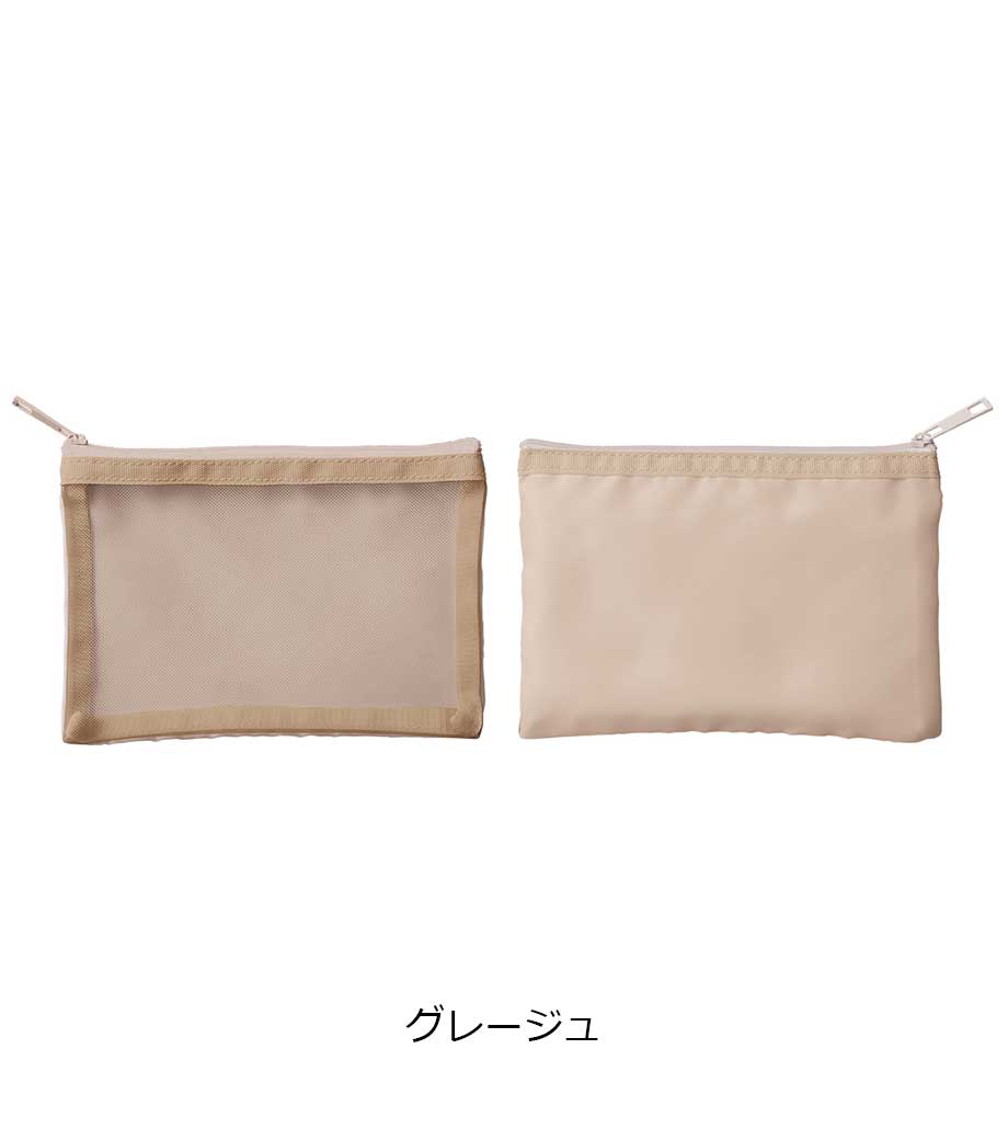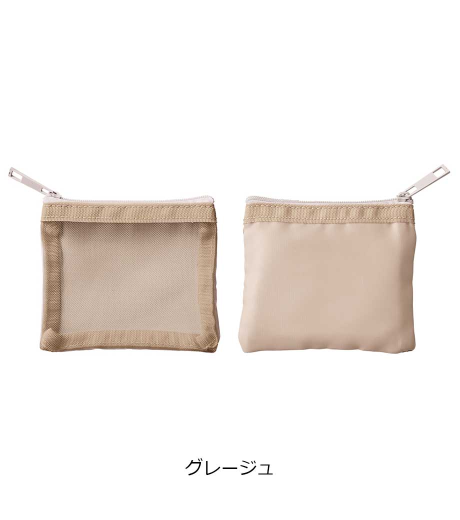 小物の収納にぴったりなミニポーチ。表は中身がひと目でわかるメッシュ素材、裏は目隠しができるポリエステル素材。持つ向きを変えれば、中身を見せたいときにも見せたくないときにも対応できます。イヤホンやリップ、アクセサリーなどをすっきり収納でき、かさばらないフラットタイプだから持ち歩きにも最適。さらに、メッシュ生地はハリがあり型くずれしにくいのもポイントです。
