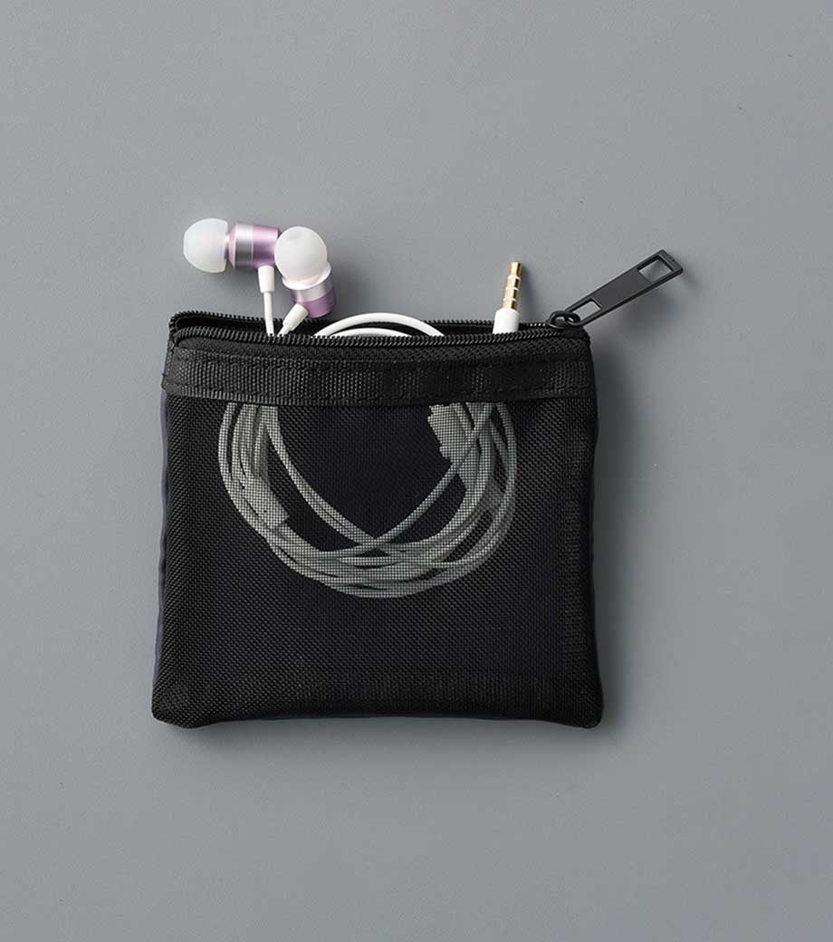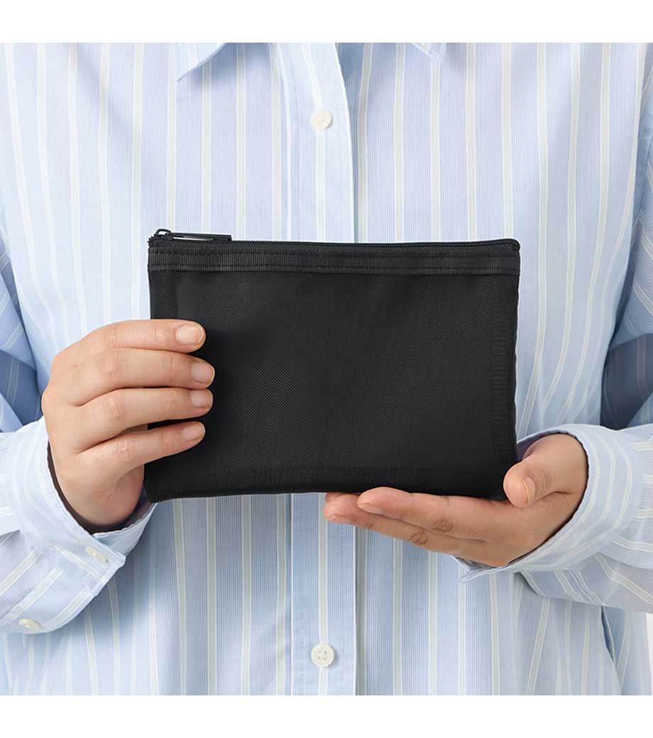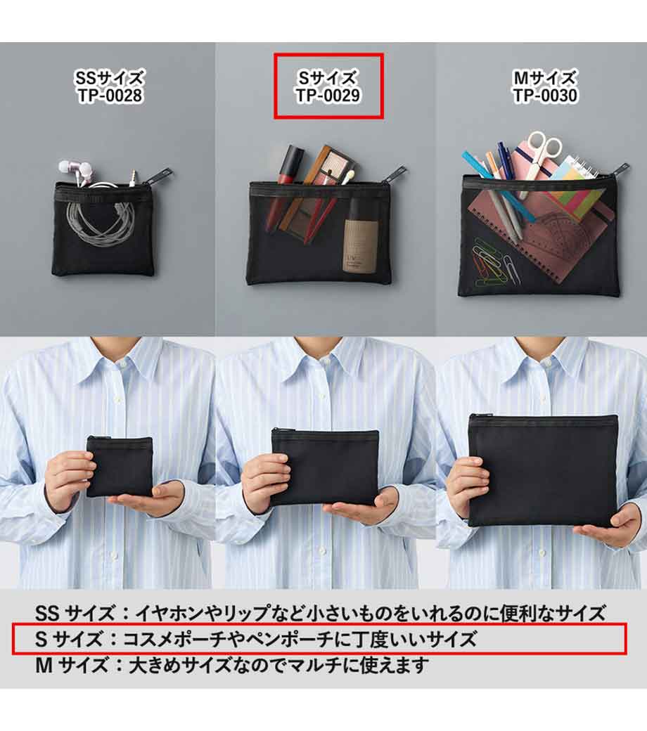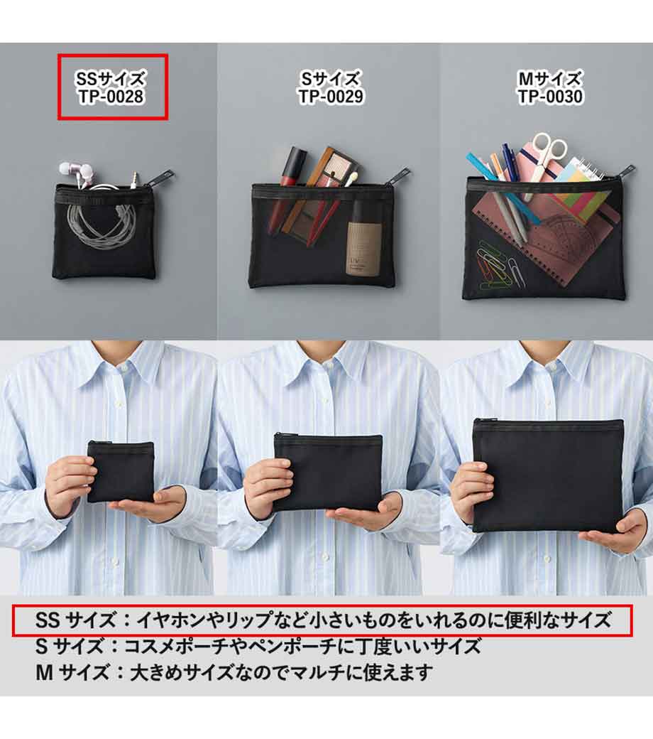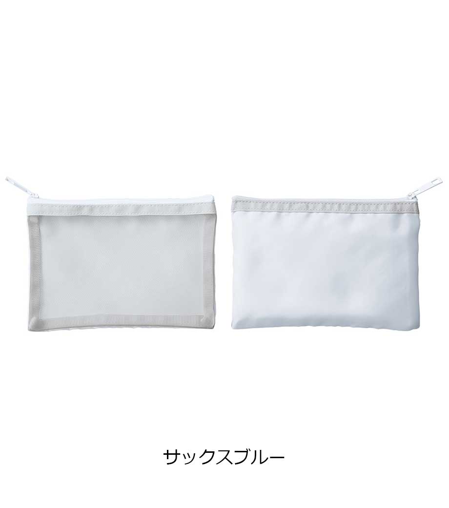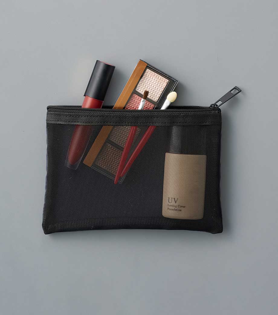 小物の収納にぴったりなミニポーチ。表は中身がひと目でわかるメッシュ素材、裏は目隠しができるポリエステル素材。持つ向きを変えれば、中身を見せたいときにも見せたくないときにも対応できます。イヤホンやリップ、アクセサリーなどをすっきり収納でき、かさばらないフラットタイプだから持ち歩きにも最適。さらに、メッシュ生地はハリがあり型くずれしにくいのもポイントです。