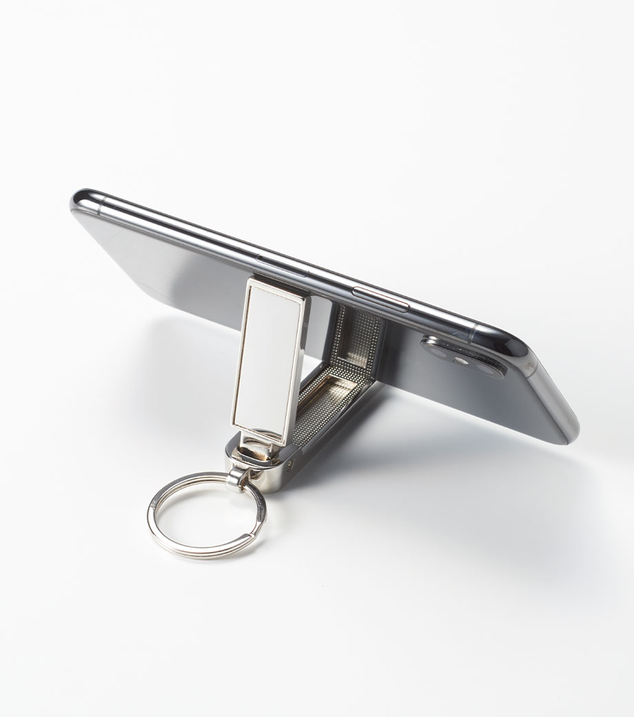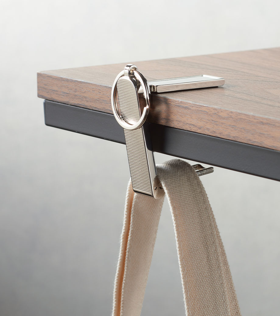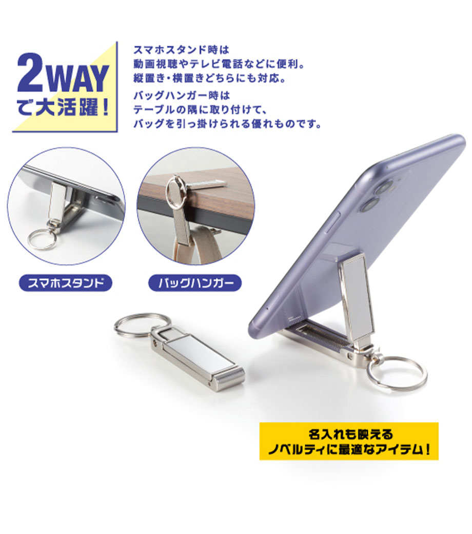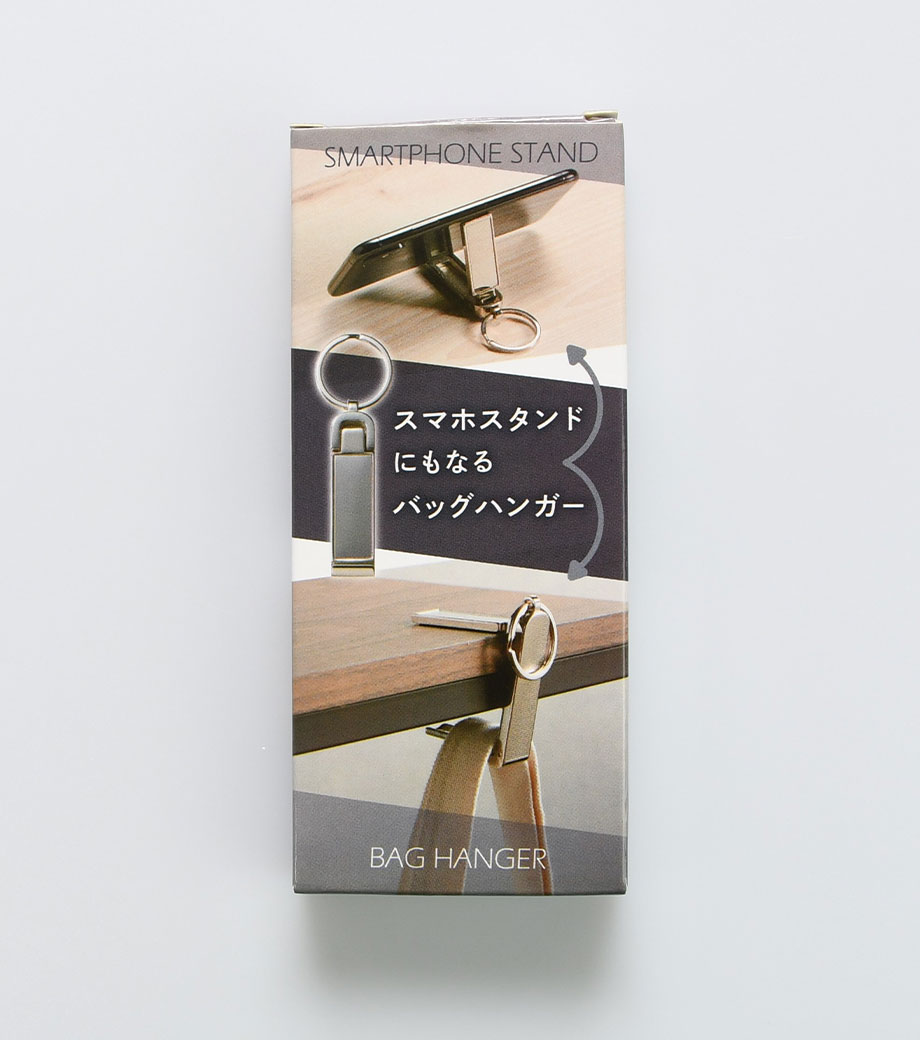 スマホスタンドにもなるバッグハンガーは、便利な2WAYキーホルダー。レストランやカフェで荷物の置き場に困った時、さっとテーブルに掛ければ即席の吊り下げフックに。床にバッグを置かなくてすむので衛生的。狭い店内でも快適です!
