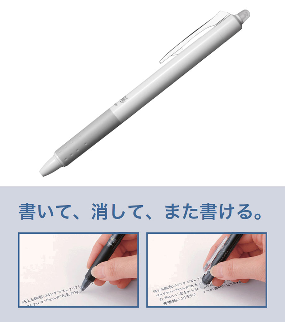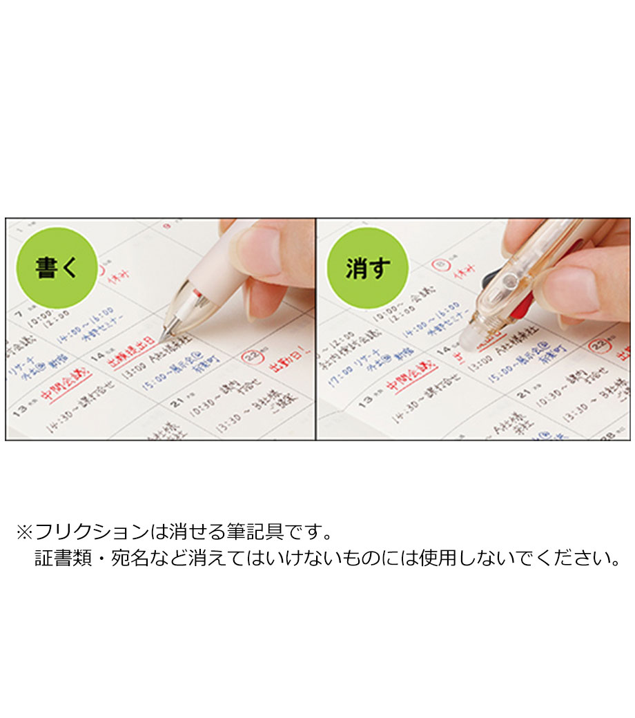 消える便利なフリクションボールペンのペン先は一般筆記に適した0.5mmの極細タイプで、細かい書き込みに優れています。独自に開発したリフトクリップは、厚いものをしっかり挟むことができ、10万回挟んでも壊れません!