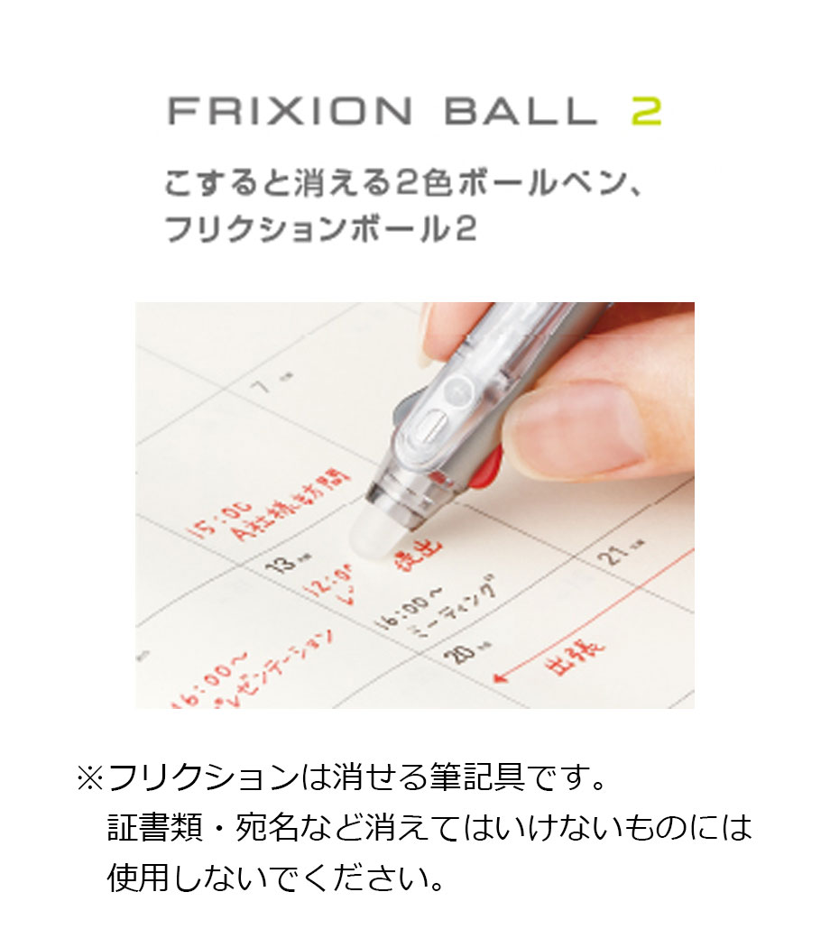 フリクションボール2 05は、1本で2色を使い分けでき、何度でも書き消し可能な利便性の高い2色ボールペンです。こすると消えるフリクションシリーズは記念品に大変人気が高いペンで、学校名・企業名を名入れ印刷してオリジナルペンを制作できます。もらって喜ばれること間違いなしです。名入れ専用の白軸もご用意しています。
