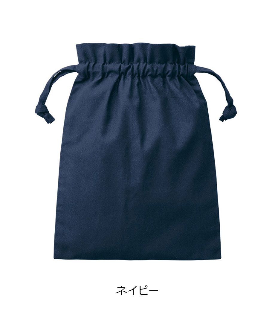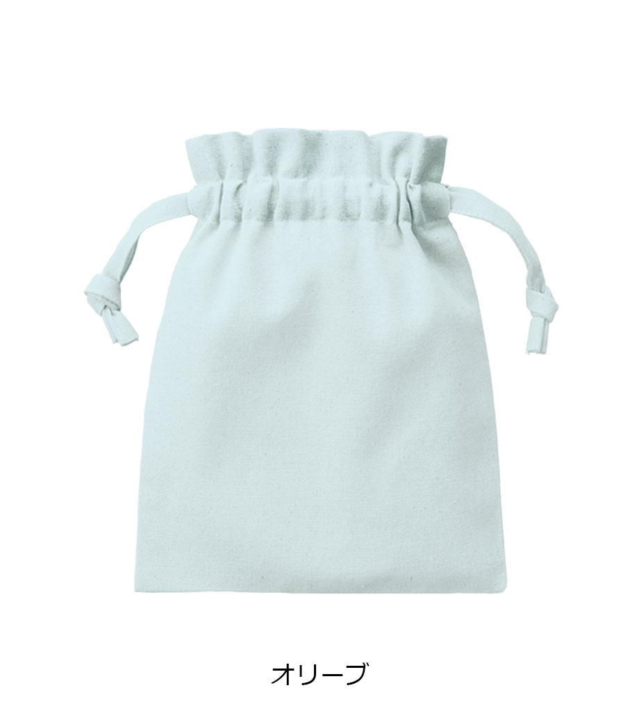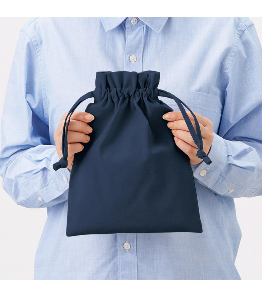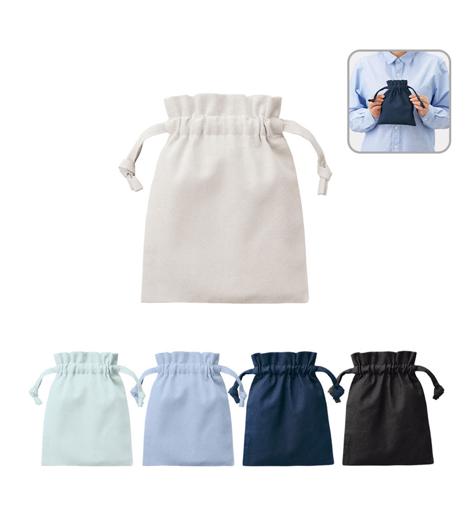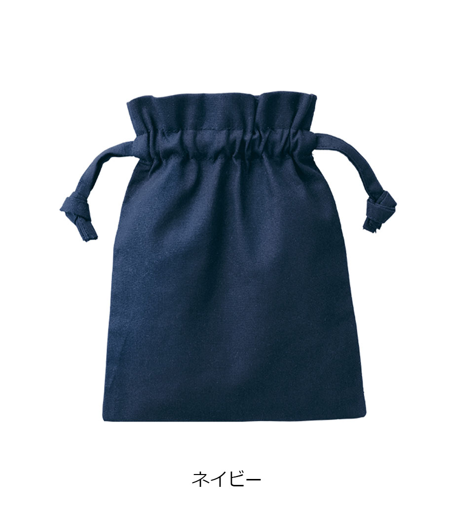 ベーシックで使いやすい5オンスの厚手コットン巾着。マチなしでちょっとしたガジェット入れや、詰め合わせギフト用袋にぴったりです。紐部分は共生地を使用。高級感のある印象です。