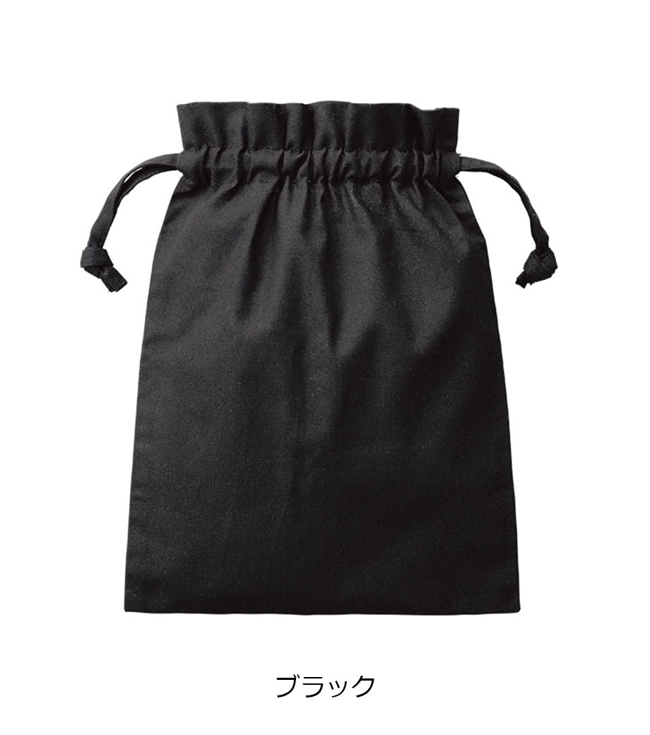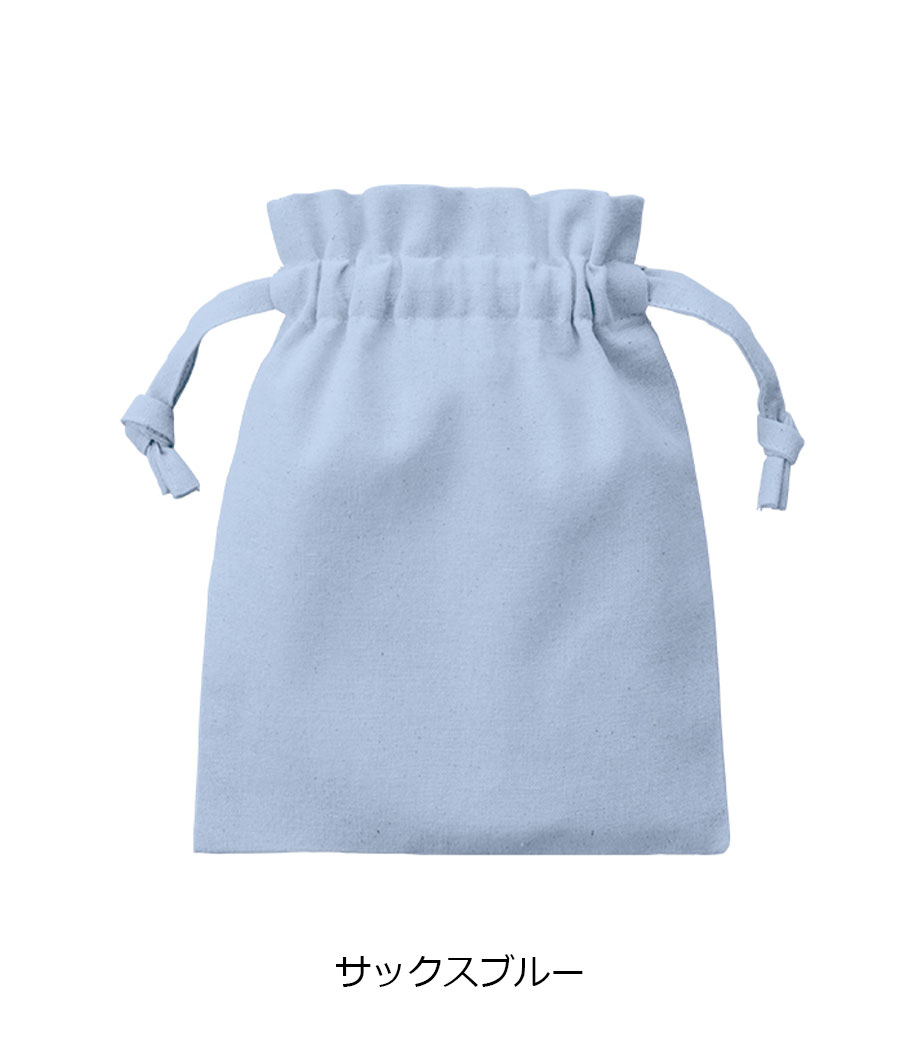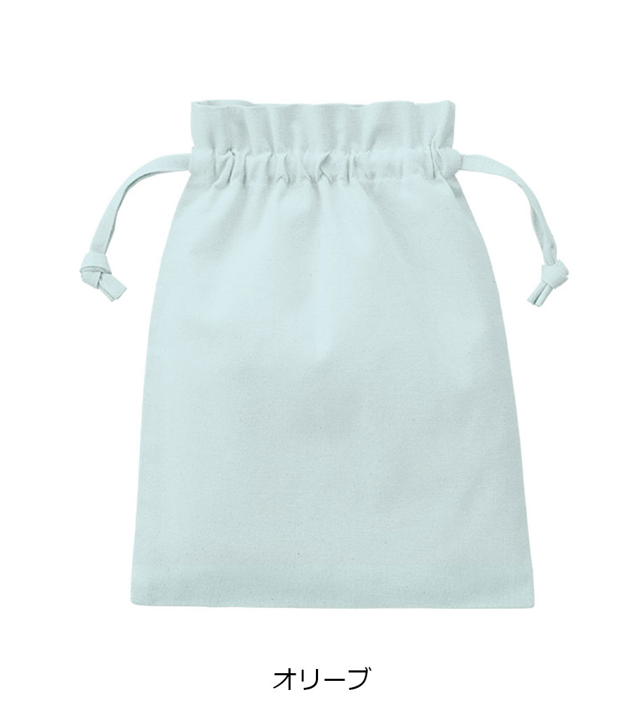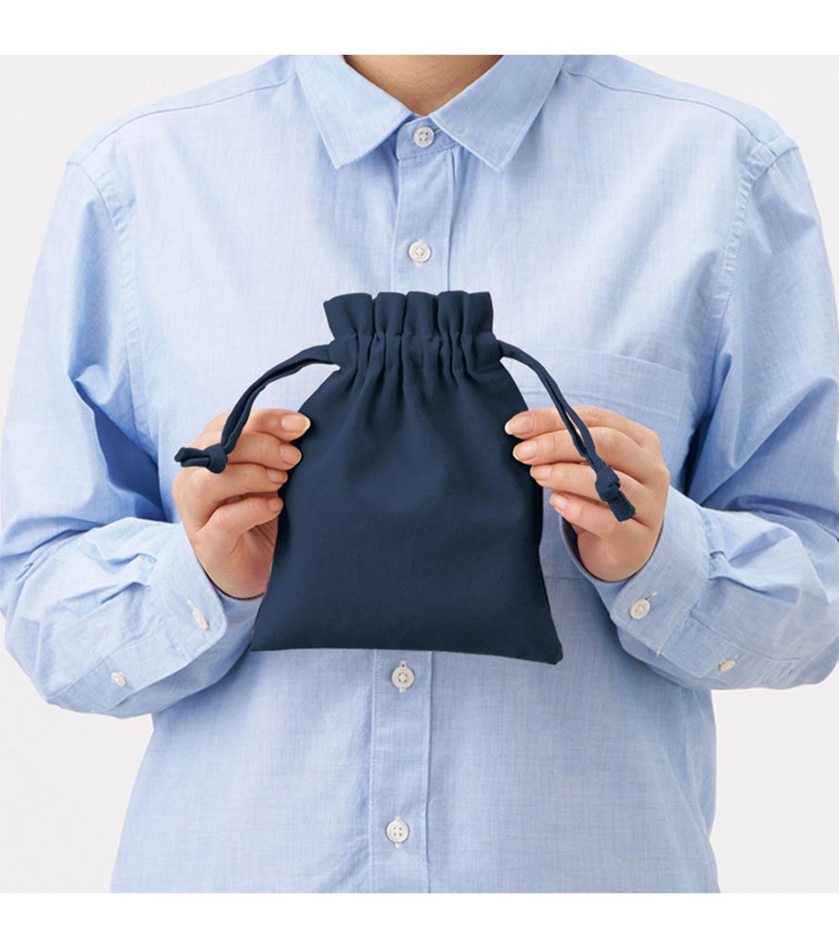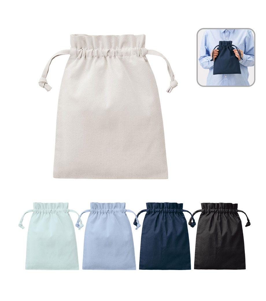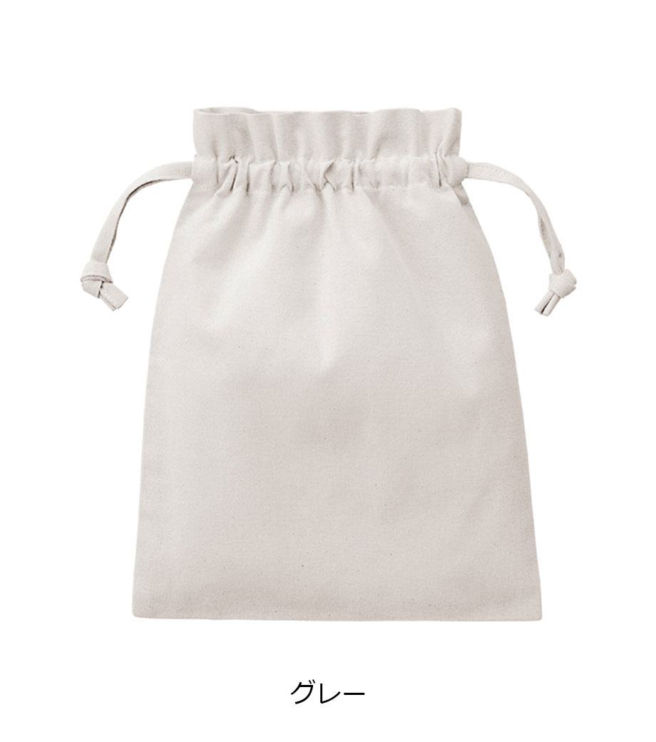 ベーシックで使いやすい5オンスの厚手コットン巾着。マチなしでちょっとしたガジェット入れや、詰め合わせギフト用袋にぴったりです。紐部分は共生地を使用。高級感のある印象です。