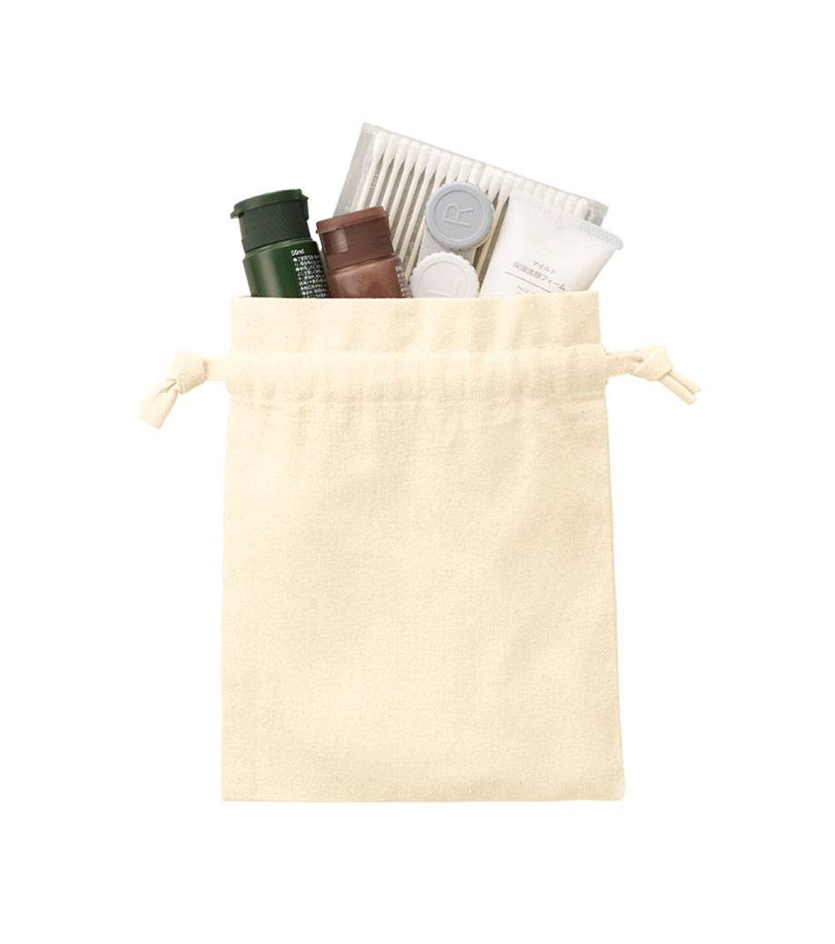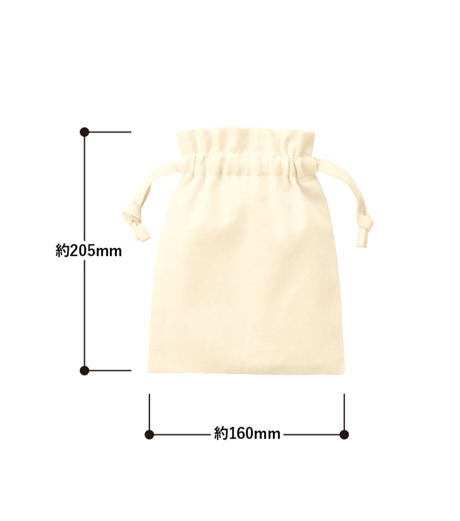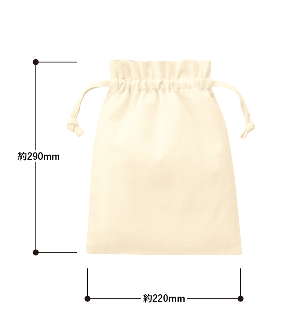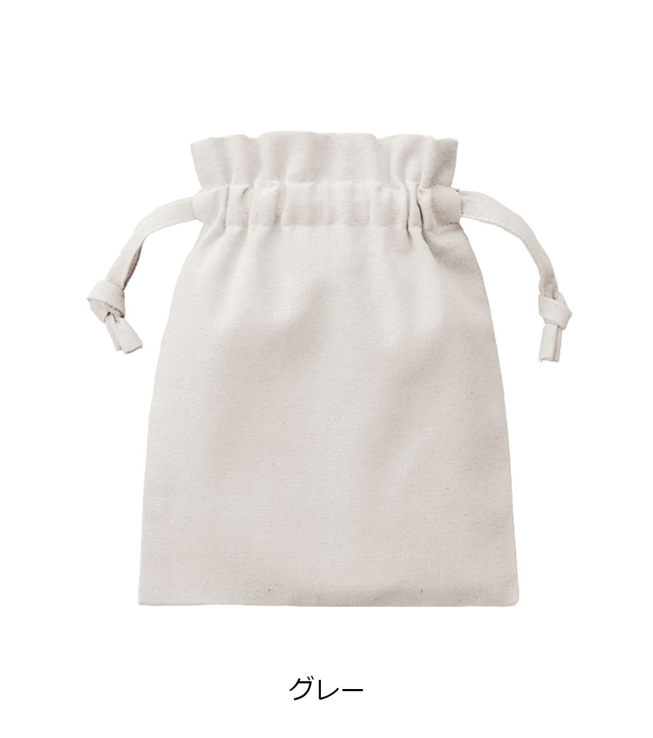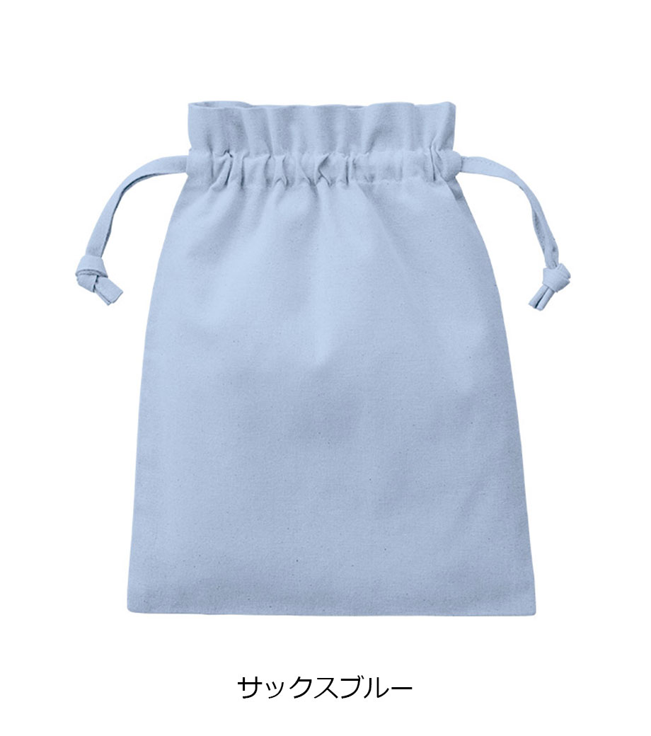 ベーシックで使いやすい5オンスの厚手コットン巾着。マチなしでちょっとしたガジェット入れや、詰め合わせギフト用袋にぴったりです。紐部分は共生地を使用。高級感のある印象です。