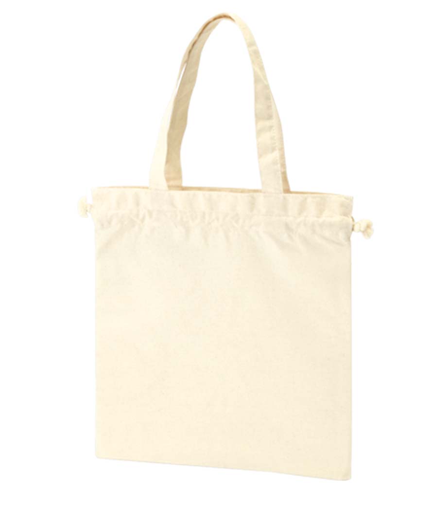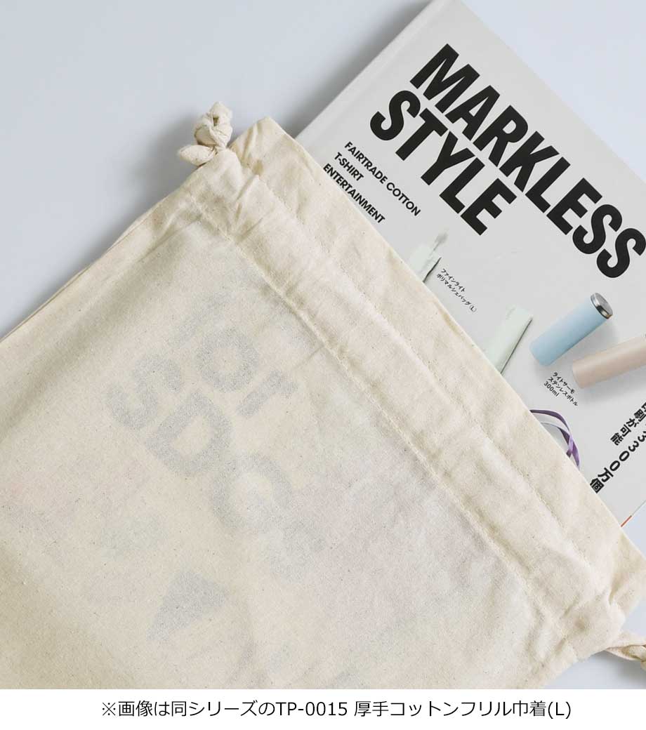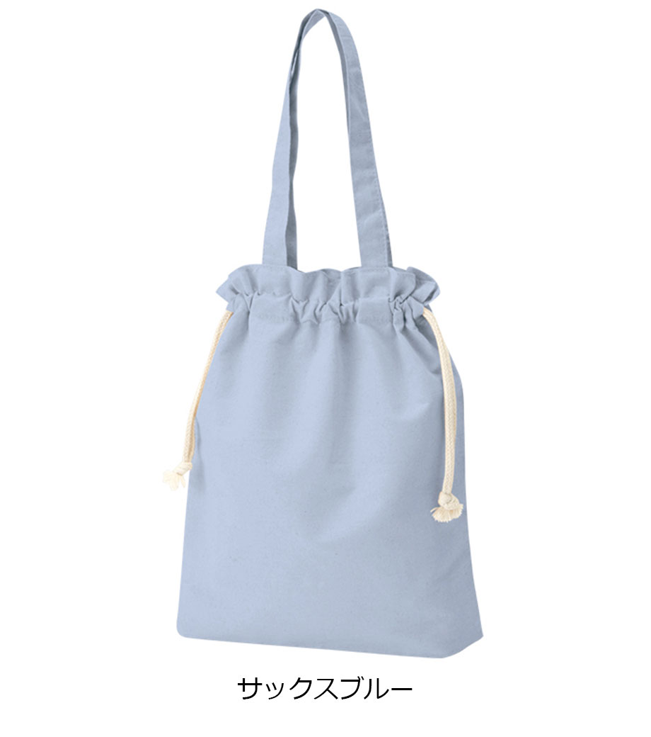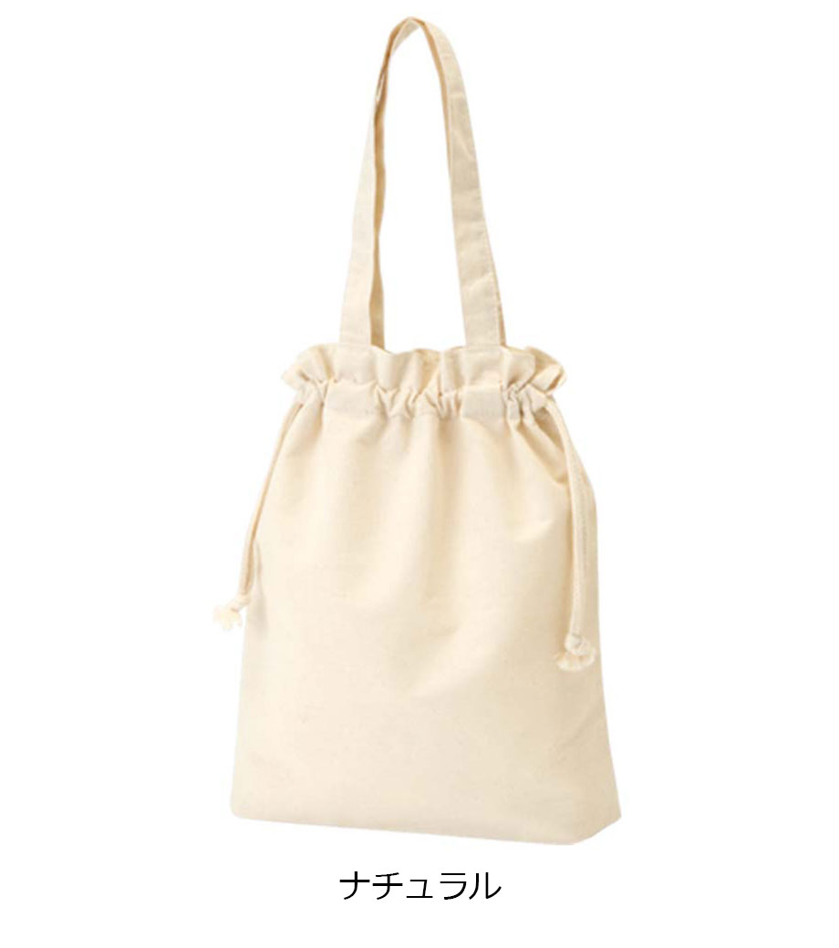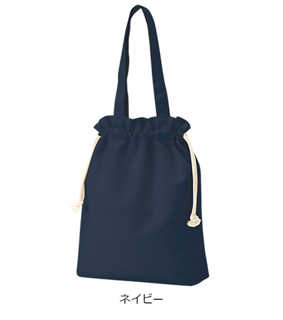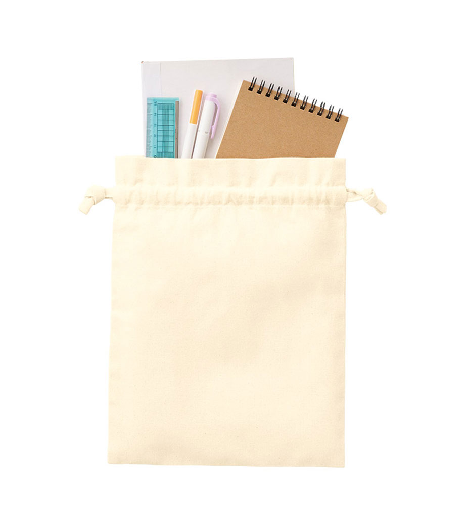 ベーシックで使いやすい5オンスの厚手コットン巾着。マチなしでちょっとしたガジェット入れや、詰め合わせギフト用袋にぴったりです。紐部分は共生地を使用。高級感のある印象です。