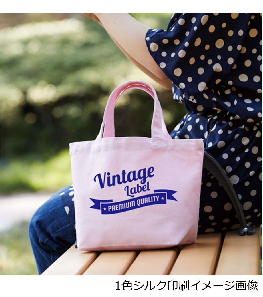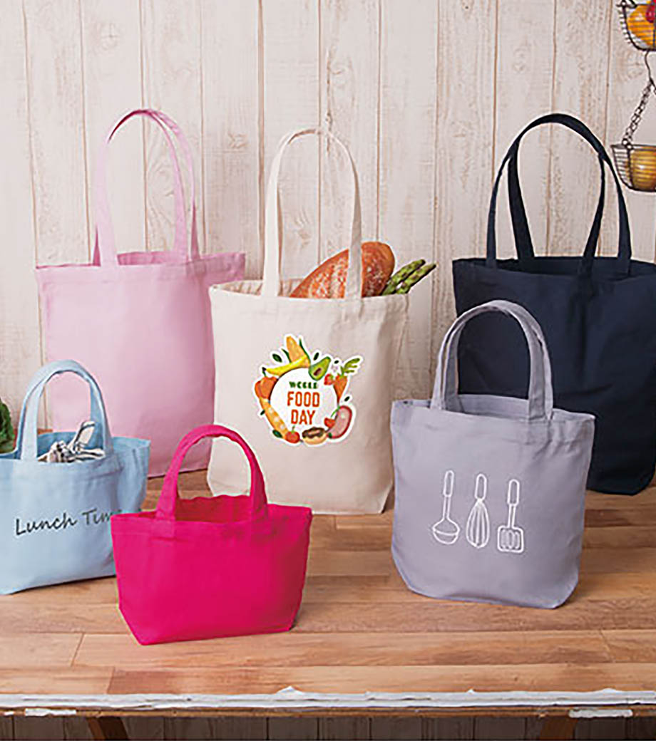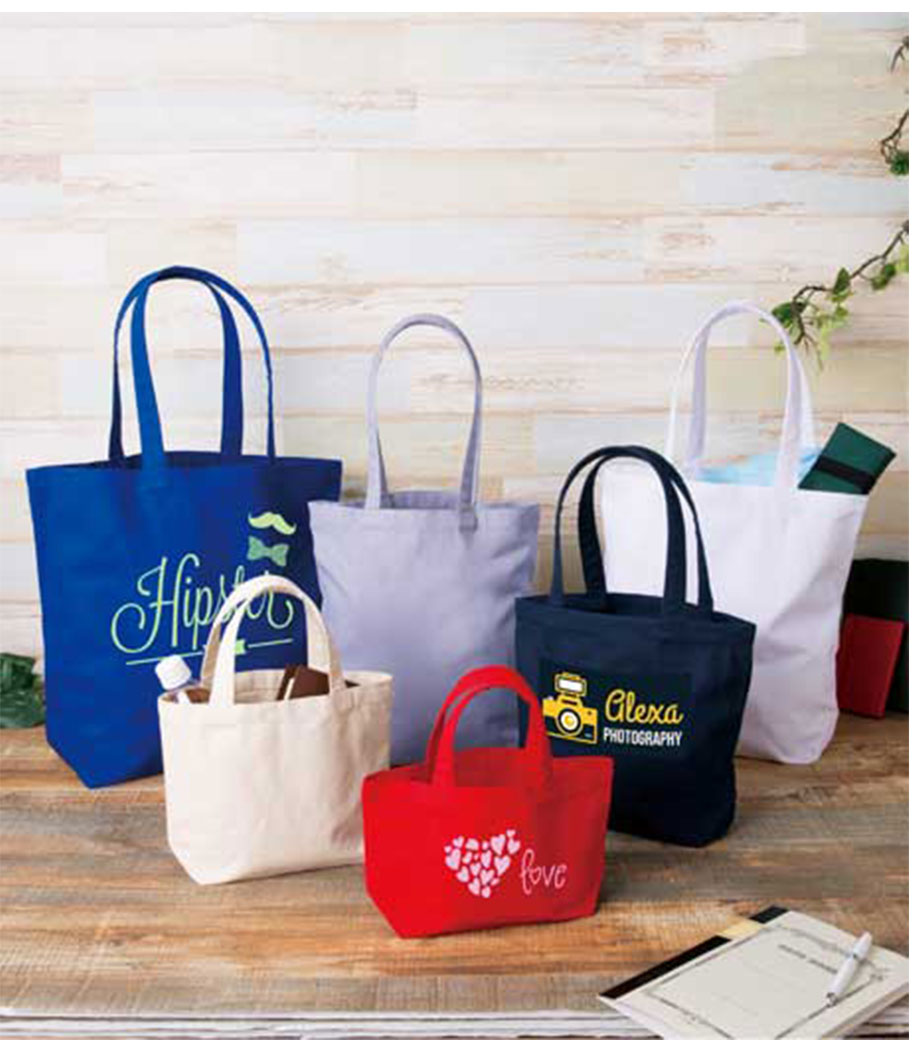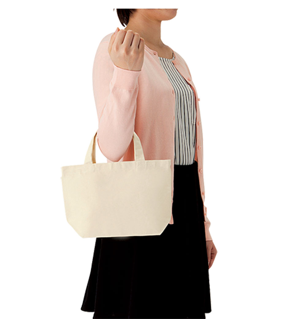 キャンバストート(S)は、コンパクトサイズなのに意外に入るミニバッグ。マチが広めで、安定感のあるデザインです。お弁当や小物などの持ち歩きにいかが。しっかりした生地でコットン100%のナチュラルな風合いが楽しめます。カラーバリエーションが豊富なので、企業カラーやイベント・展示会のイメージカラーにあわせてバッグを選ぶことができます。