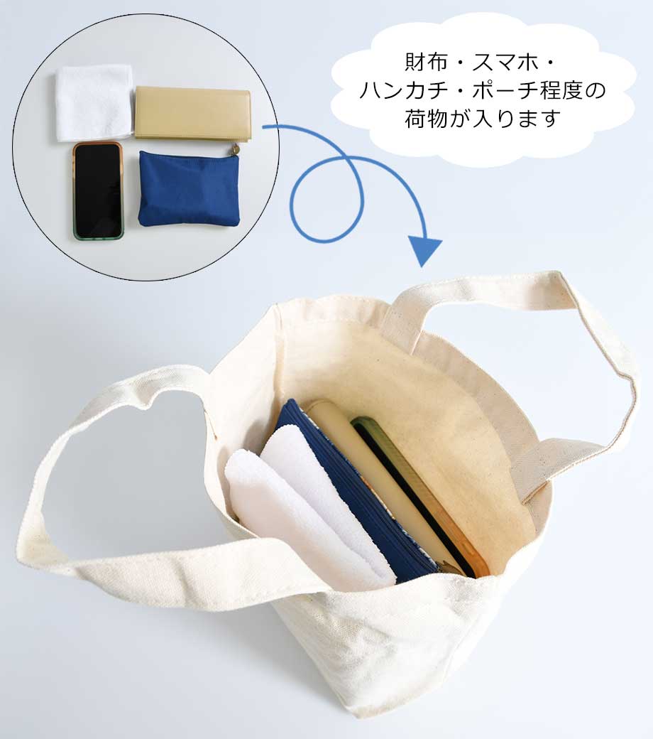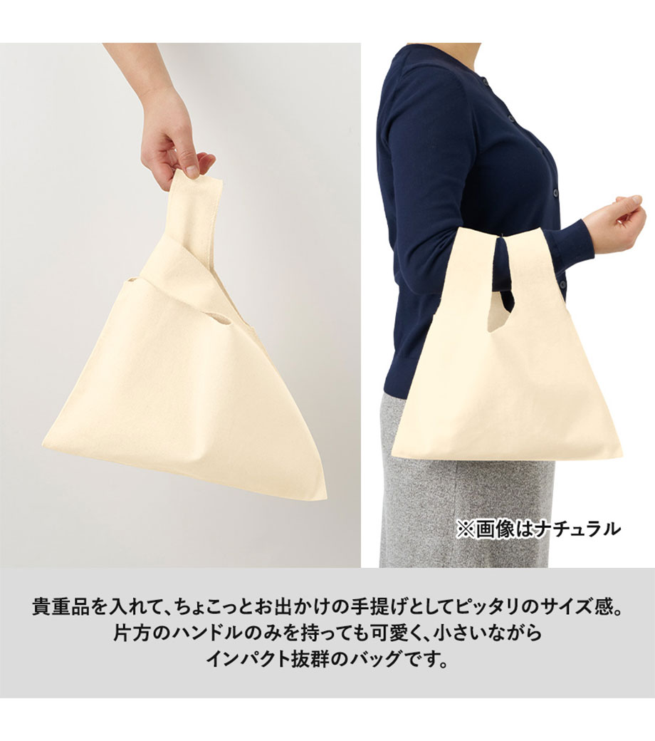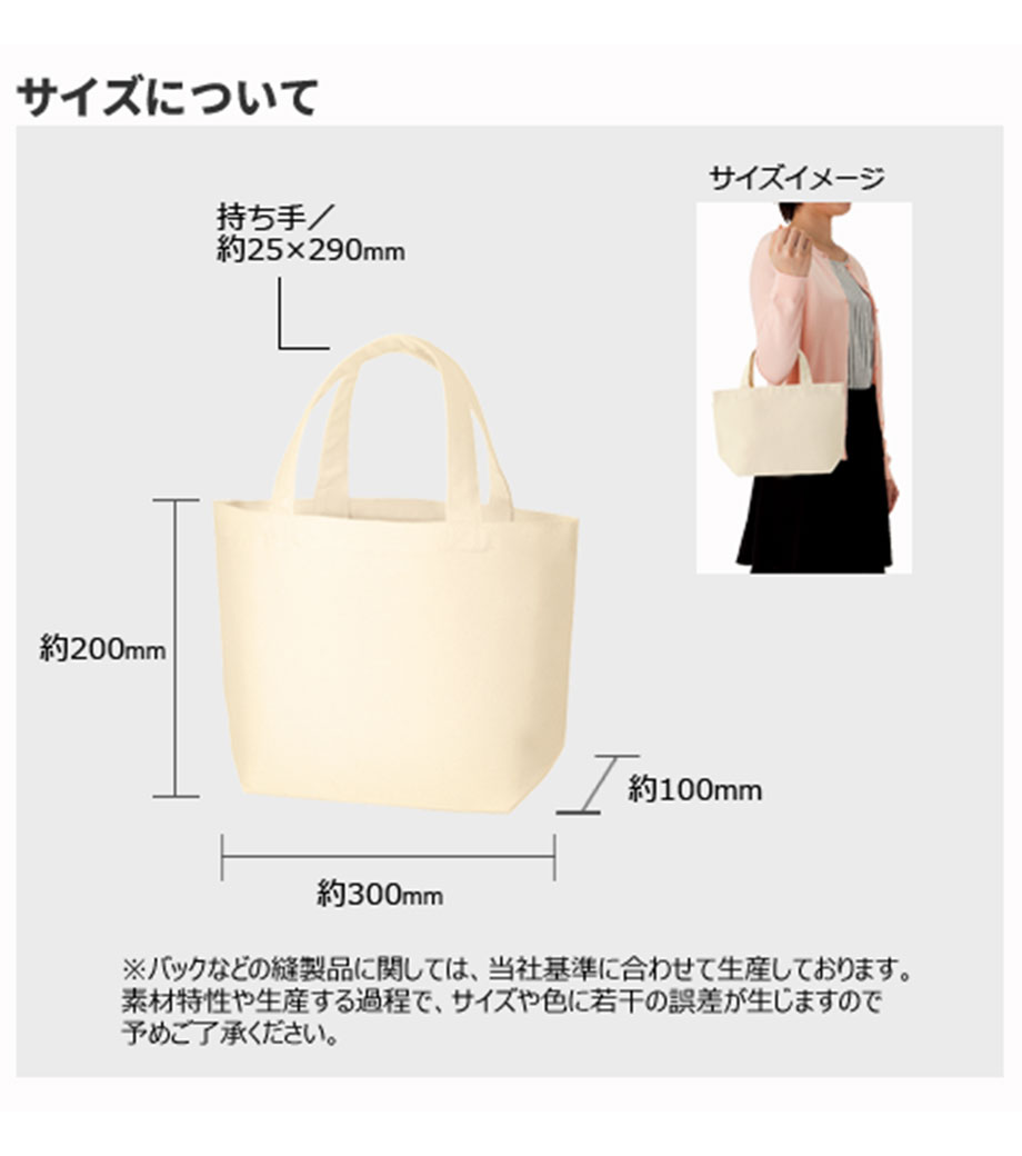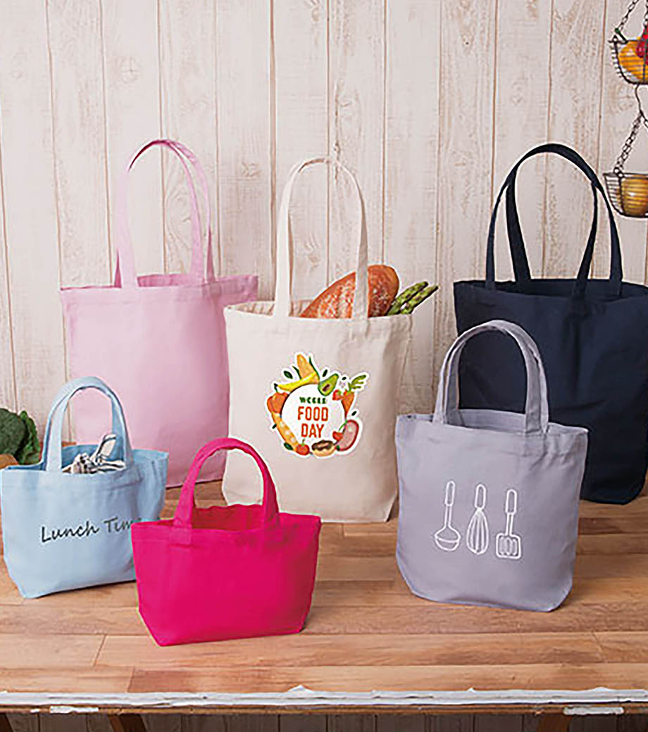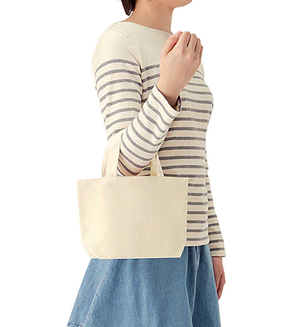 キャンバストート(S)は、コンパクトサイズなのに意外に入るミニバッグ。マチが広めで、安定感のあるデザインです。お弁当や小物などの持ち歩きにいかが。しっかりした生地でコットン100%のナチュラルな風合いが楽しめます。カラーバリエーションが豊富なので、企業カラーやイベント・展示会のイメージカラーにあわせてバッグを選ぶことができます。