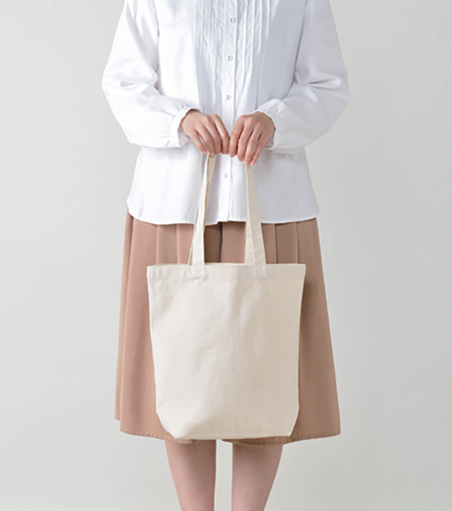 マチのないすっきりとしたフラットタイプで、「ちょっとそこまで」や、レッスンバッグなど使い方はいろいろ。シンプルなトートバッグは、名入れも映えますね。コットンとは一味違うシャンブリックで、ワンランク上のオリジナルバッグを作ってみませんか。