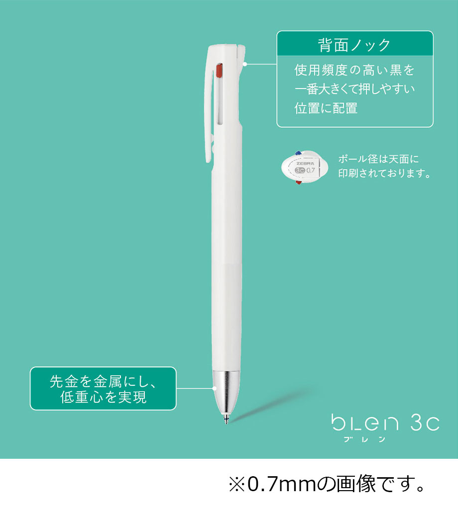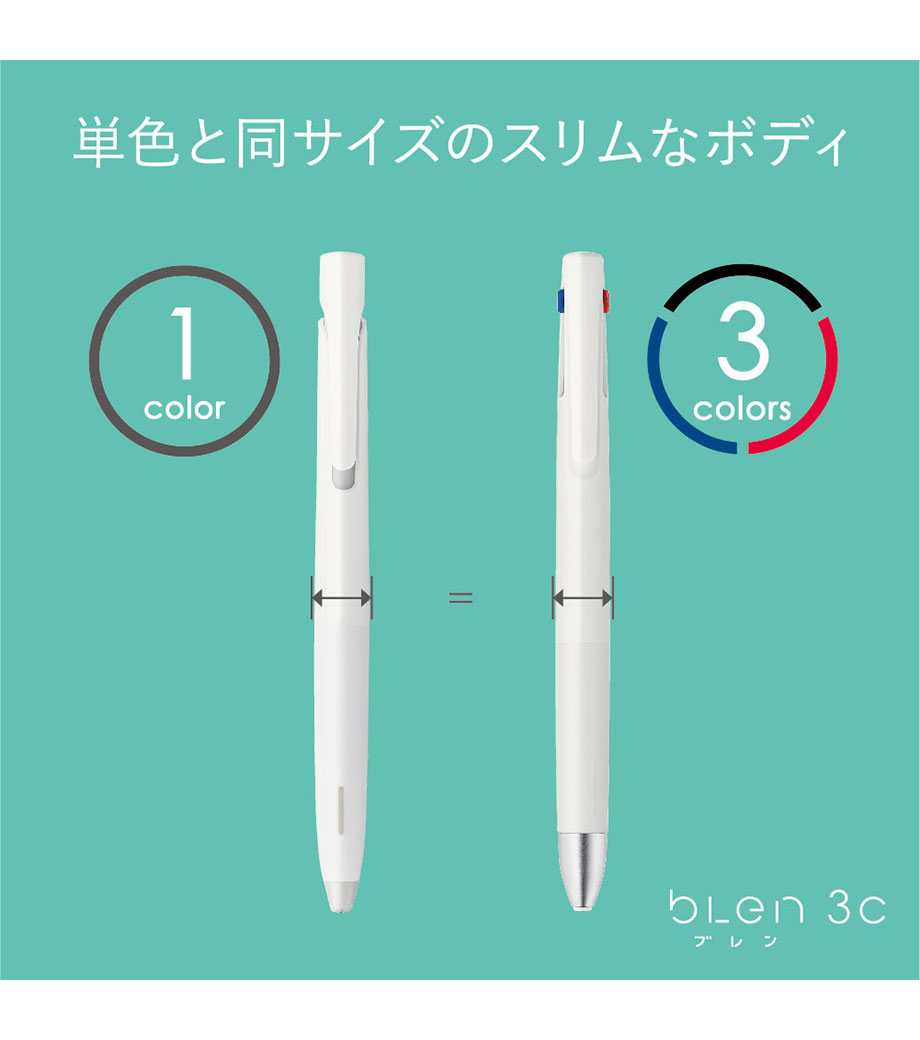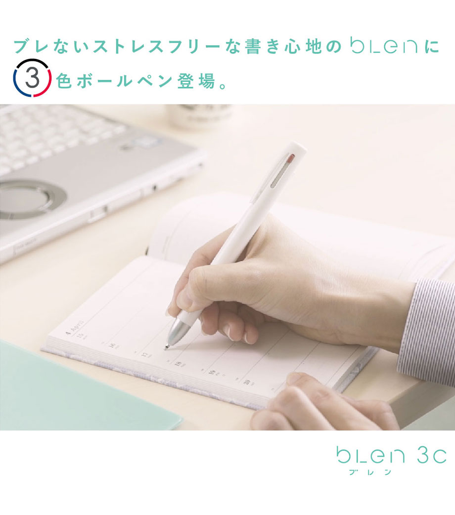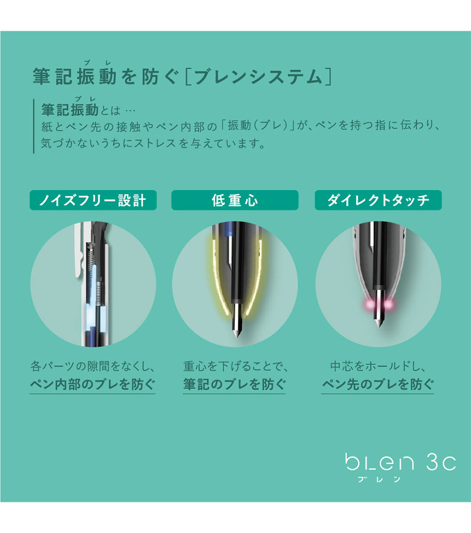 ゼブラ ブレン3C 0.5mmは振動(ブレ)がない3色ボールペンです。ボールペンで文字を書くときペンの芯がカタカタ音がしたことはありませんか?紙とペン先の接触やペン内部の「振動(ブレ)」がペンを持つ指に伝わり、気づかないうちにストレスを与えていると言われています。ゼブラ ブレン3C 0.5mmは筆記振動(ブレ)を制御したゼブラ独自の「ブレンシステム」でストレスフリーな書き心地です。