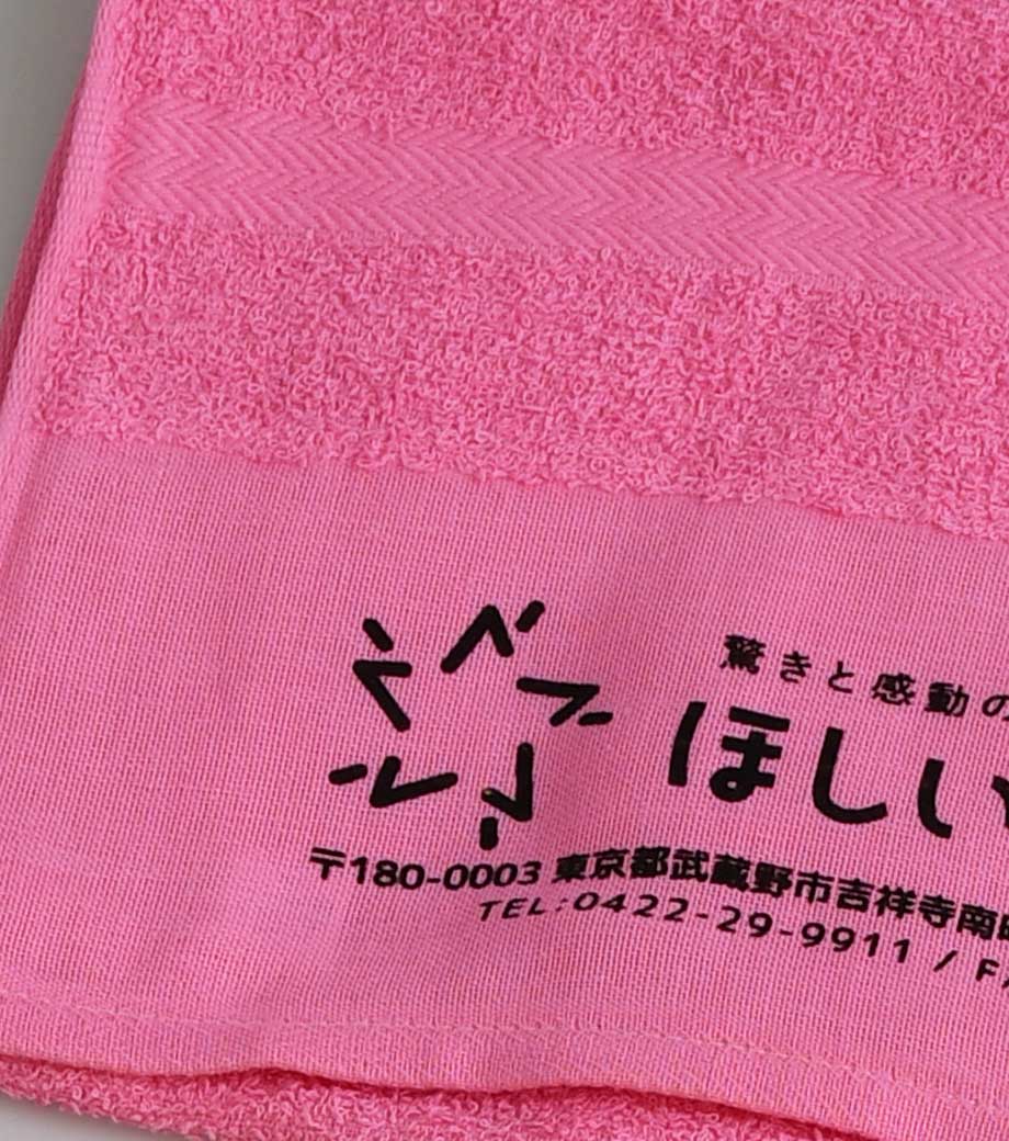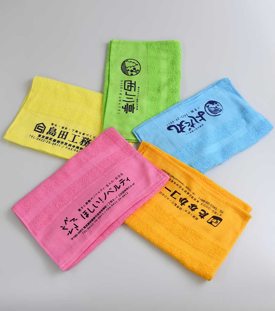 色落ちの心配がないので、企業名やロゴを名入れすれば販促効果が長続き!生活に馴染むサイズ感のオリジナルデザインタオルが製作できます。インパクトのある大きめな名入れデザインがおすすめです。