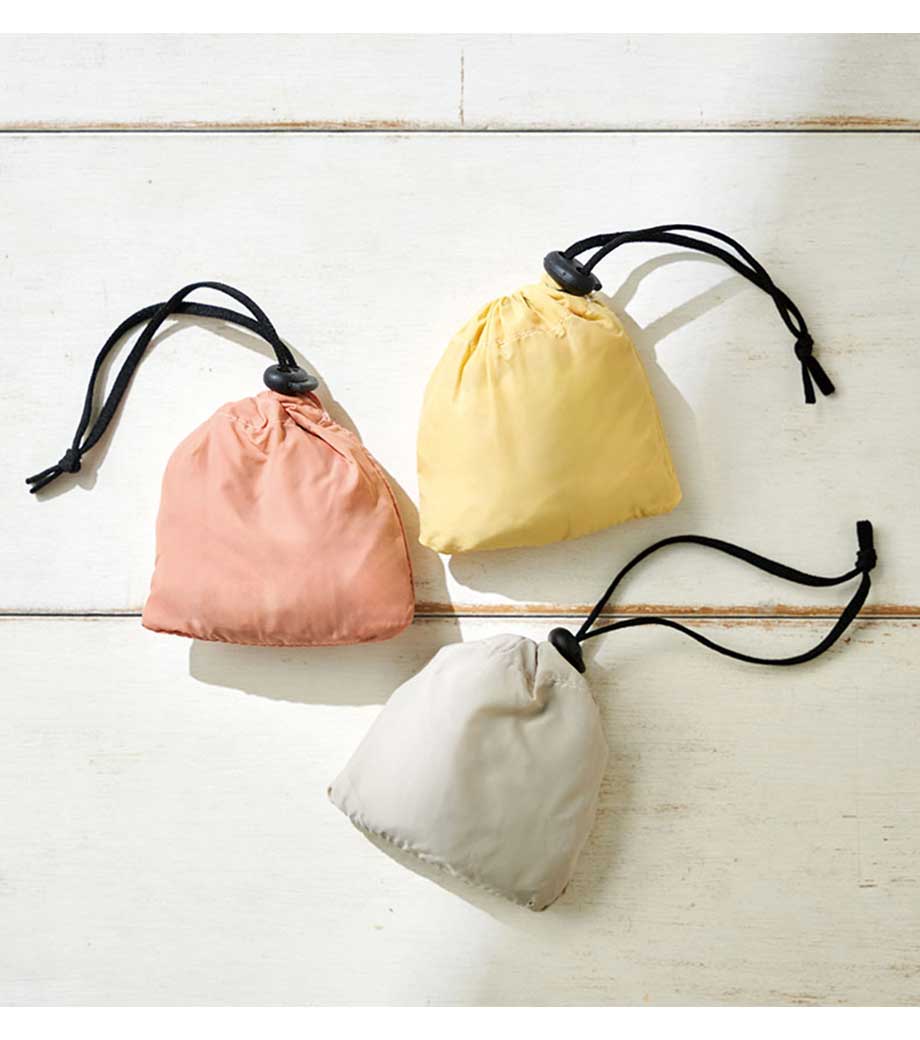 ポリエステル素材なので、汚れも落としやすく、薄くて丈夫。軽くてかさ張らないので、あらゆる場面で大活躍!コードストッパー付きで、簡単にしっかりと口を閉められて安心ですね。