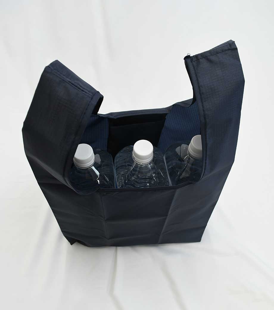 2Lのペットボトルが3本入る大きさなので、日常のお買い物でも活躍します。内ゴム付きでコンパクトに折りたためるから携帯にも便利。