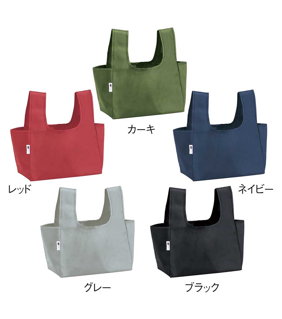1色印刷で表面に大きく名入れができます。スーパーや家電量販店などのキャンペーンノベルティにぴったり。5色展開なので、お好みの色を選んでいただけます。