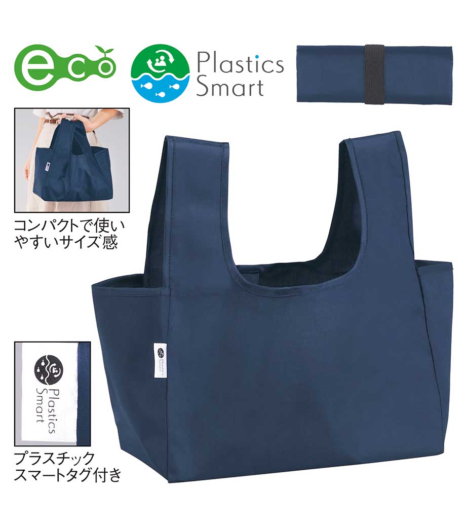 リフェロ・再生PETマイバッグは、回収された使用済みペットボトルを原料として生まれたエコバッグです。バッグ側面には「プラスチック・スマート」賛同商品の証であるタグつき。企業としてリサイクル意識の高さや環境問題への取り組みをさりげなくアピールできますよ。