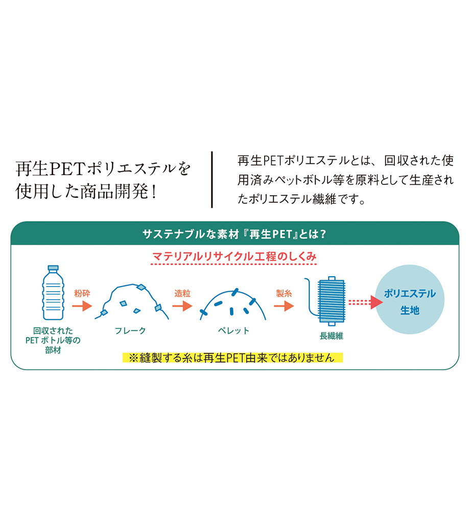 テラッソ/再生PETマルシェエコバッグは使用済みペットボトルから生産されたエコバッグです。柔らかな生地で広めの持ち手だから肩掛けが楽チン!沢山お買い物した時も安心です。使わないときは折りたたんで内側のゴムバンドで固定。ゴムバンドには「RE:USE」の文字が入っていて、SDGsのアピールにもなります。