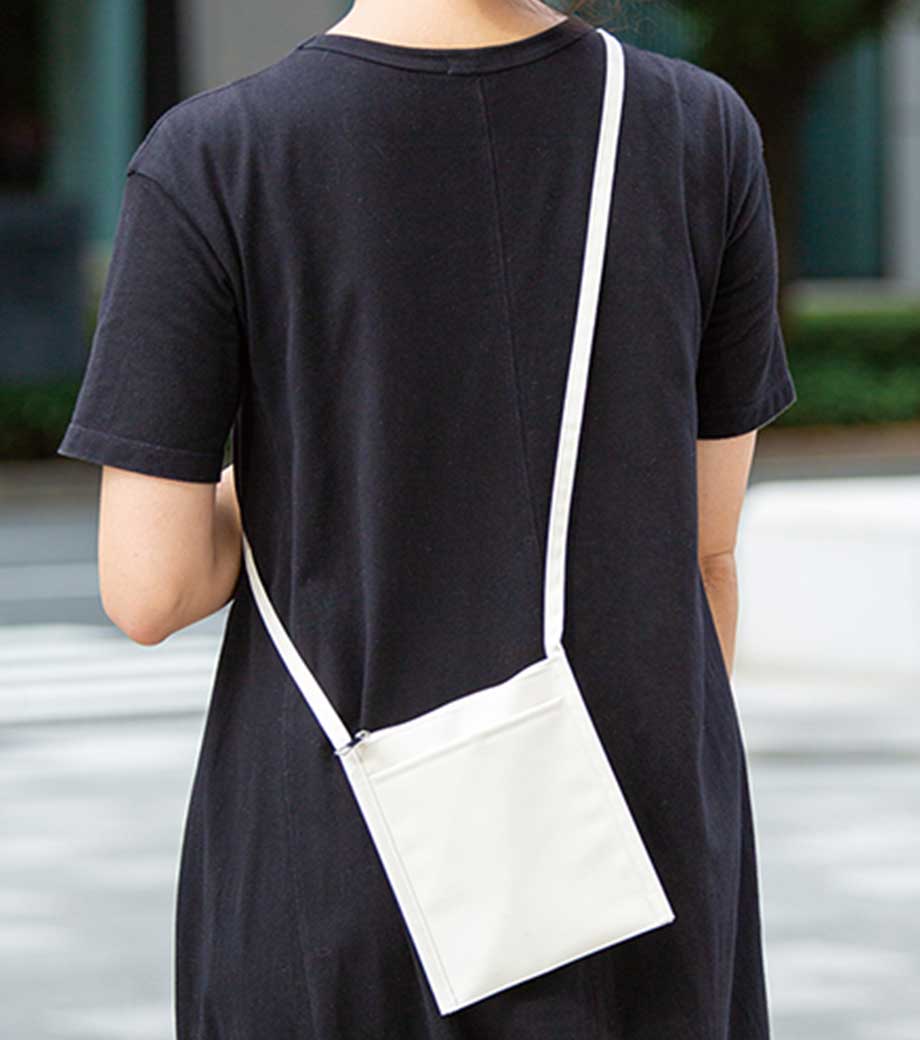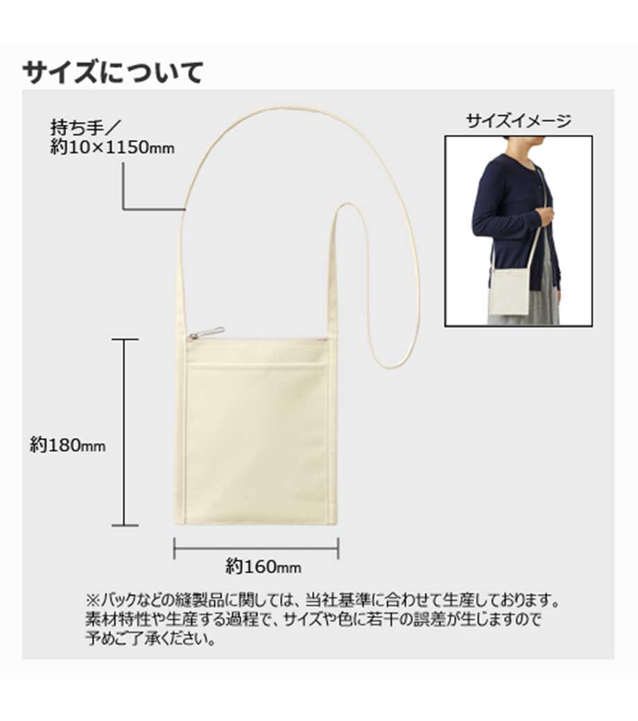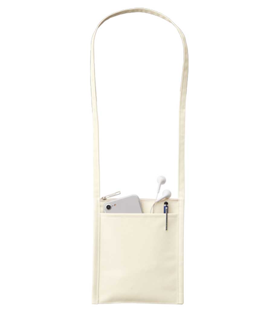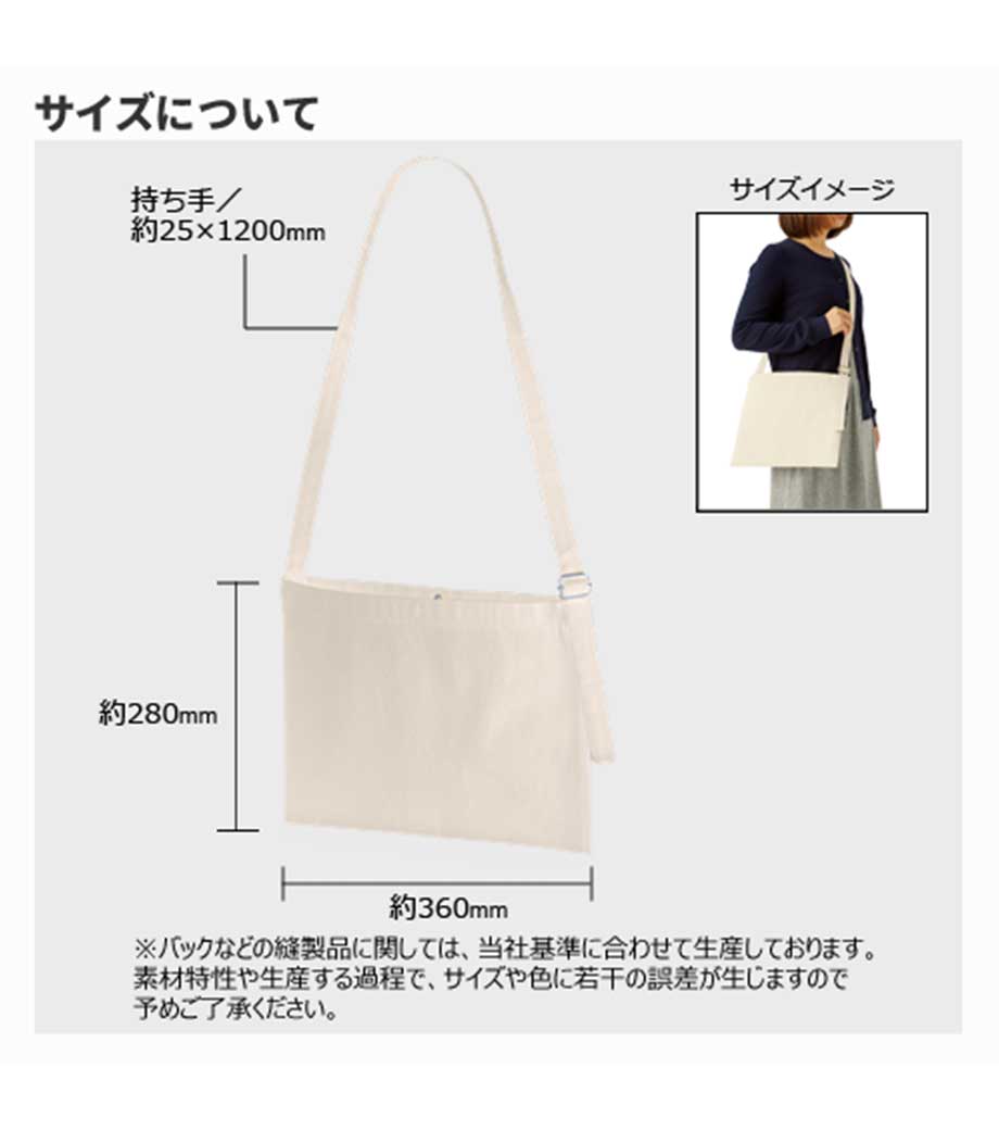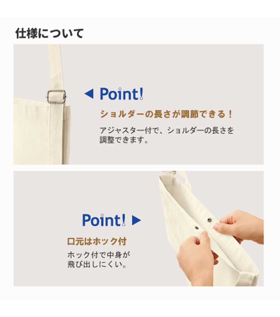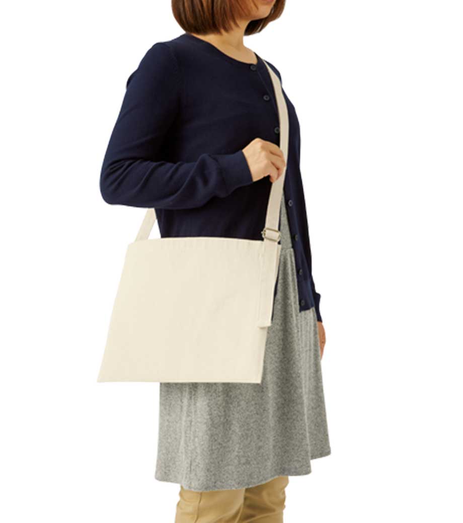 厚手コットンサコッシュは、A4サイズも収納可能なヨコ型のスタイリッシュなバッグ。目が詰まった5オンスの生地を使用しているので、軽量でやわらかさを残しつつ中身が透けにくい仕上がりになっています。名入れがよく映えるシンプルなデザインで、資料が多くなりがちな展示会やオープンキャンパスのノベルティにピッタリです。