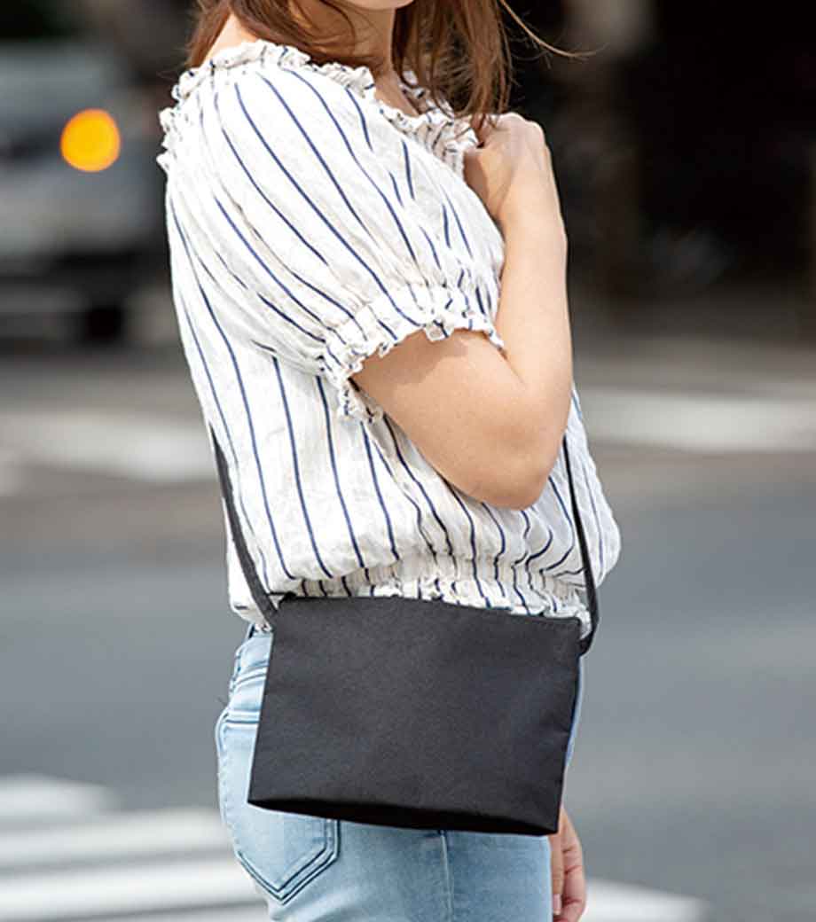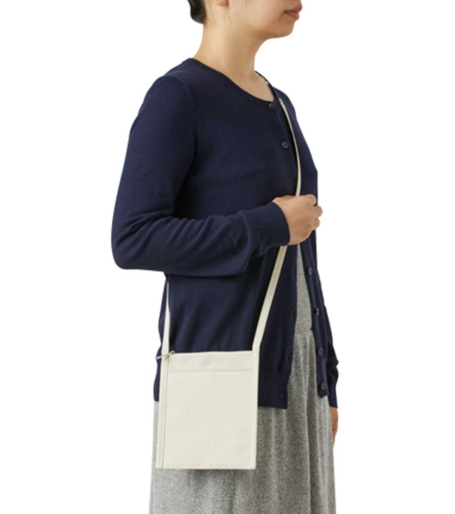 デイタフ・テントクロスポケット付きサコッシュ(撥水加工)の表面には撥水加工がしてあります。水や汚れに強く雨の日のお出掛けやアウトドアでも安心です。長財布やスマホなどの貴重品を肌身離さず持ち運びできる便利なサイズ。最低限必要な防災グッズを入れて玄関・寝室に置いておいても邪魔になりません。ハンカチなど小物が入るフロントポケット付きです。