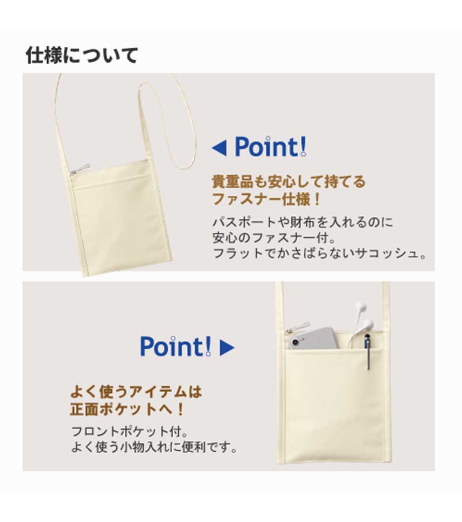 フロントポケットミニサコッシュは、ファスナー付なのでアクティブなシーンや貴重品バッグに安心なコンパクトなサコッシュです。買い物に必要なスマホやICカードが収納できます。普段は斜め掛けに、紐を結び長さを変えて肩掛けにと気分やコーディネートで使い分けいただけます。シンプルなデザインで男女を問いません。