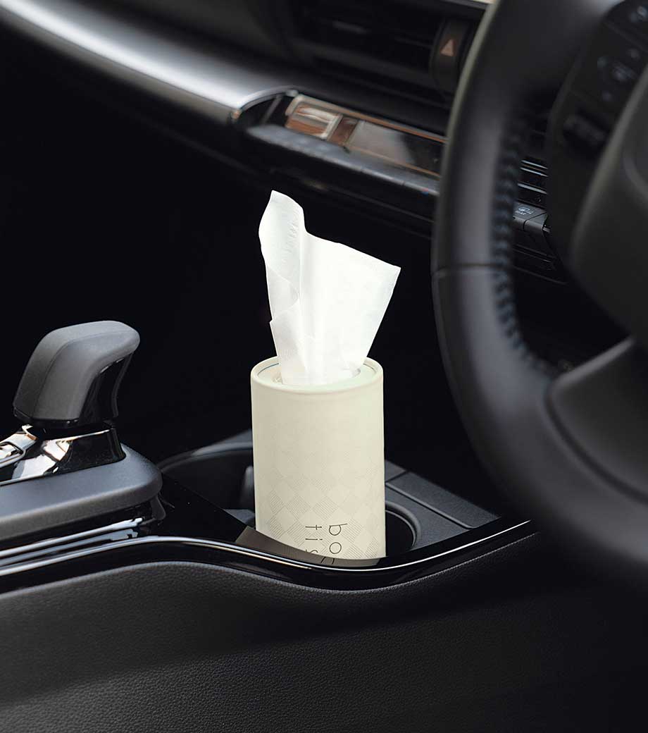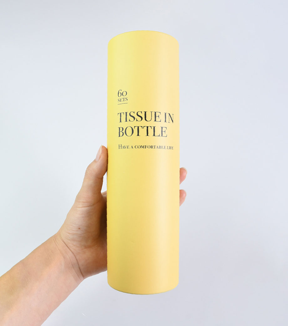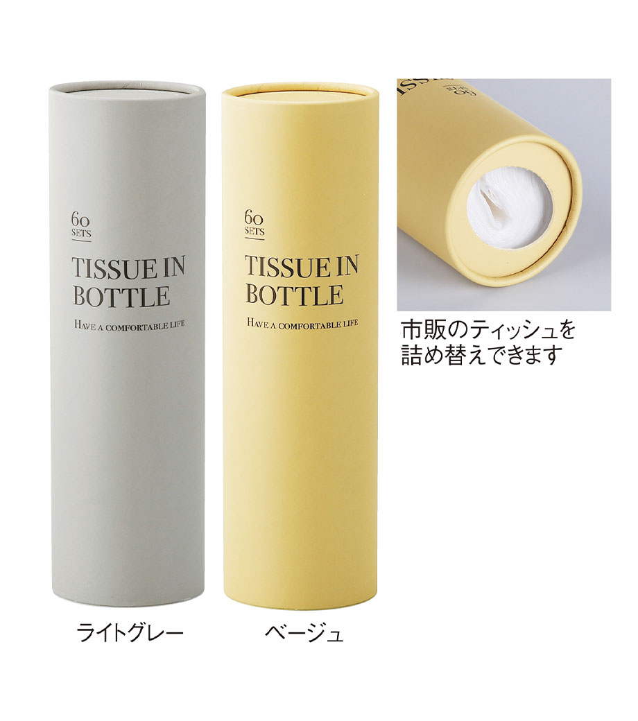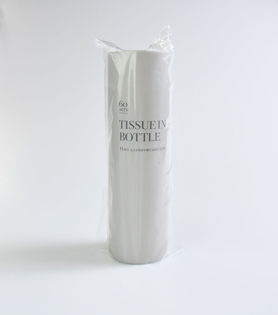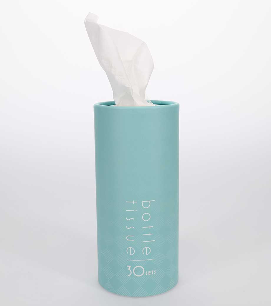 スリムでコンパクトなボトルタイプのティッシュペーパー。車のカップホルダーに収まるサイズです。オフィスのデスクなど限られたスペースでもかさばらないのがうれしい。使い切ったら市販のボックスティッシュの中身を入れることも可能です。(枚数・サイズは要調整)