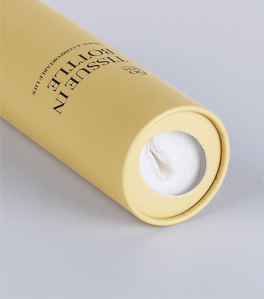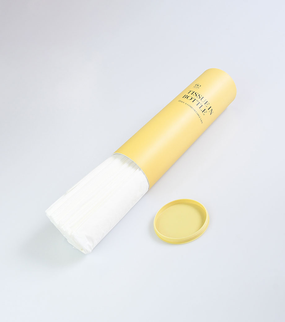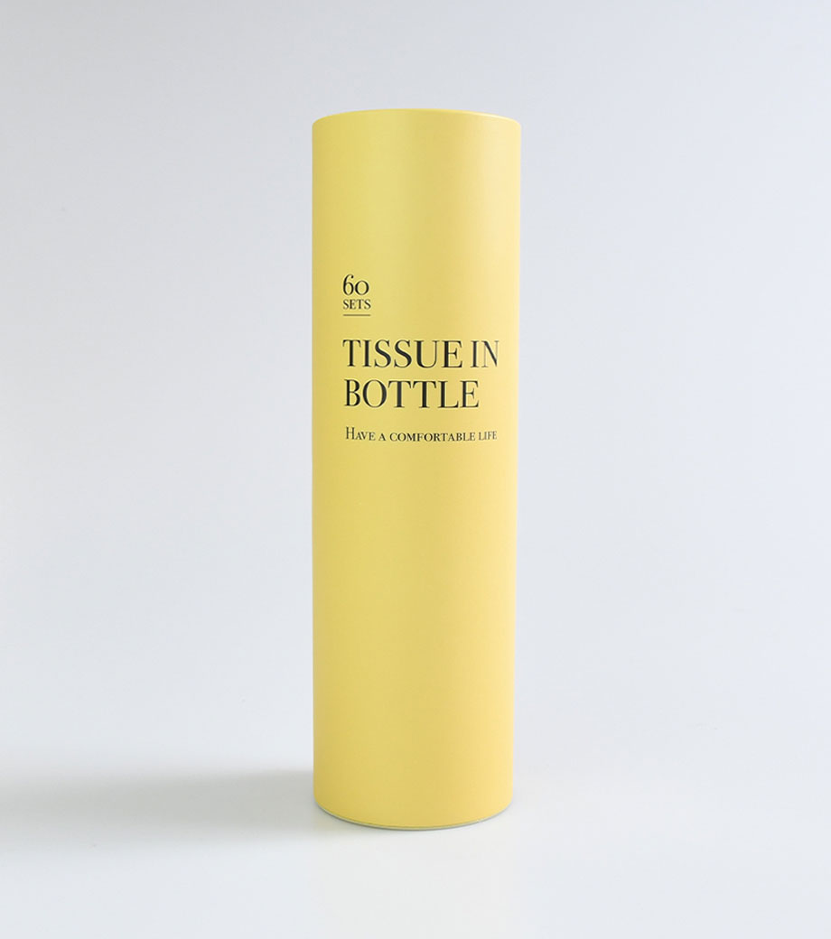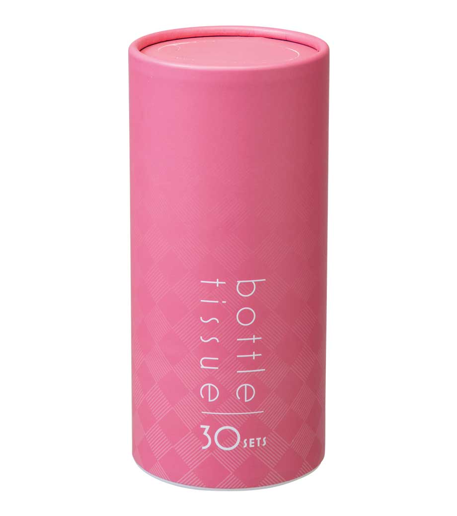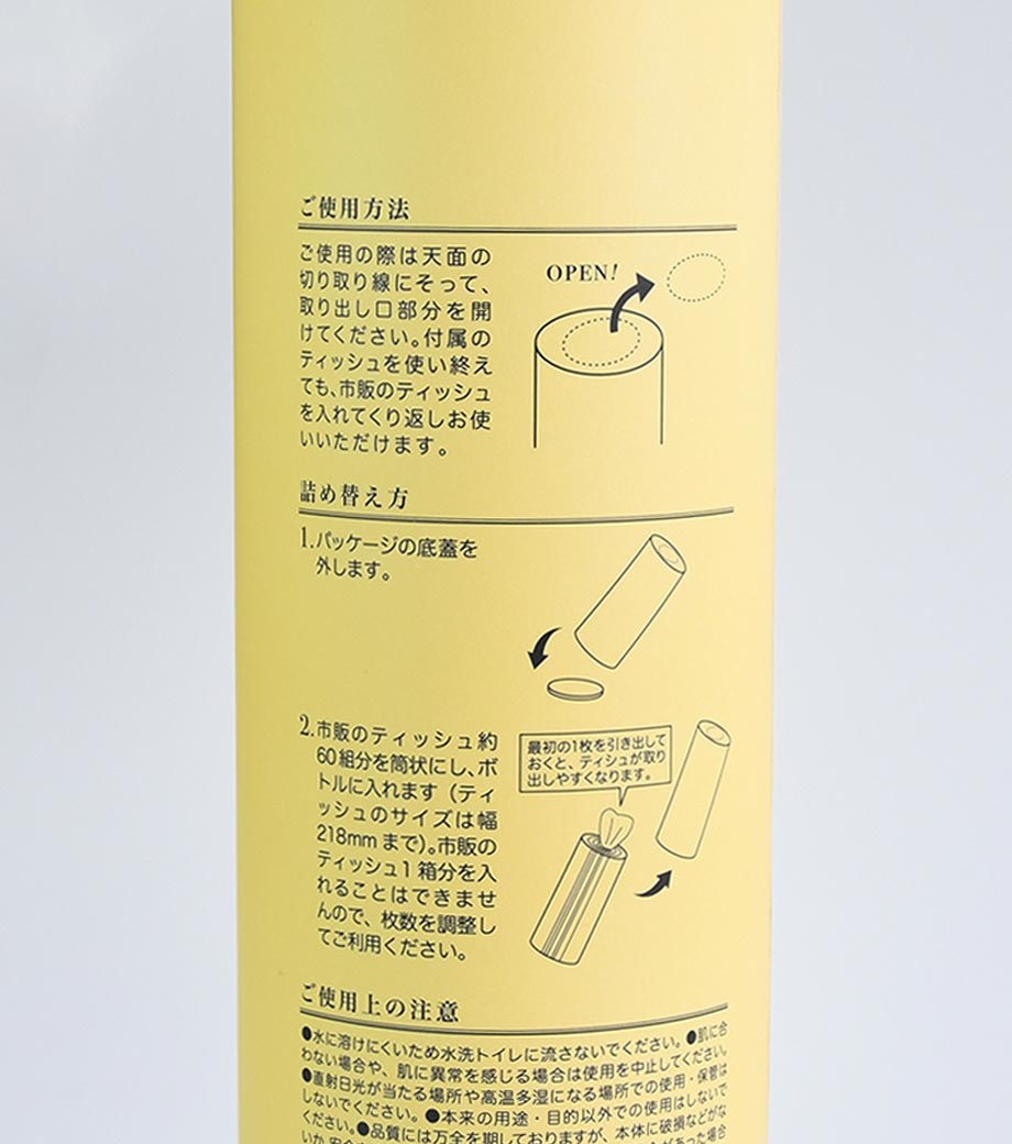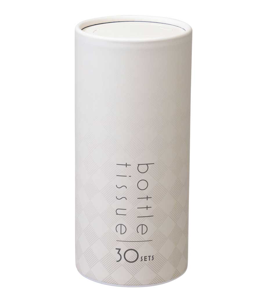スリムでコンパクトなボトルタイプのティッシュペーパー。車のカップホルダーに収まるサイズです。オフィスのデスクなど限られたスペースでもかさばらないのがうれしい。使い切ったら市販のボックスティッシュの中身を入れることも可能です。(枚数・サイズは要調整)