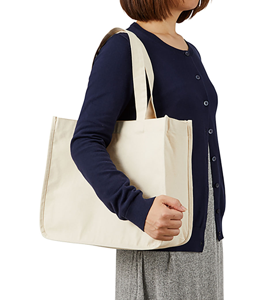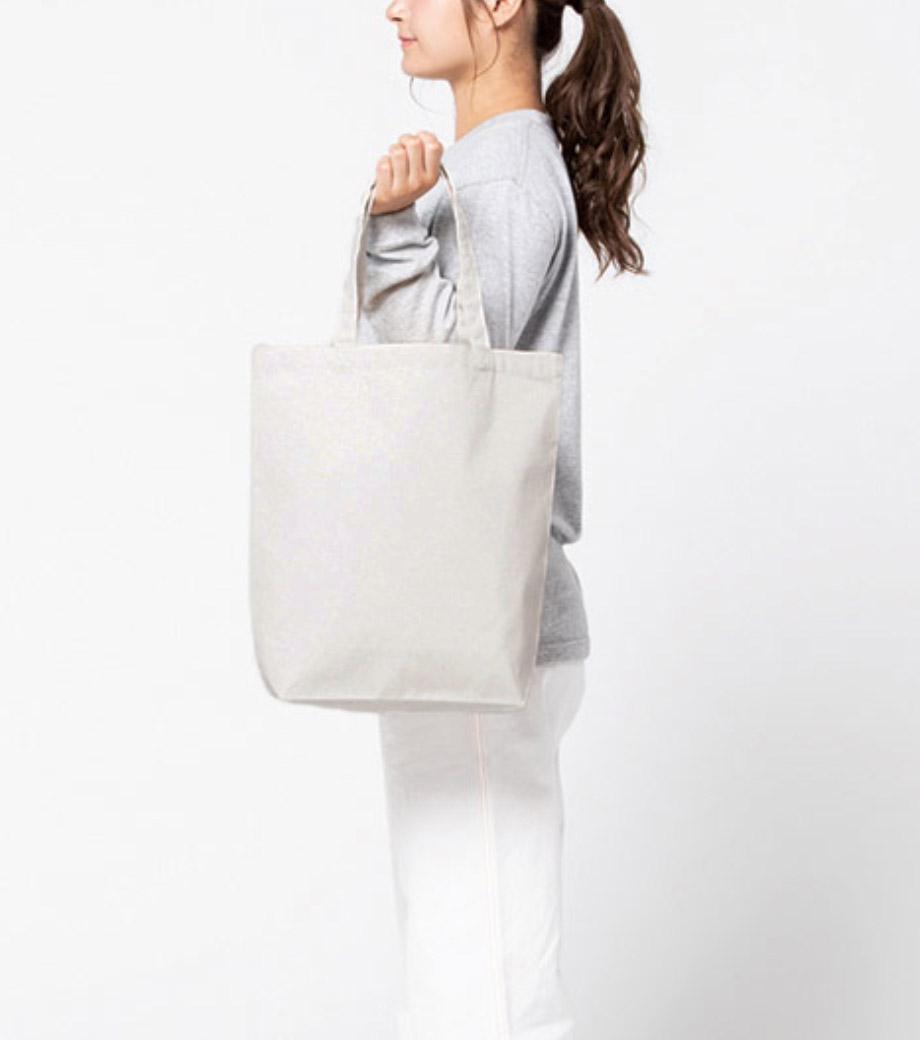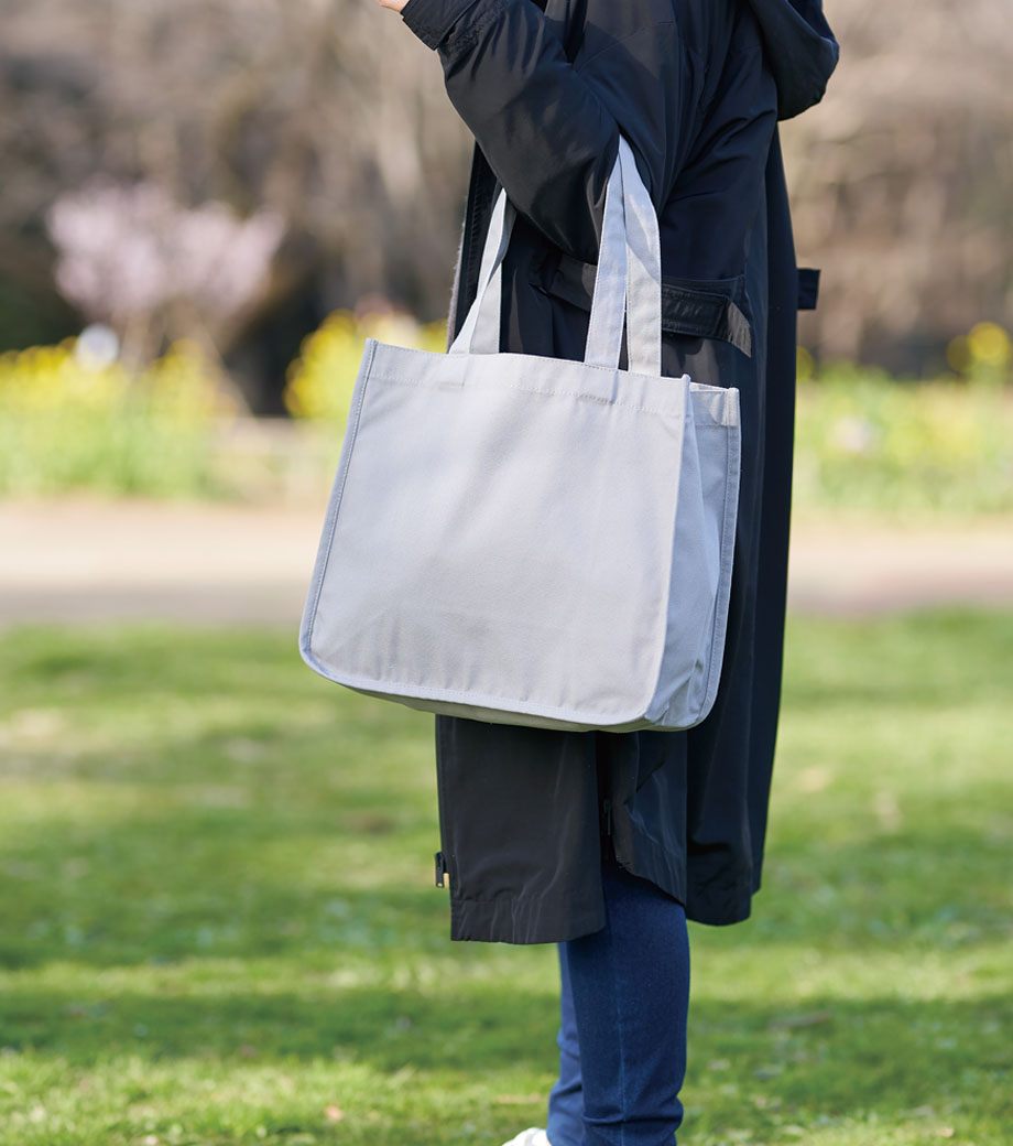 生地は丈夫で厚みのある12オンス生地を採用しています。しっかり収納できるマチ付きで、2Lペットボトルが縦に丁度入る大きさ。普段使いにピッタリなカジュアルなデザインは、世代を問わずお使いいただけます。
