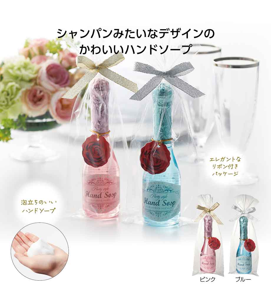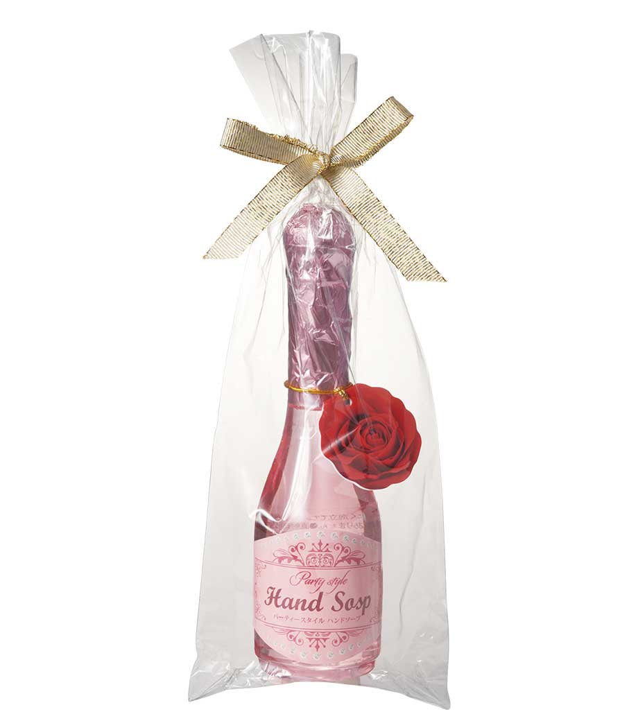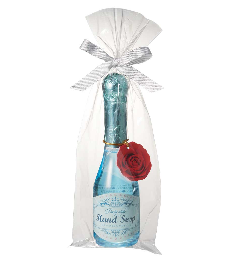 シャンパンボトルのパッケージが目をひくハンドソープ。ゴージャスでエレガントな雰囲気は結婚式やお店の開店祝い、周年記念などおめでたい日のプチギフトにピッタリです。