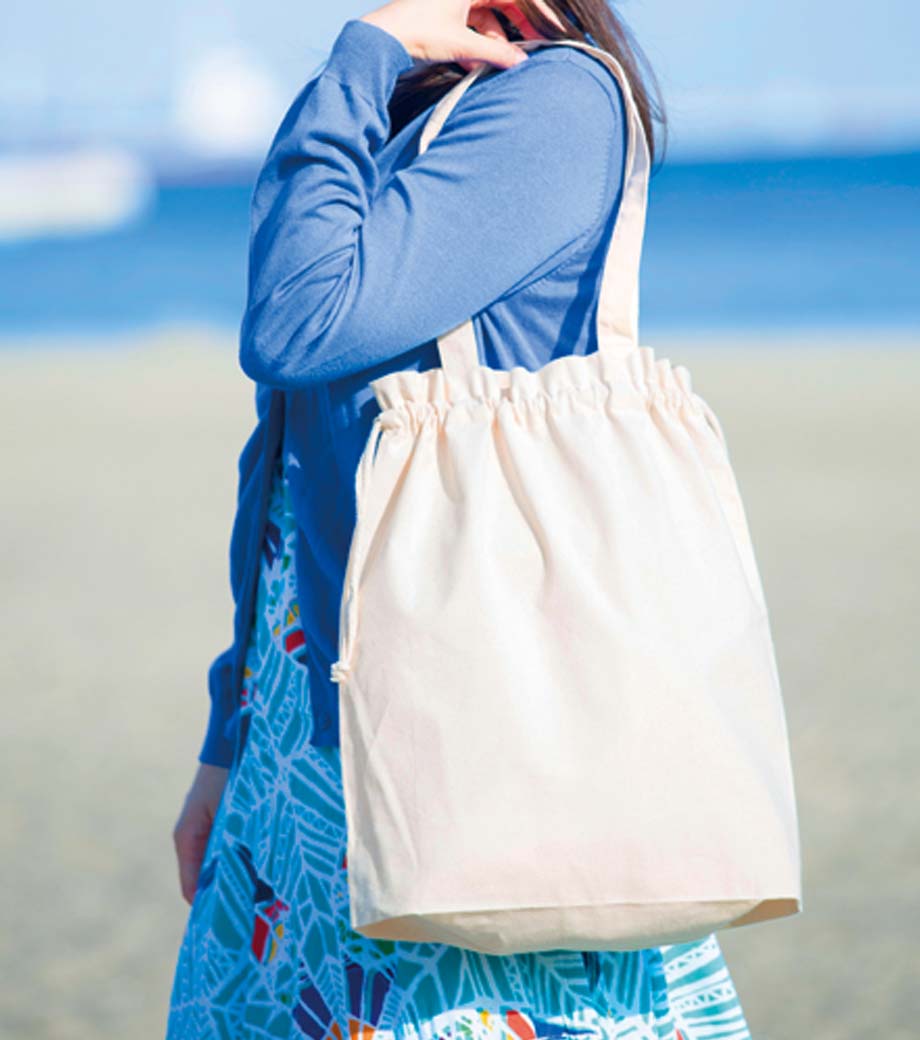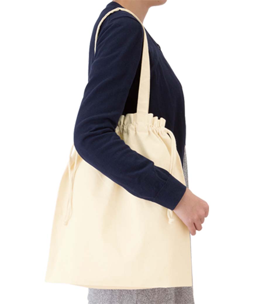 「厚手コットンガゼット巾着トート(L)」は、口がキュッと閉まる巾着タイプのトートバッグ。中身が外から見えないので、貴重品を入れても安心。マチ付でたっぷり入るので、通学のメインバッグや、買い物のエコバッグとしても利用できます。数日の出張や旅行の際に衣服を入れてキャリーバッグにしまえば、コンパクトに荷物をまとめられますよ。