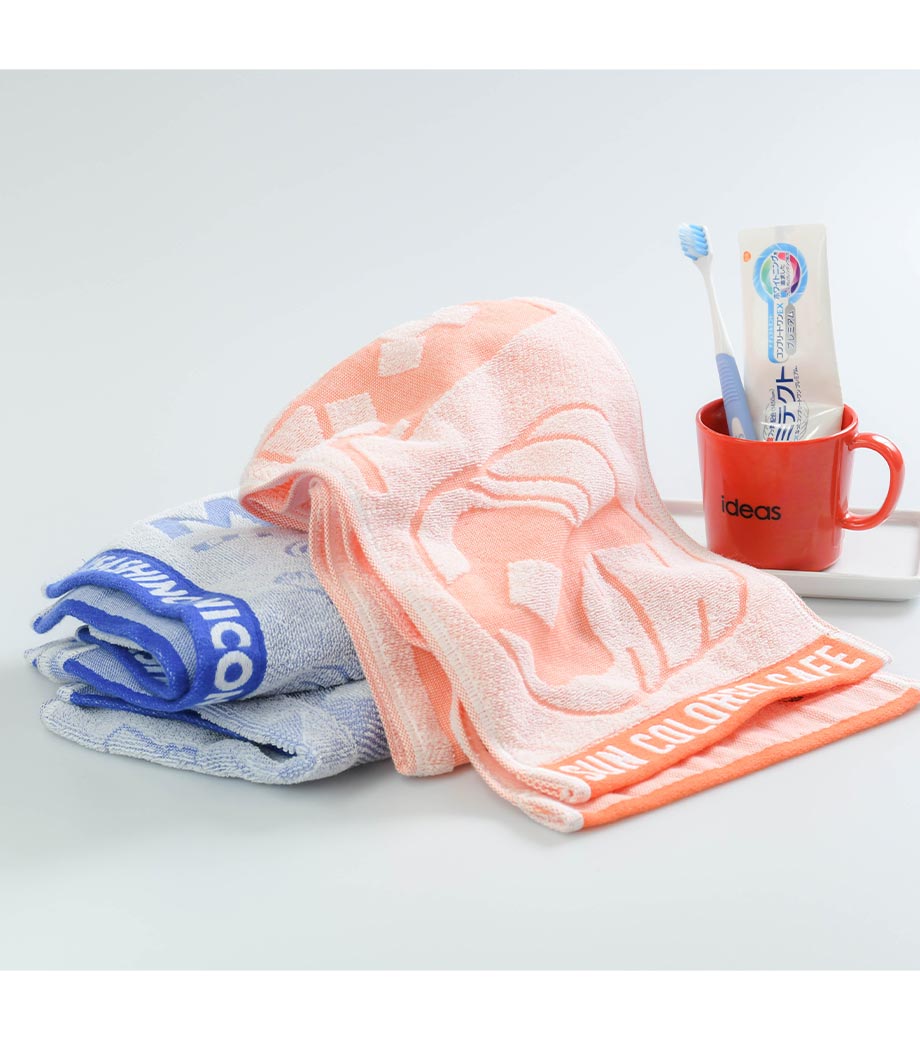 自宅でもオフィスでも活用できるフェイスタオルは、ご成約記念品からイベント配布用のノベルティまで幅広く使えます。「上げ落ちジャガード織り」と呼ばれる特徴的な織り方で、イラストや文字の濃淡を表現。タオル独自の風合いを活かした、高級感ある仕上がりになります。日本製で綿100%の生地なので、肌に優しい触り心地です。