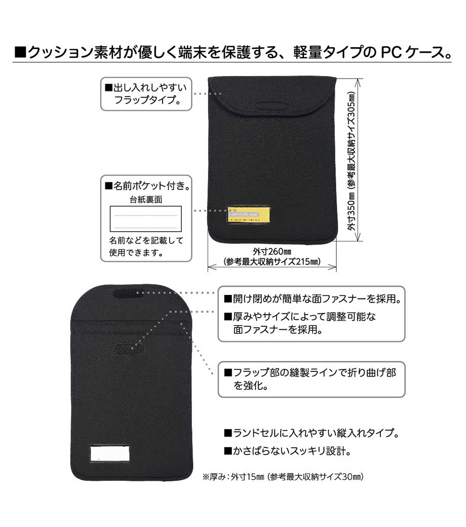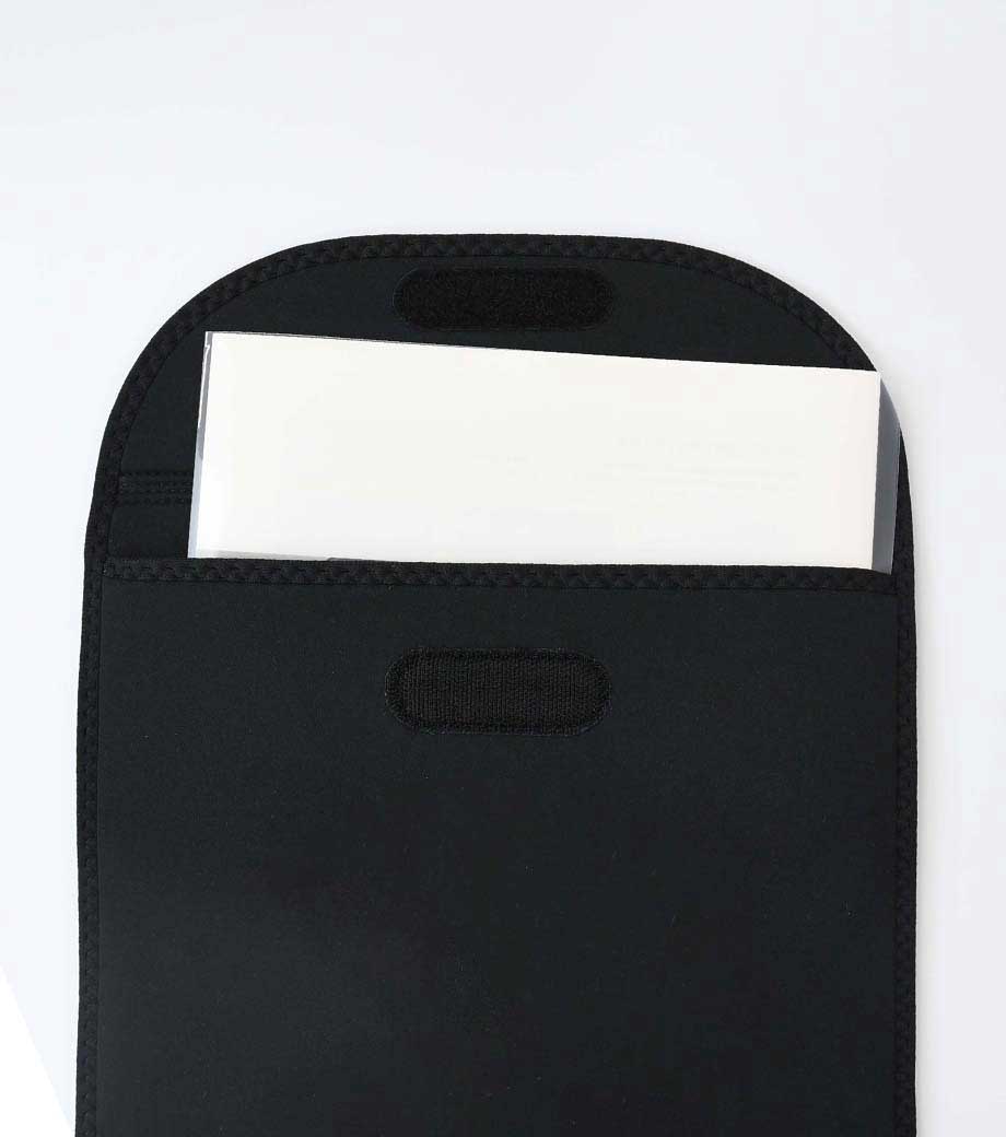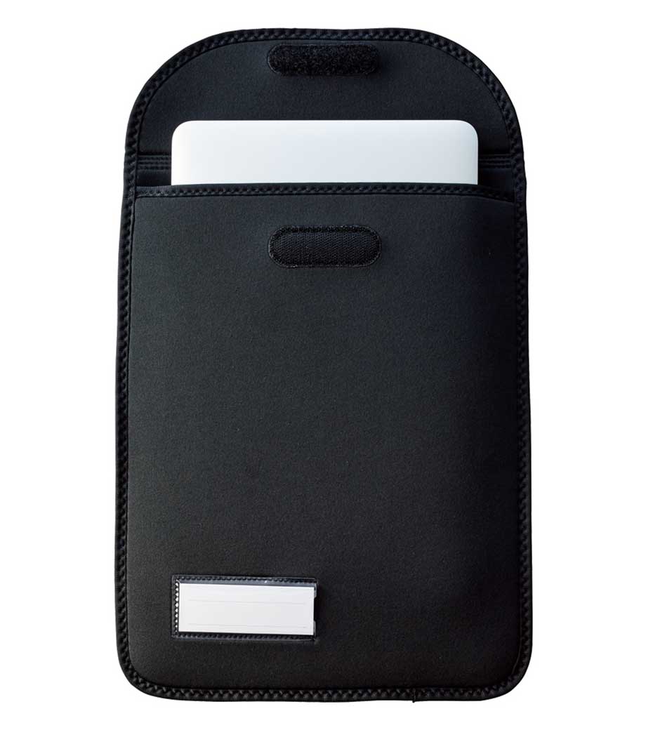 柔らかく弾力のあるウレタン素材で、クッション性抜群。PCやタブレット端末に傷が付きにくく、やさしく保護してくれます。加えて62gという軽さ!フラットタイプでかさばらず、鞄への出し入れもスムーズで楽々です。開け閉めも簡単な面ファスナーは厚みやサイズによって調整可能です。誰の持ち物かすぐにわかるよう名前ポケット付きです。