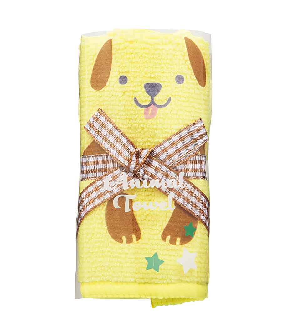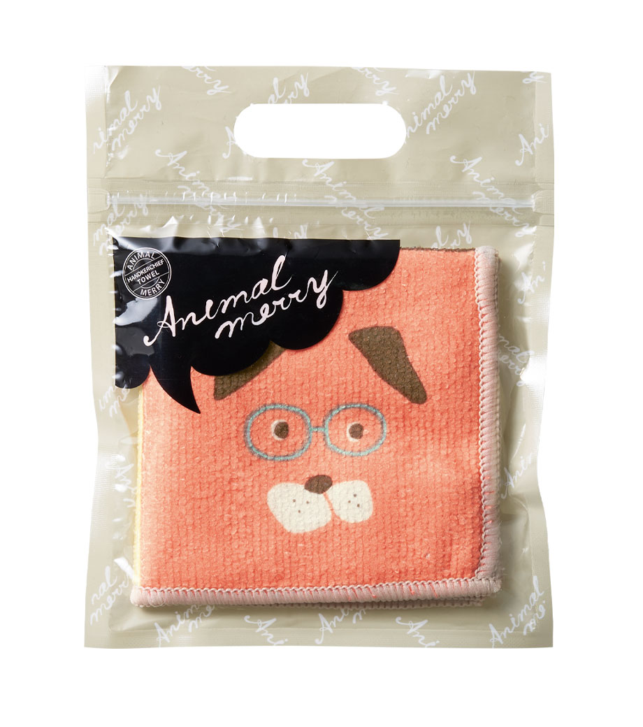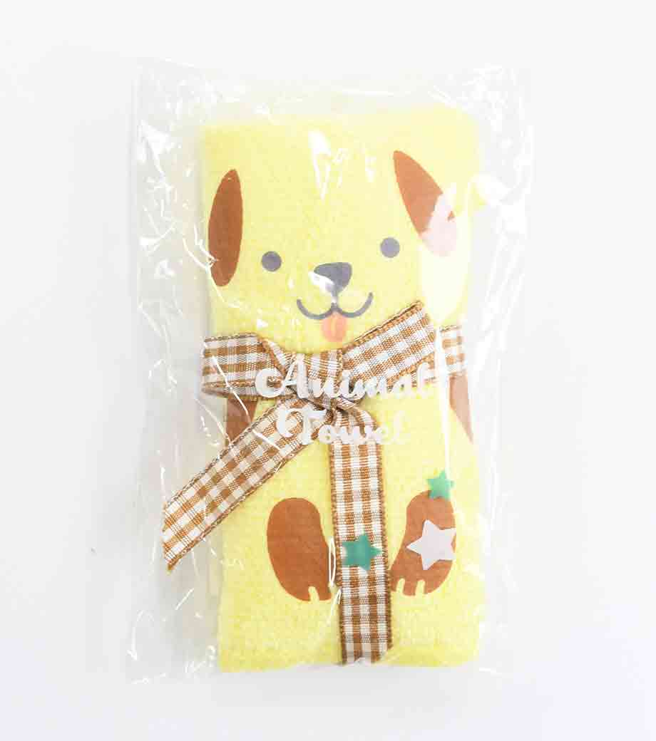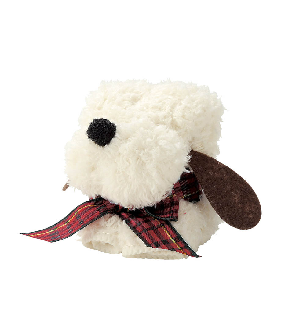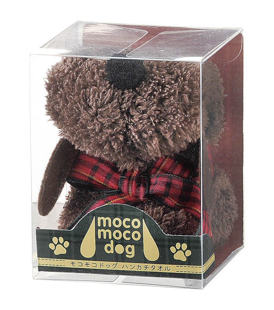 ふわふわの肌触りのタオルハンカチを、小犬の形に折りたたんでパッケージ。リボンをほどいて広げると、吸水力のあるタオルハンカチになります。手頃な価格なので、プチギフトにも最適。