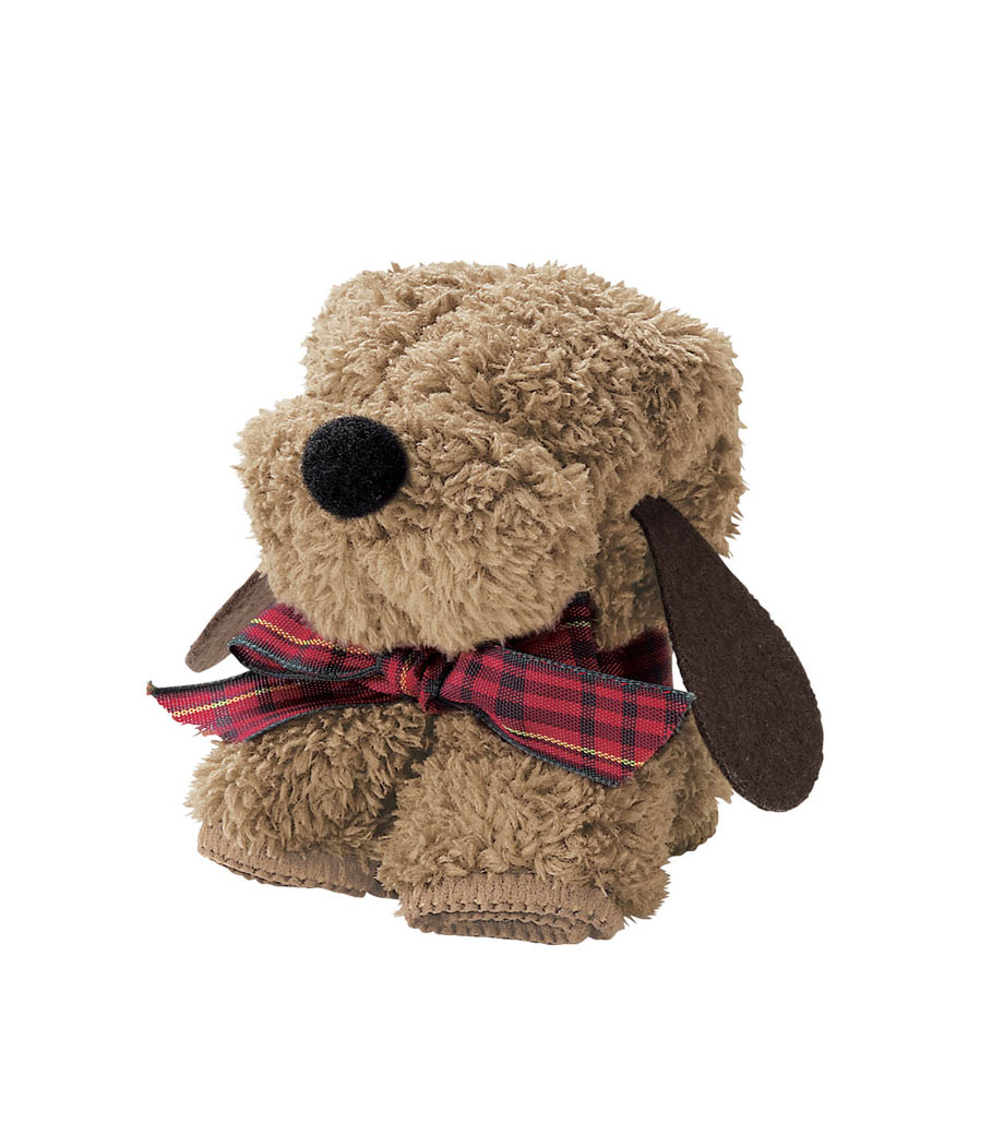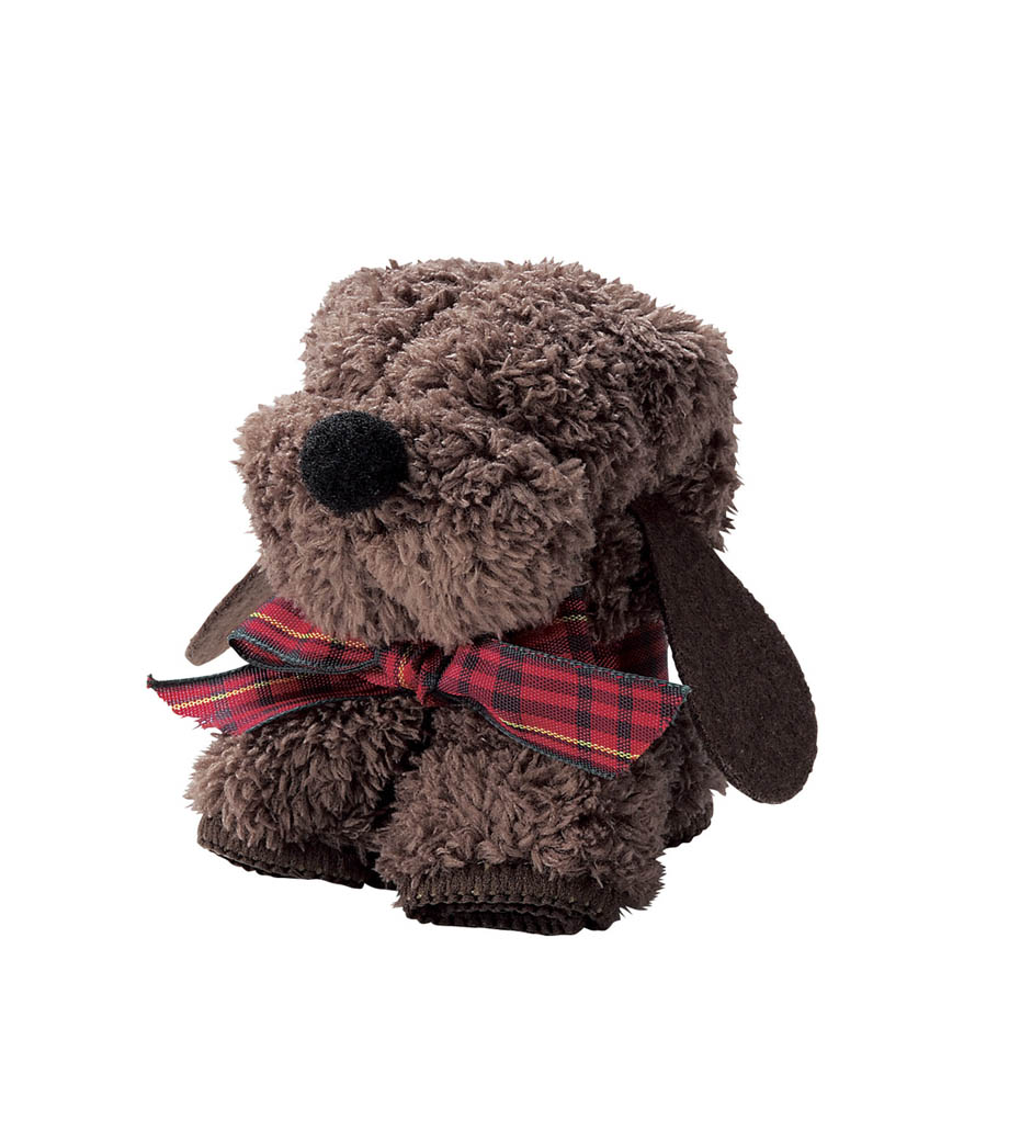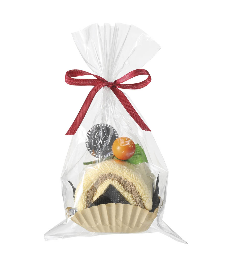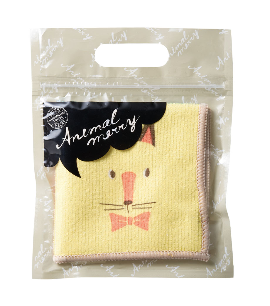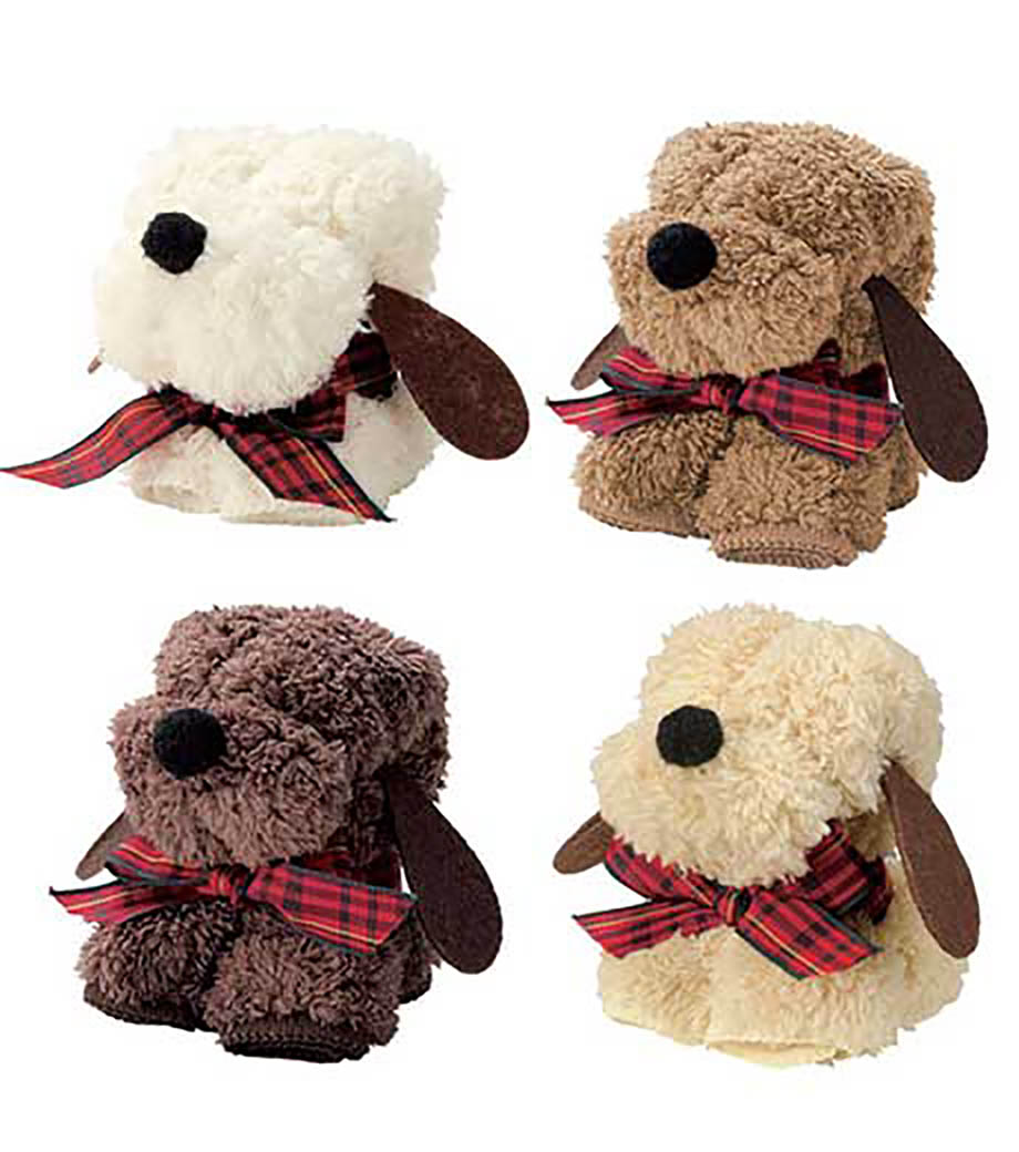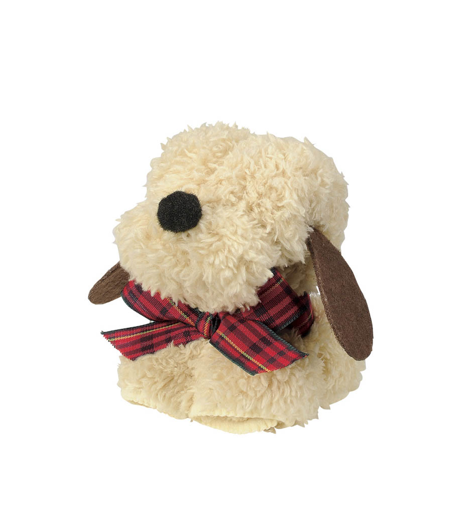 ふわふわの肌触りのタオルハンカチを、小犬の形に折りたたんでパッケージ。リボンをほどいて広げると、吸水力のあるタオルハンカチになります。手頃な価格なので、プチギフトにも最適。