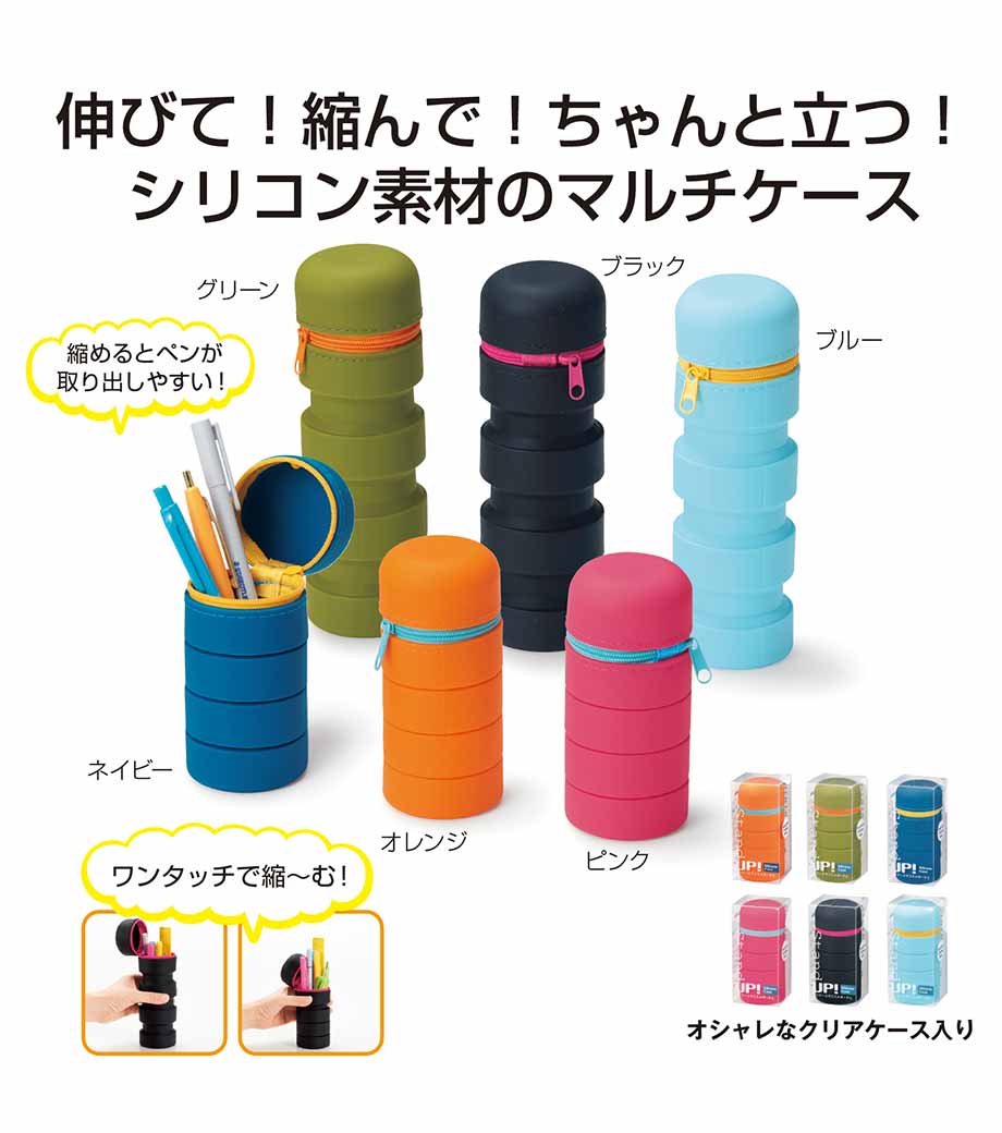 スタンドにもなるシリコンケースは、デスクでペンスタンドのように立てて使えます。