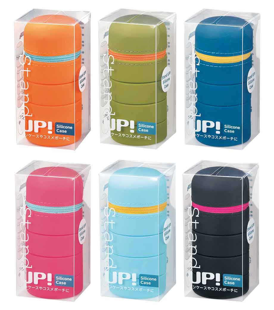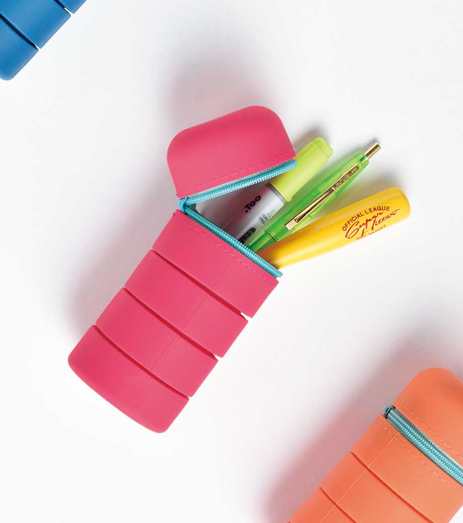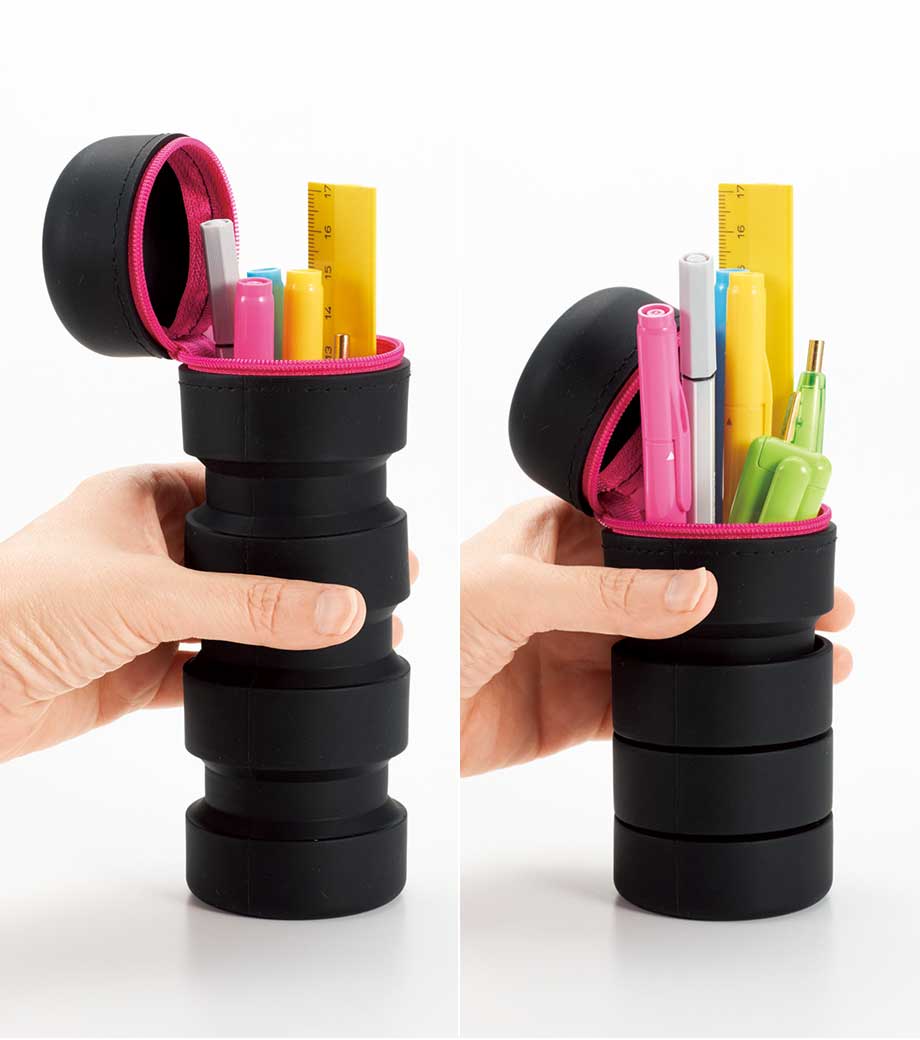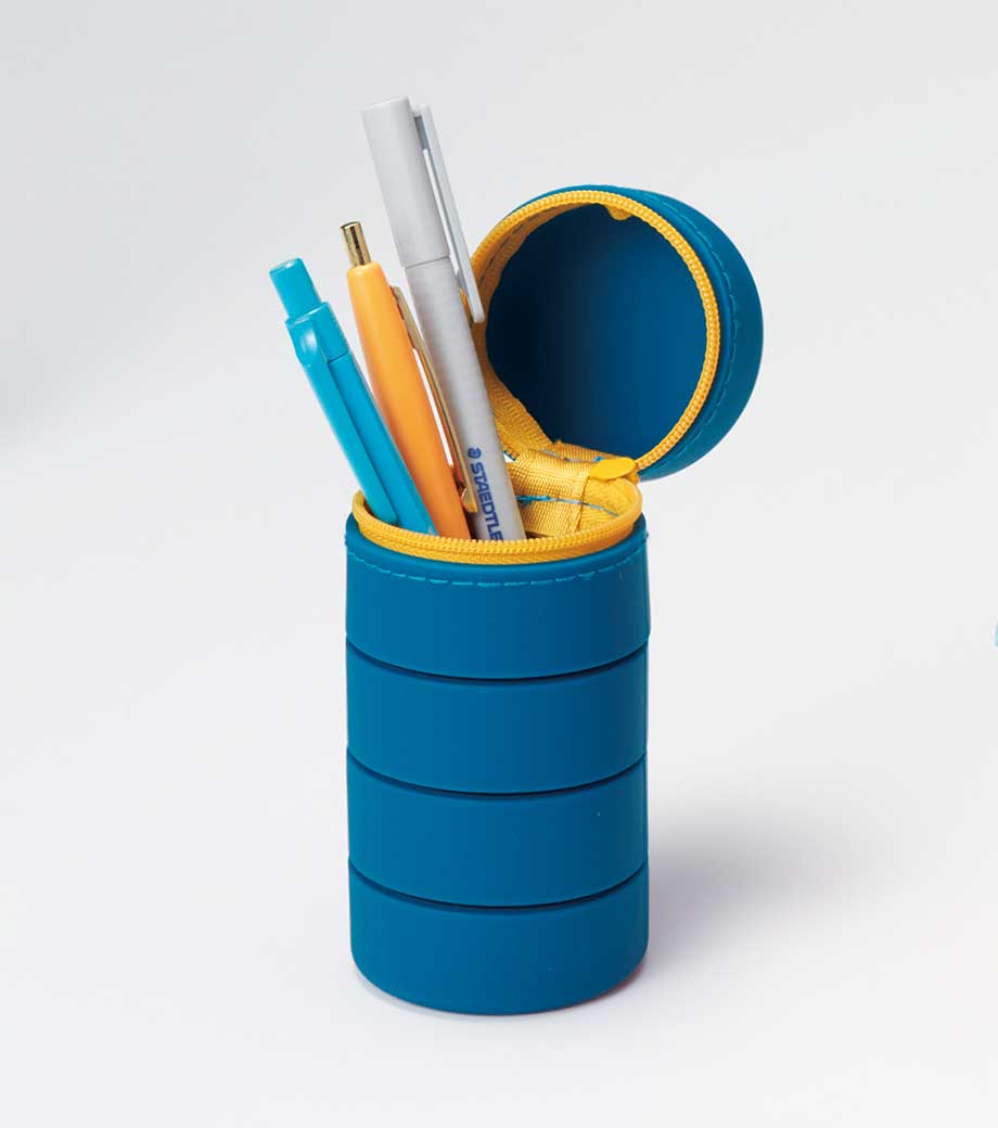 ファスナーを開け、本体を持って軽く下に押し下げればケースが縮み、あっという間にスタンド型に。中身が良く見えるので、使いたい筆記具がすぐに取り出せます。スリムな形で、デスク上でも場所を取りません。軽いので毎日の持ち運びにも重宝しますよ。