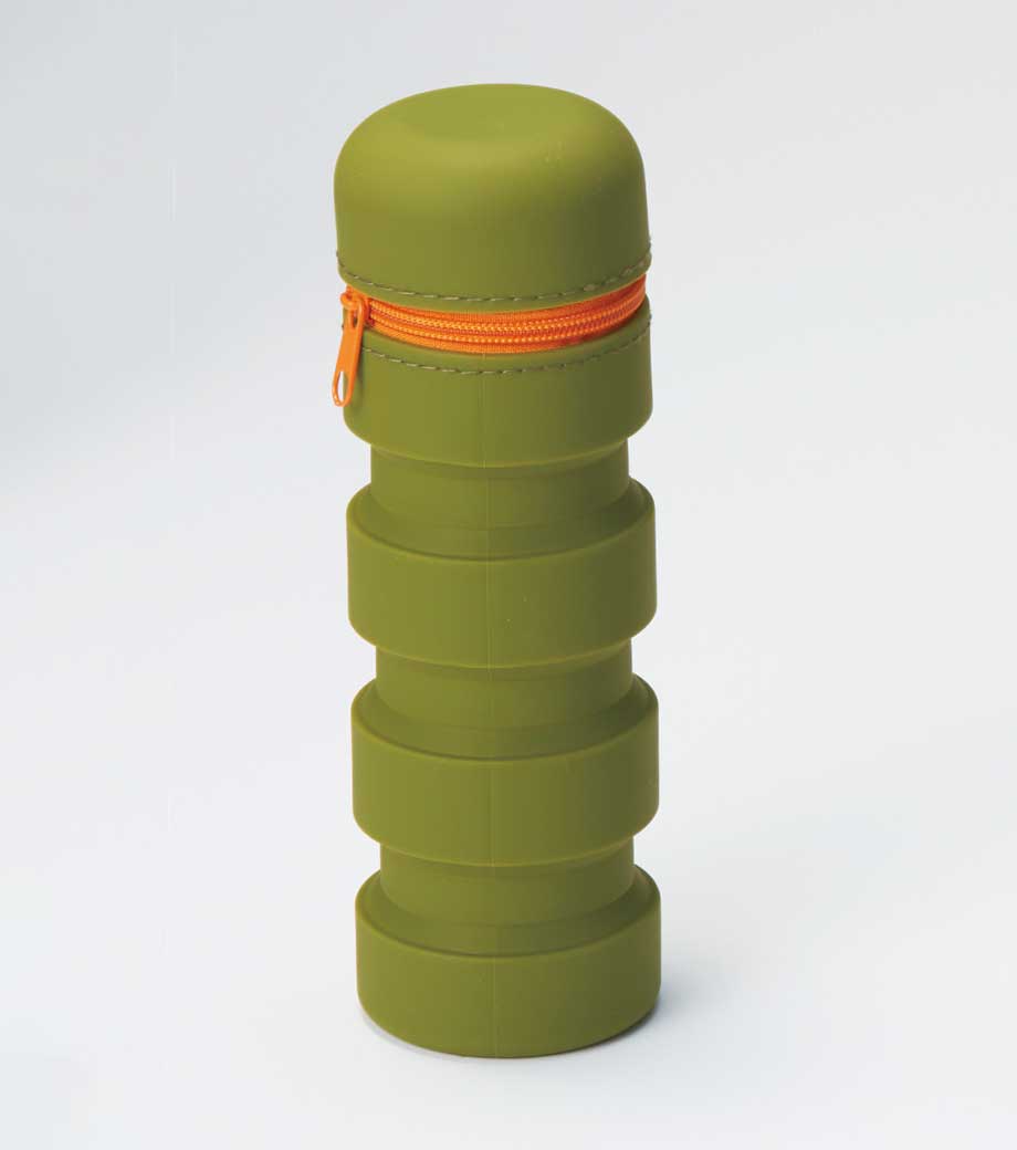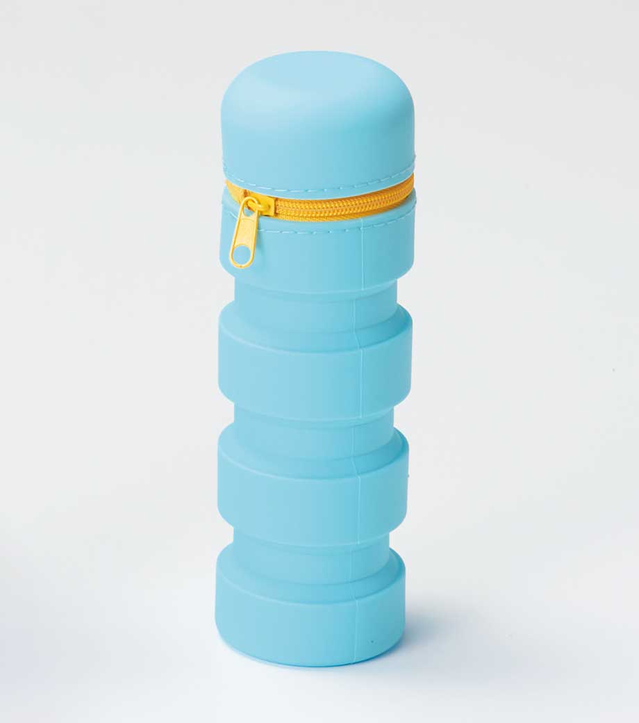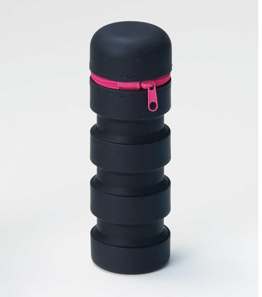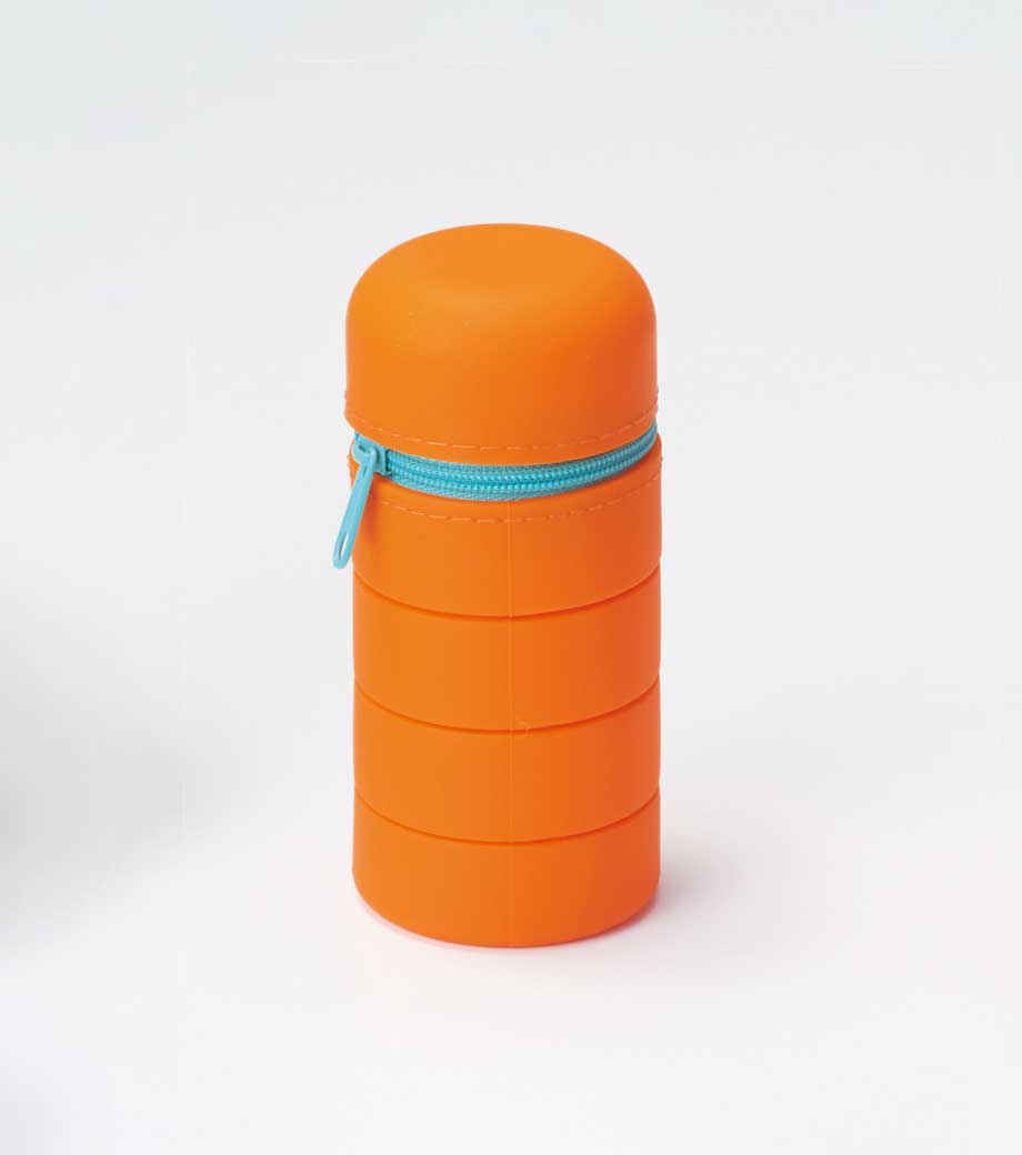 ファスナーを開け、本体を持って軽く下に押し下げればケースが縮み、あっという間にスタンド型に。中身が良く見えるので、使いたい筆記具がすぐに取り出せます。スリムな形で、デスク上でも場所を取りません。軽いので毎日の持ち運びにも重宝しますよ。