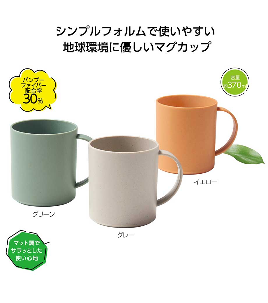 リル バンブーファイバーマグカップはバンブーファイバーを約30%配合したエコ商品です。驚きの低価格で、手軽にSDGsを意識したノベルティが製作できます。プラスチック削減に繋がる素材として大人気のバンブーファイバーは、ナチュラルな素材感も魅力です。くすみカラーと相まっておしゃれな見た目は万人受け間違いなし。軽さと丈夫さを持ち合わせた素材のため、キャンプやピクニックなどアウトドアシーンでも大活躍しますよ。容量は約370mlとコーヒーやお茶をたっぷり飲めるサイズです。