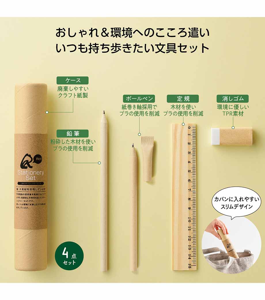 リル ステーショナリーセットは、再生可能素材でつくられた文具セットです。定規や鉛筆は木材、ボールペンやケースは紙でできています。消しゴムも環境にやさしいTPR素材。とことんエコにこだわった素材でできているので、SDGsの啓発運動にぴったりのアイテムです。