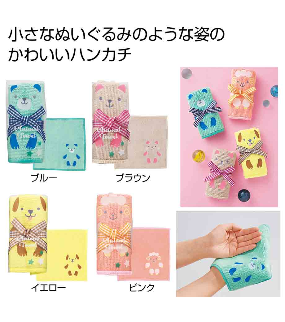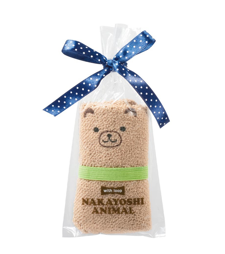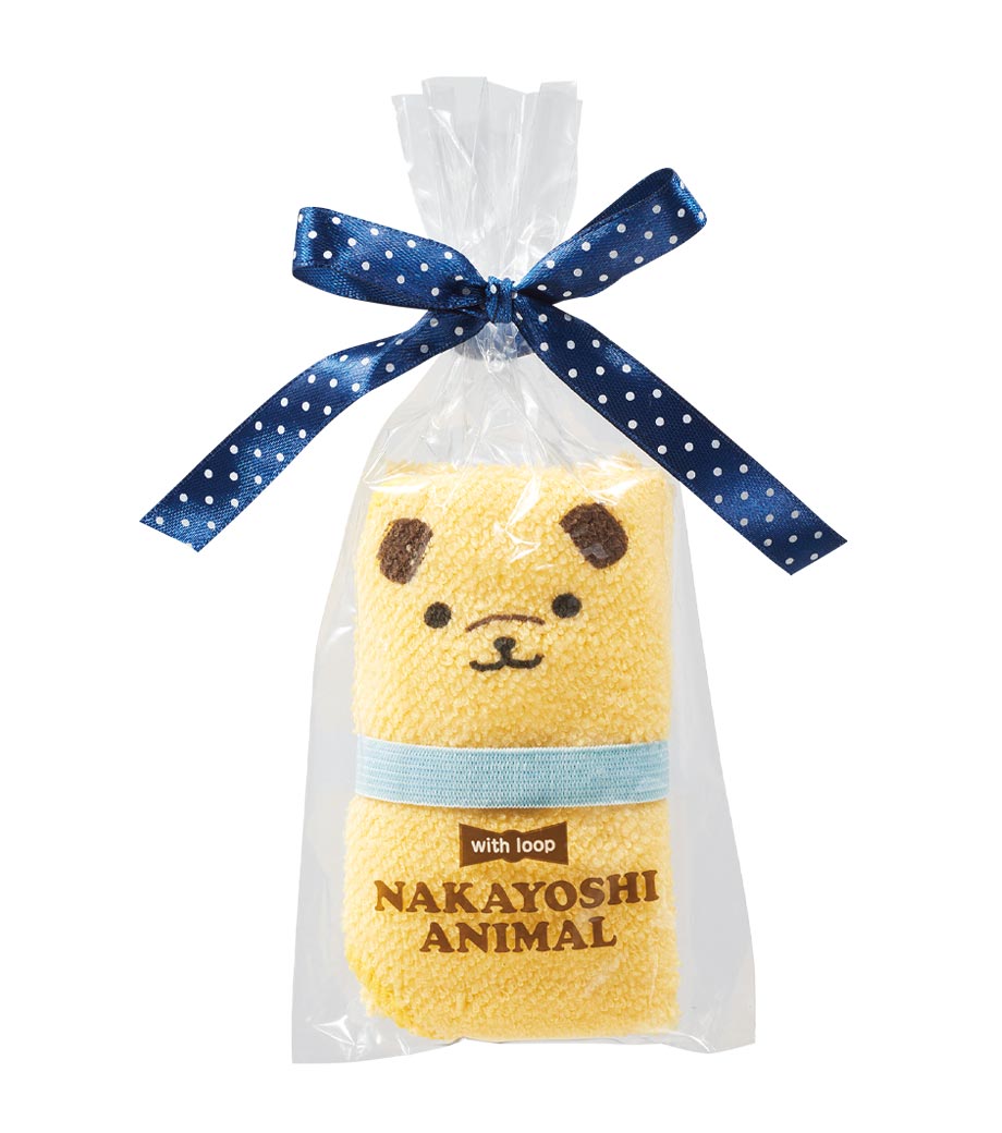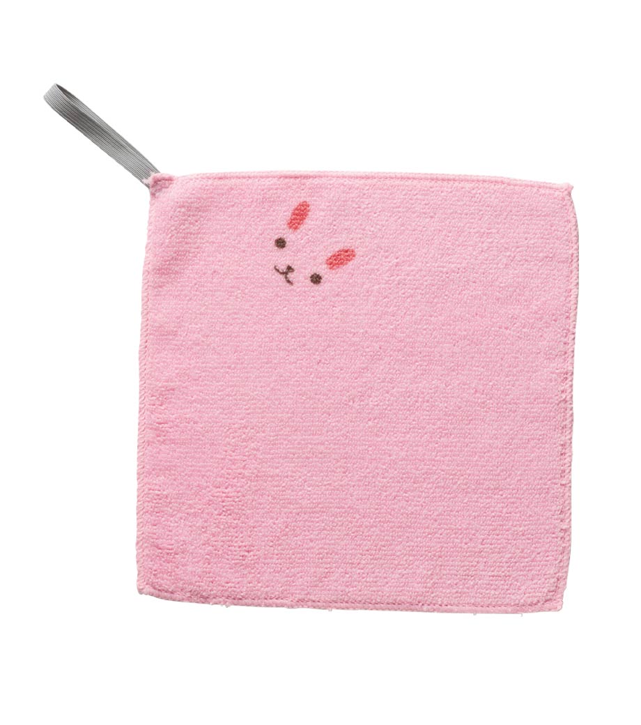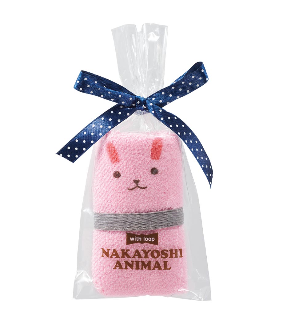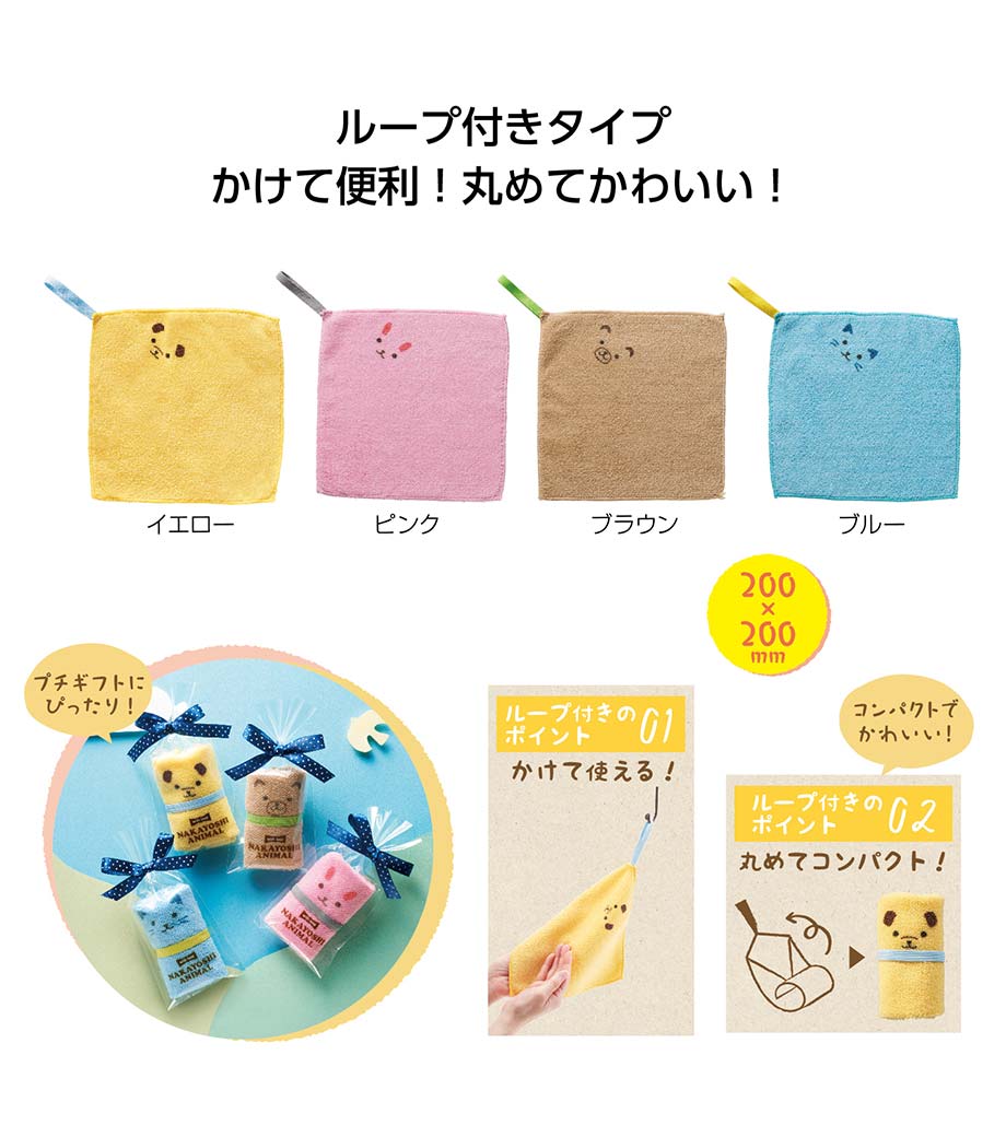 ループ付 なかよしアニマルハンカチタオルはキュートなイヌ・うさぎ・クマ・ねこの4種類を取混ぜでお届け。ループはゴム仕様なので洗面所に引っ掛けて使用したり、ハンカチをコンパクトにたたんで留めることもできます。