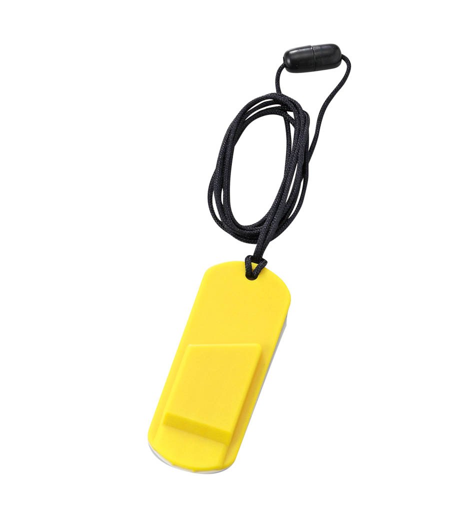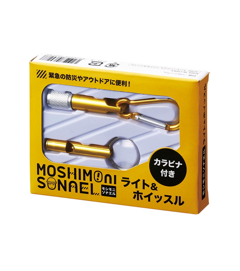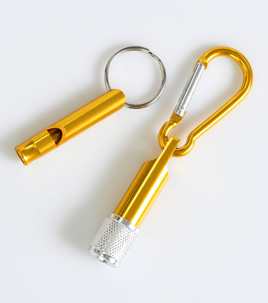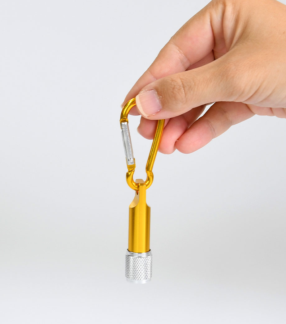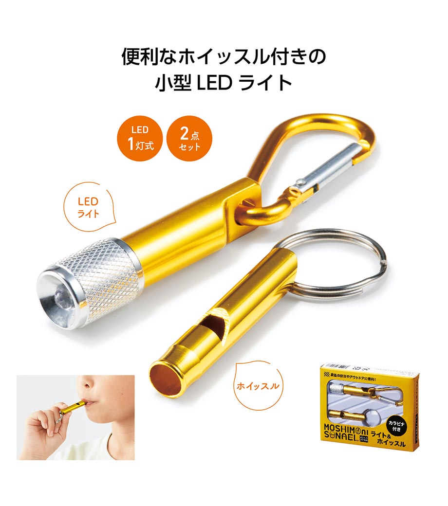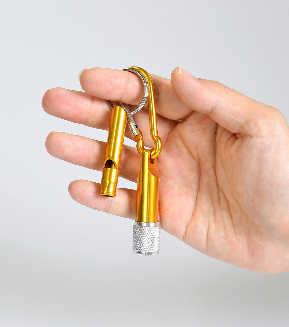 本体色はシルバーとイエローの2色。名入れは1色印刷に対応しています。アウトドアやスポーツ用品店のノベルティ、防犯・交通安全のセミナーや夜のイベント配布にいかがでしょうか。