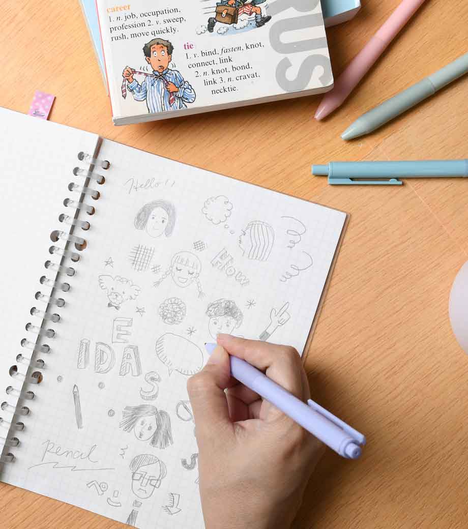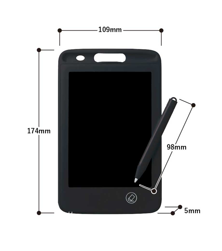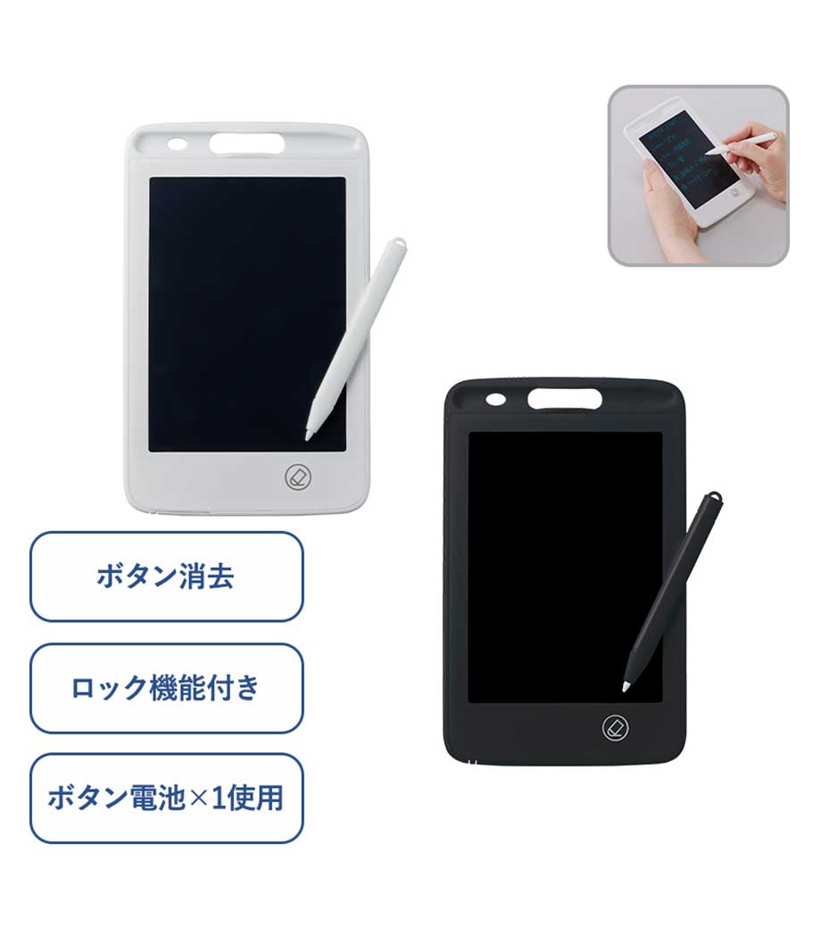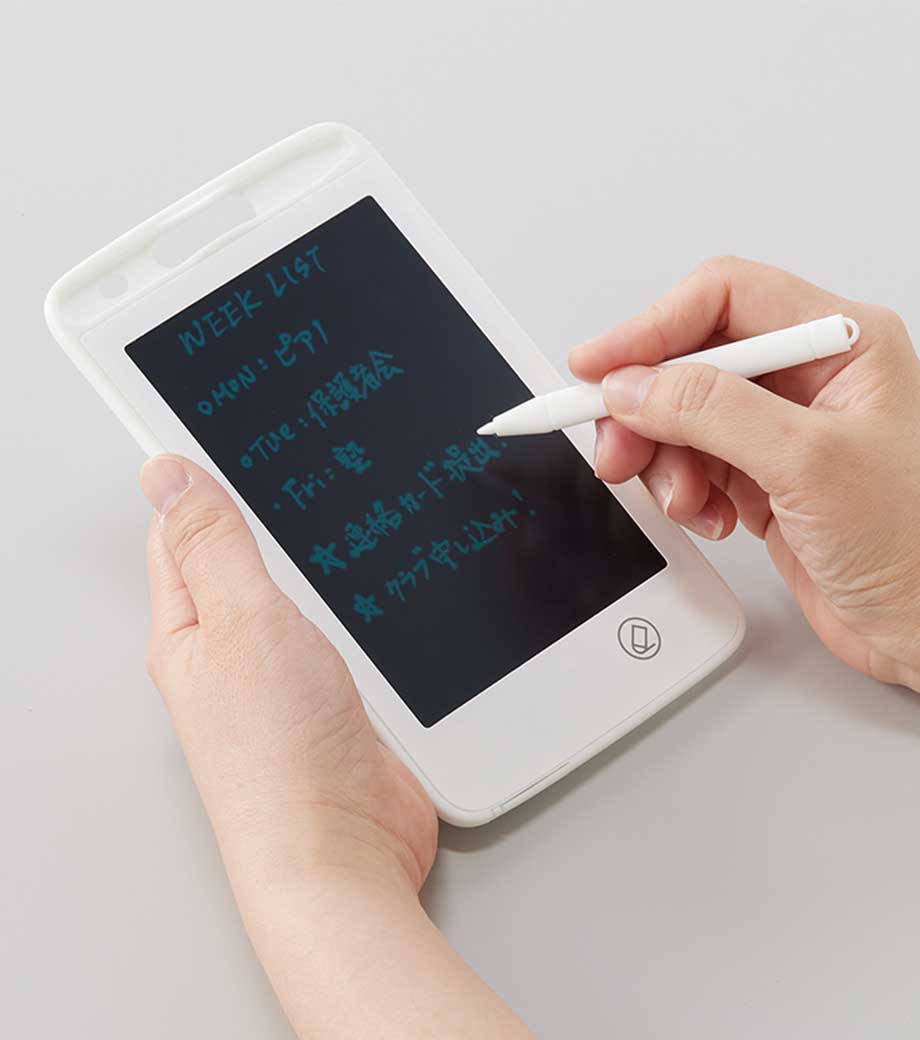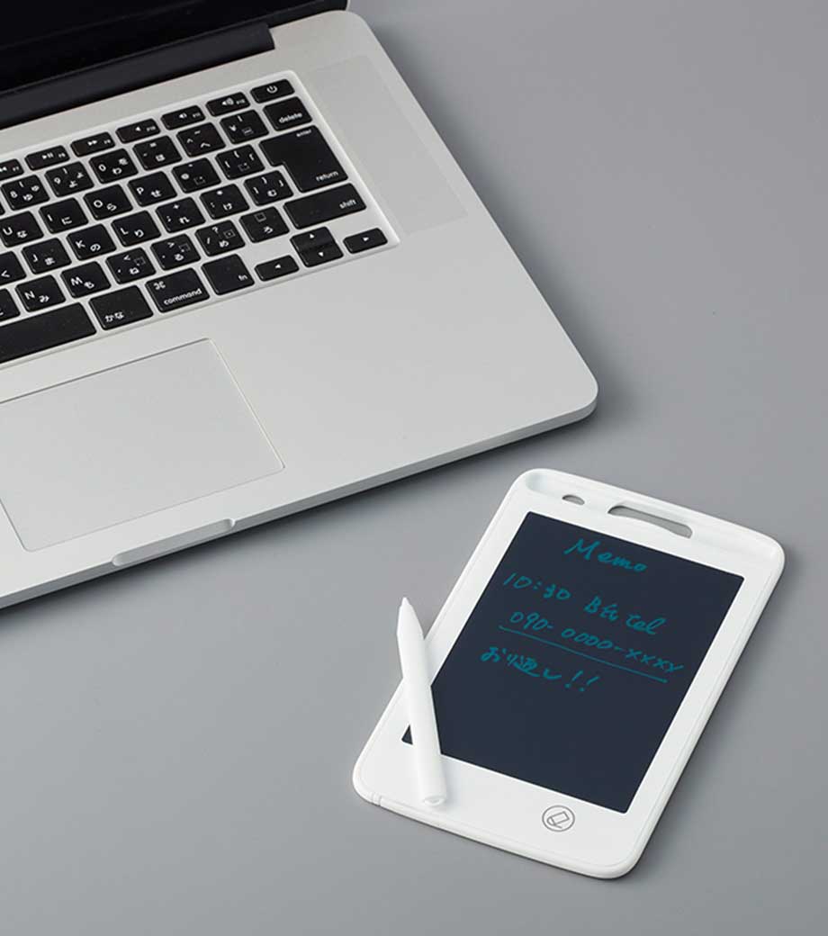 電子メモ 6.5インチは、「書いて消す」を何度も繰り返すことができる電子メモです。書いたメモはパッド下部の消しゴムマークを押せば、瞬時に消せます。また、裏面のロックボタンをスライドすると、残したいメモや文章をキープすることができる優れもの。新書本ほどのサイズ感で5mmという薄さ!リモートワークや会社のデスクに置いても邪魔にならず、メモしたいときにすぐ書き留めることができ、タスク管理にも便利です。