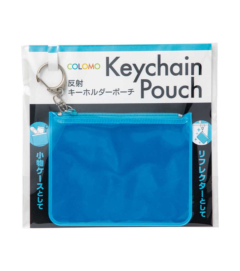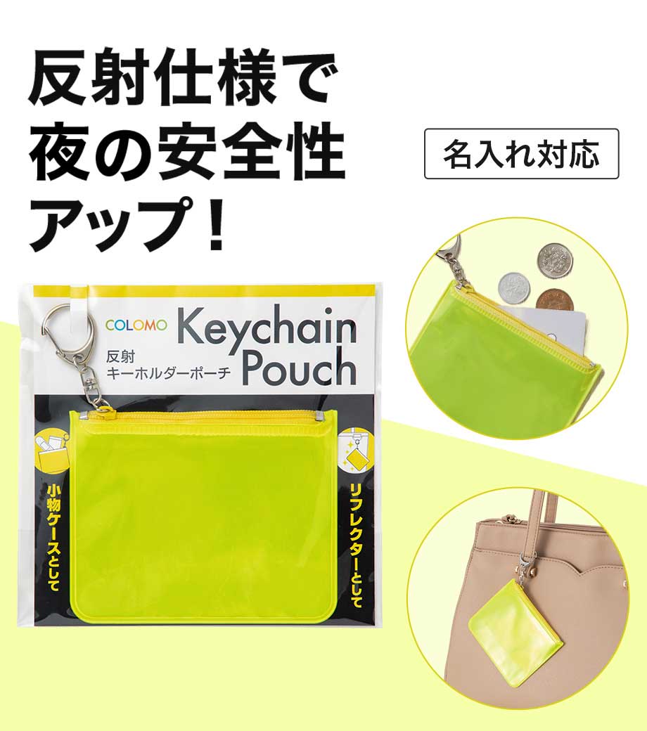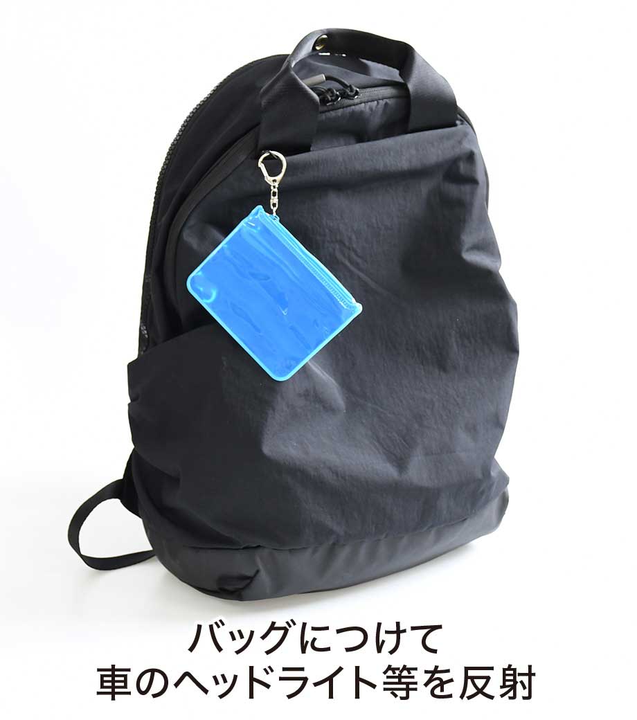反射仕様のミニポーチ。車のヘッドライトや街灯の光を反射してキラキラ光り、歩行者の存在をアピールします。夜間や荒天時の外出時に交通安全グッズとして活躍します。小銭や鍵等のちょっとした小物の収納に便利なサイズ感。フック付きのキーホルダータイプなので、バッグやベルトループなど、さまざまな場所に簡単に取り付けられます。